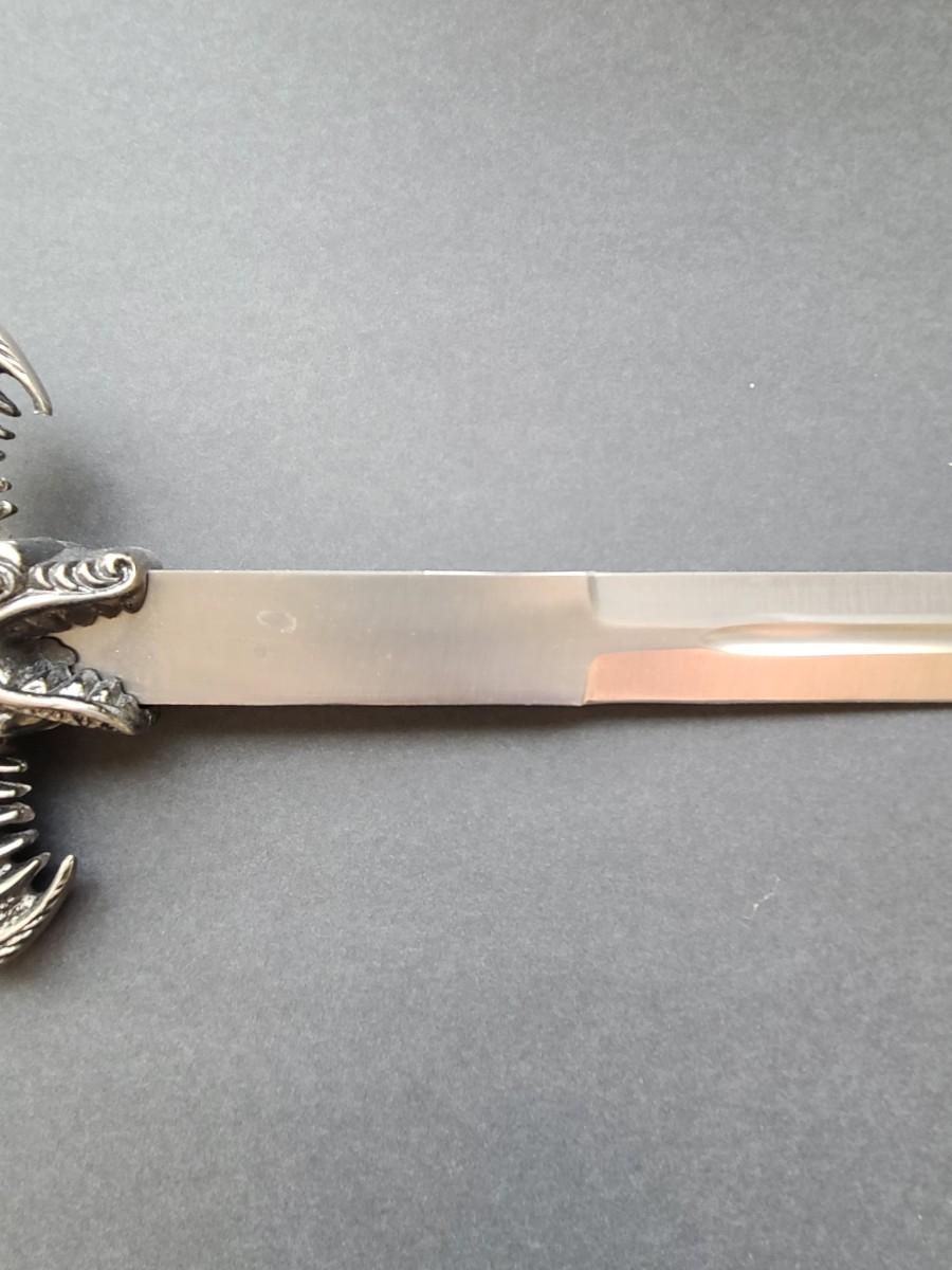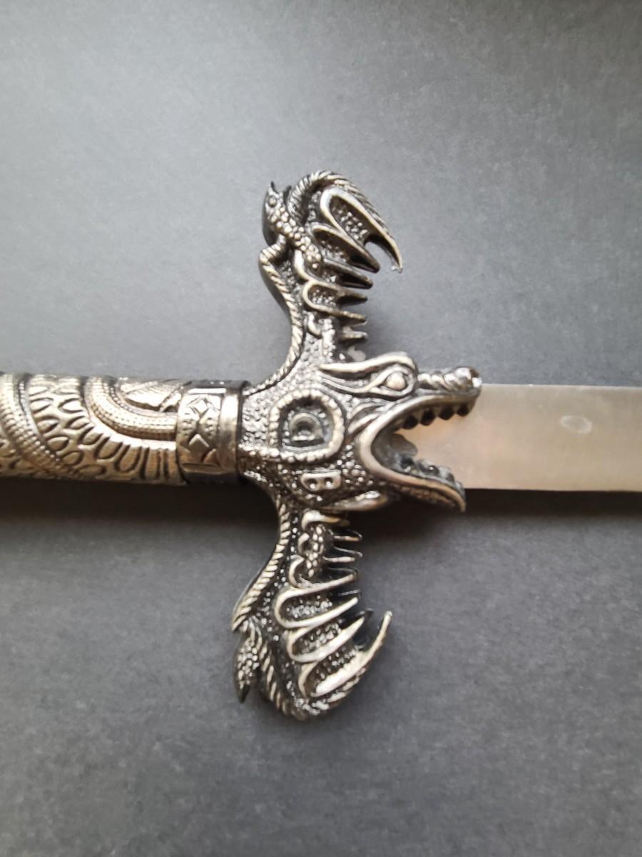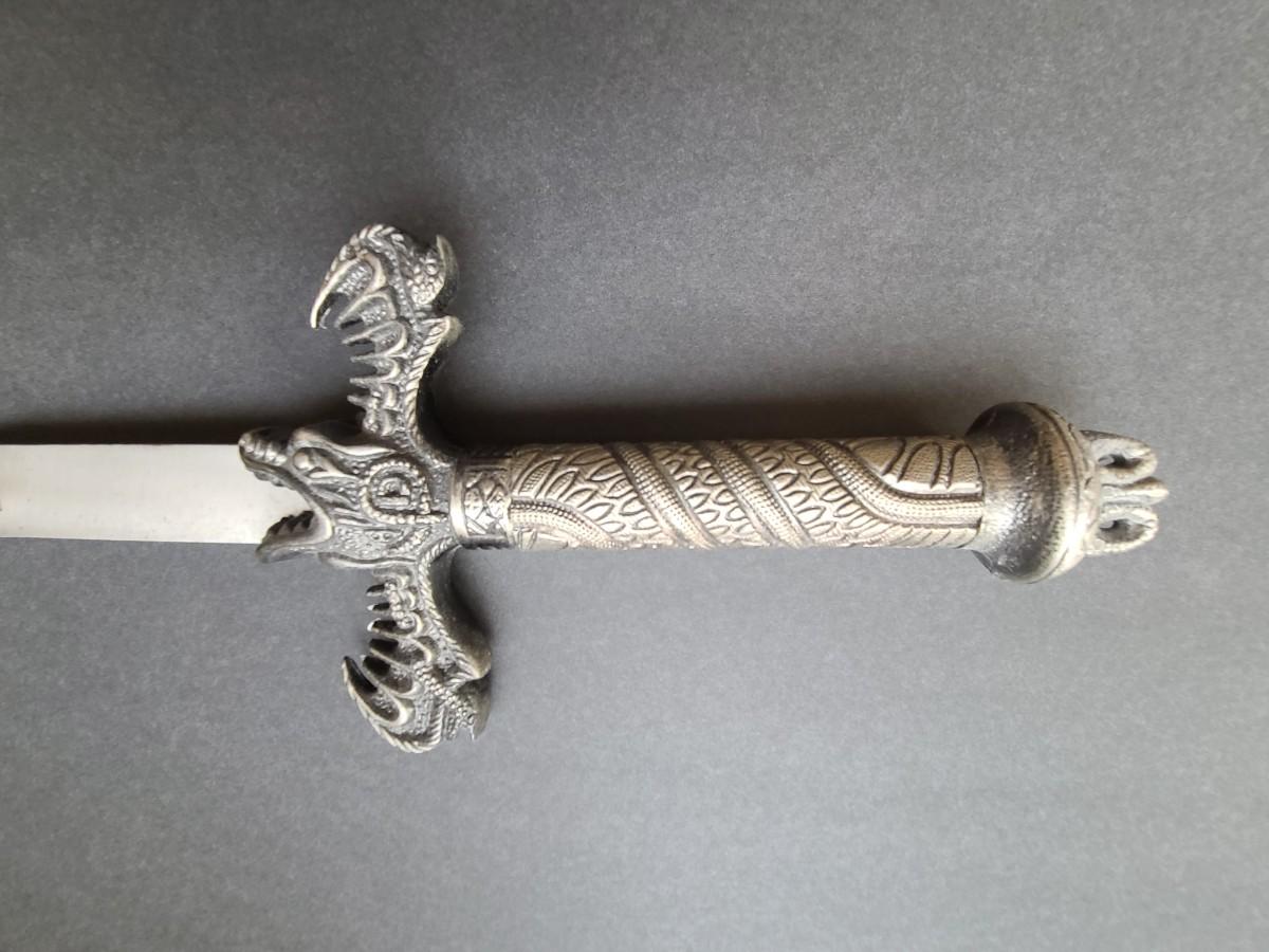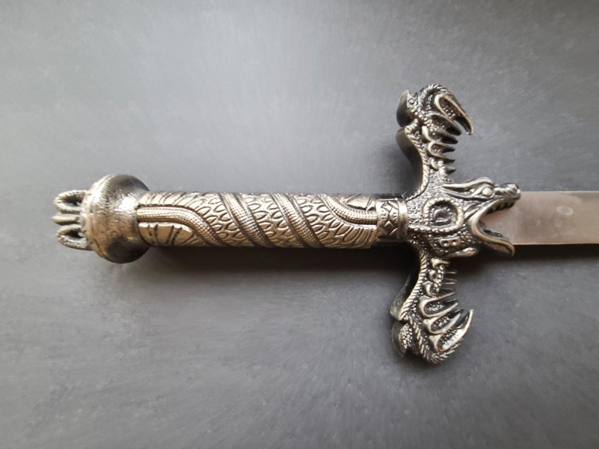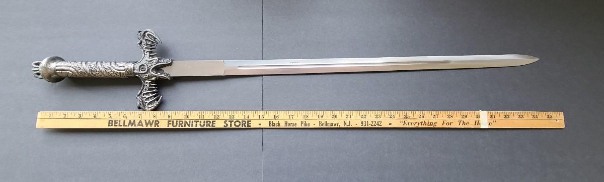 This replica sword is made to look like a winged sword-breathing dragon. The decorative wings are the guard, and the pommel is a knights crown. Has weight to it. Please see all pictures as they are the best representation of the items. The pictures show condition, measurements if taken, and what is included in the lot. Due to the large amount that we photograph and the time frame, we are not always able to take measurements. All items unless noted, are pre-owned and have been used. If you purchased furniture, you must bring help. We do not allow one person to carry large furniture out on their own. Bring help, tools and a truck for the safety of our client’s homes, and your personal safety. Any damages that result to the property including walls, and floors due to moving of the furniture will be charged to the buyer. Company policy. Thank you.