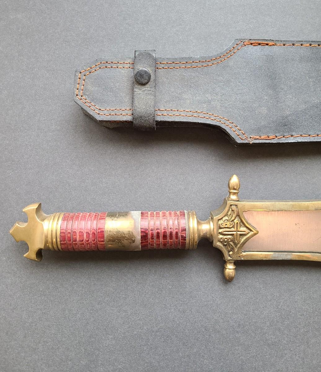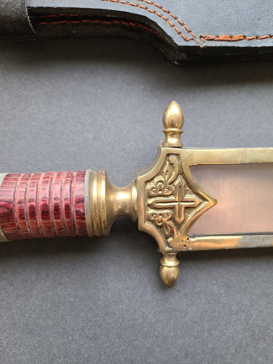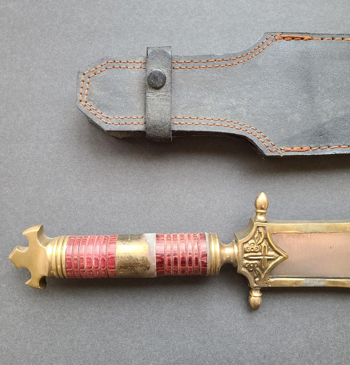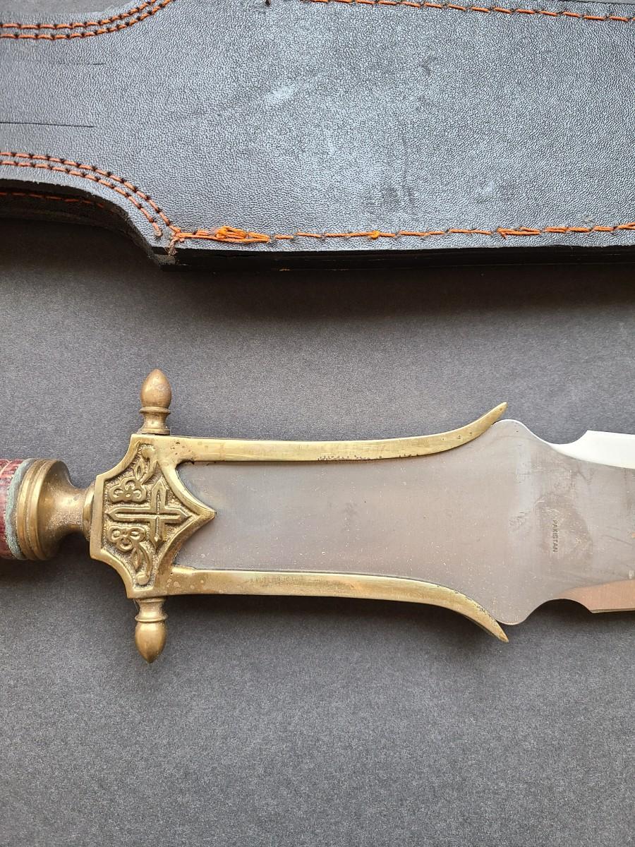 LOT 40: Stainless Steel Short Blade Sword Made in Pakistan (Brass & Wood, Cross Emblem)