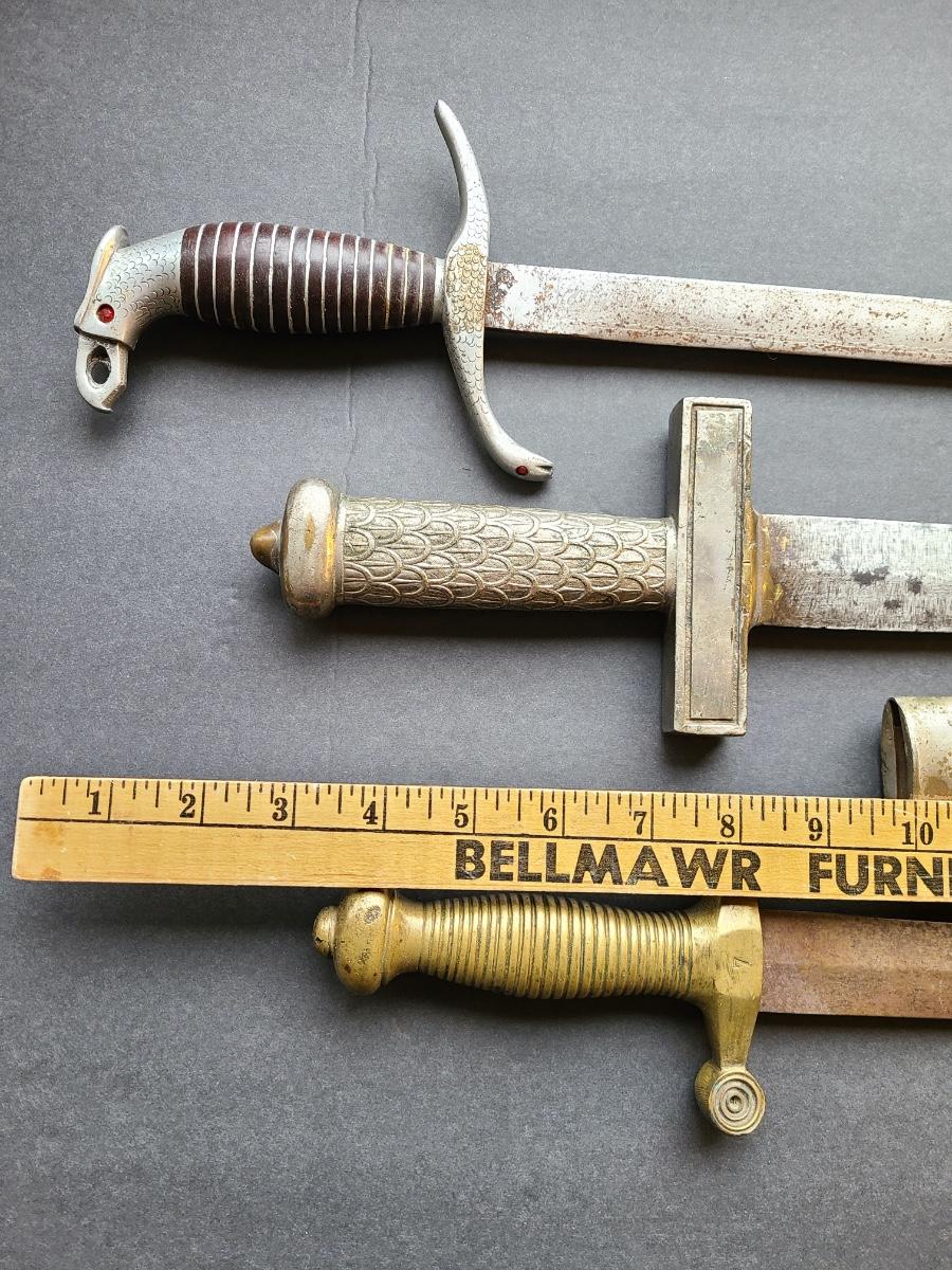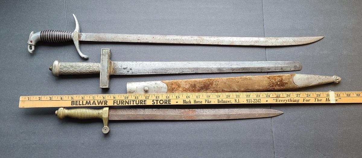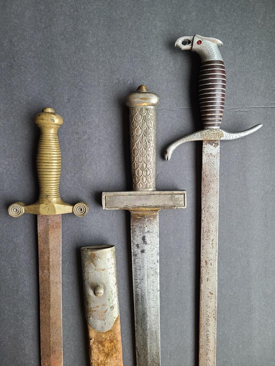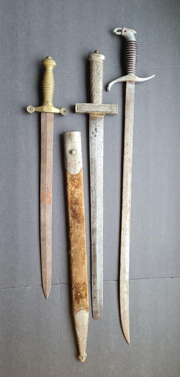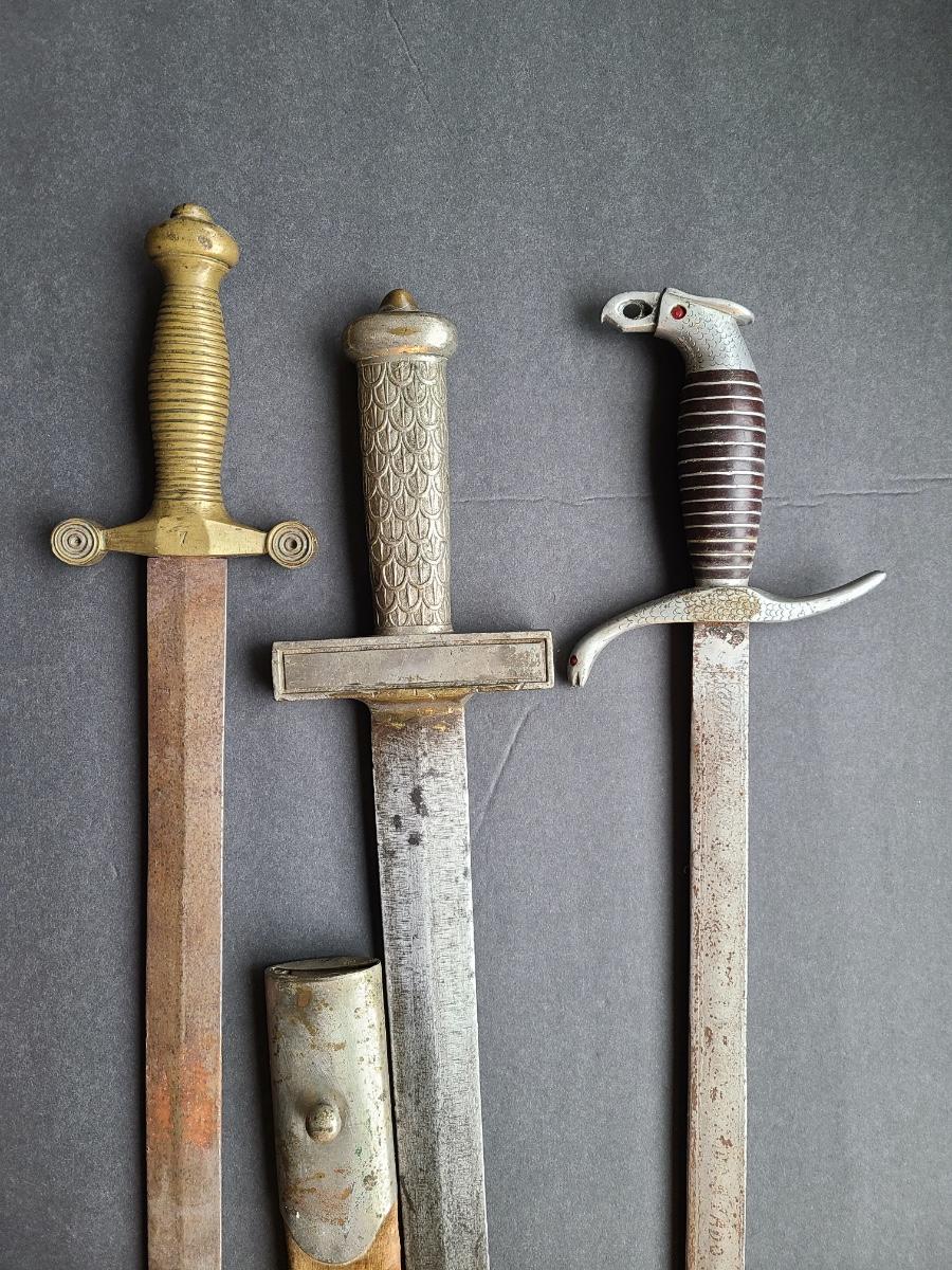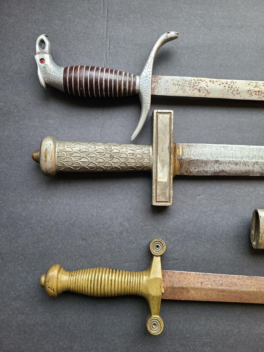 This lot is for three swords, one looks to have a brass guard with a 7 on it and is thought to be a French Foot Artillery Sword, the other with the Eagle head pommel has red eyes, a snake guard and spanish script down the blade. The other has no markings and looks to be one piece. Please see all pictures as they are the best representation of the items. The pictures show condition, measurements if taken, and what is included in the lot. Due to the large amount that we photograph and the time frame, we are not always able to take measurements. All items unless noted, are pre-owned and have been used. If you purchased furniture, you must bring help. We do not allow one person to carry large furniture out on their own. Bring help, tools and a truck for the safety of our client’s homes, and your personal safety. Any damages that result to the property including walls, and floors due to moving of the furniture will be charged to the buyer. Company policy. Thank you.