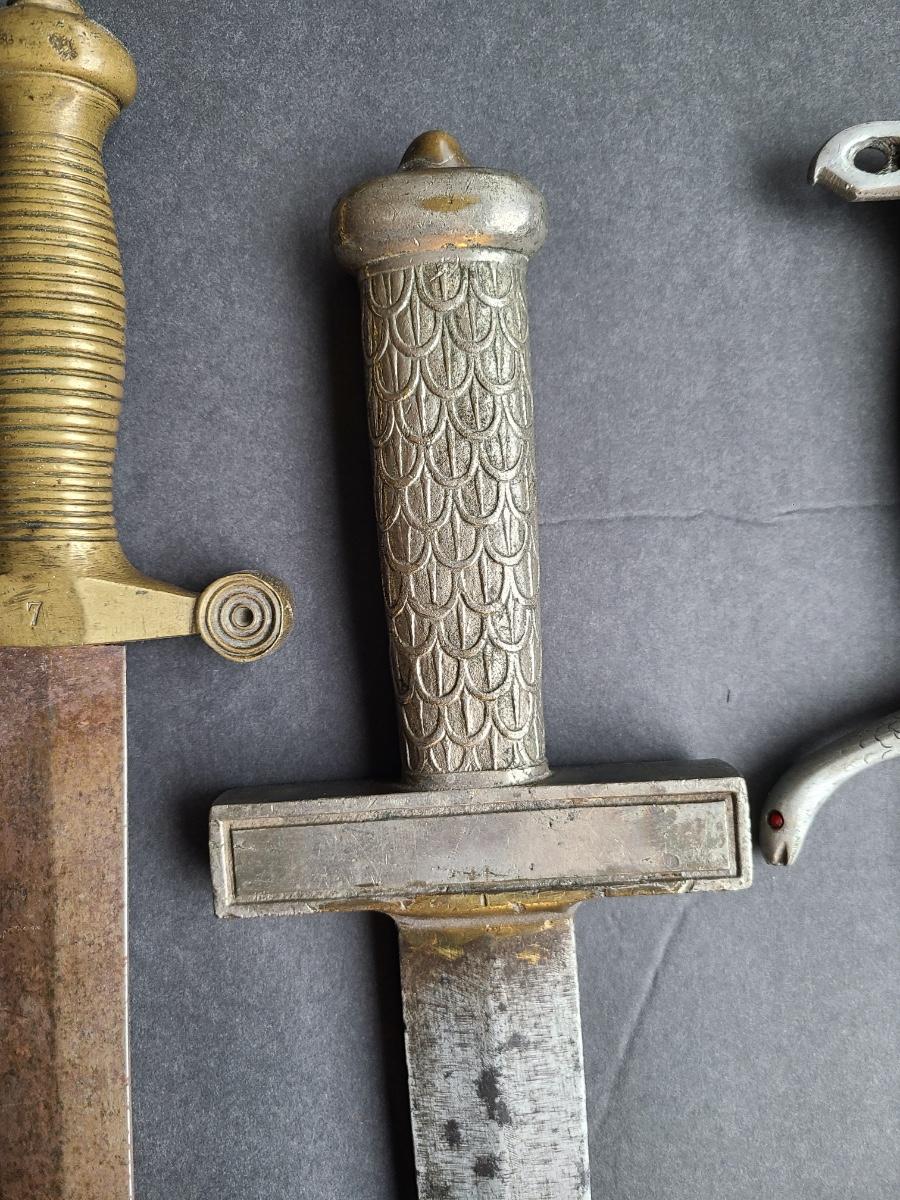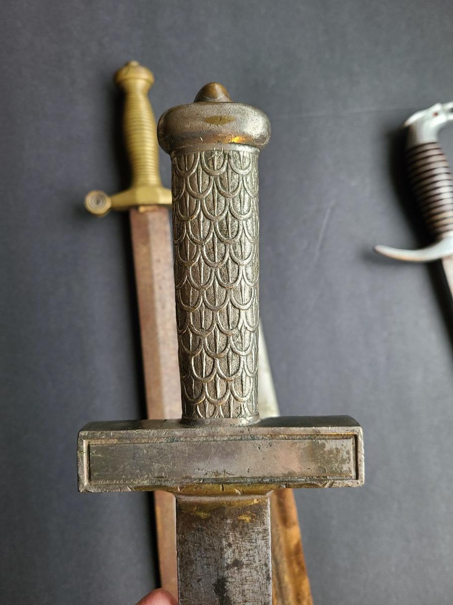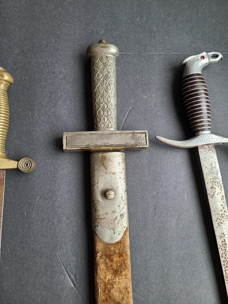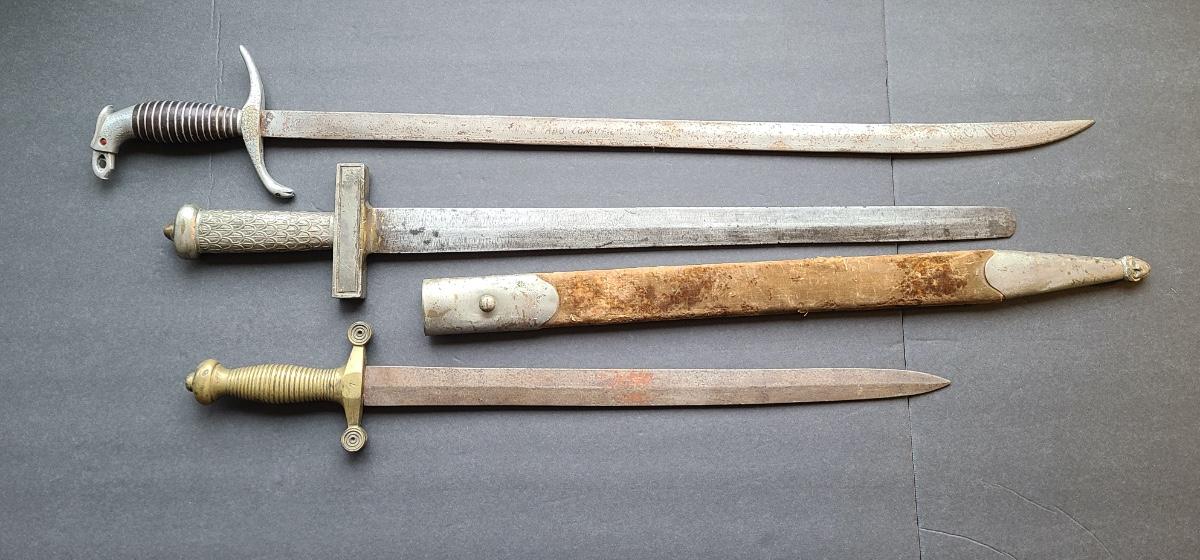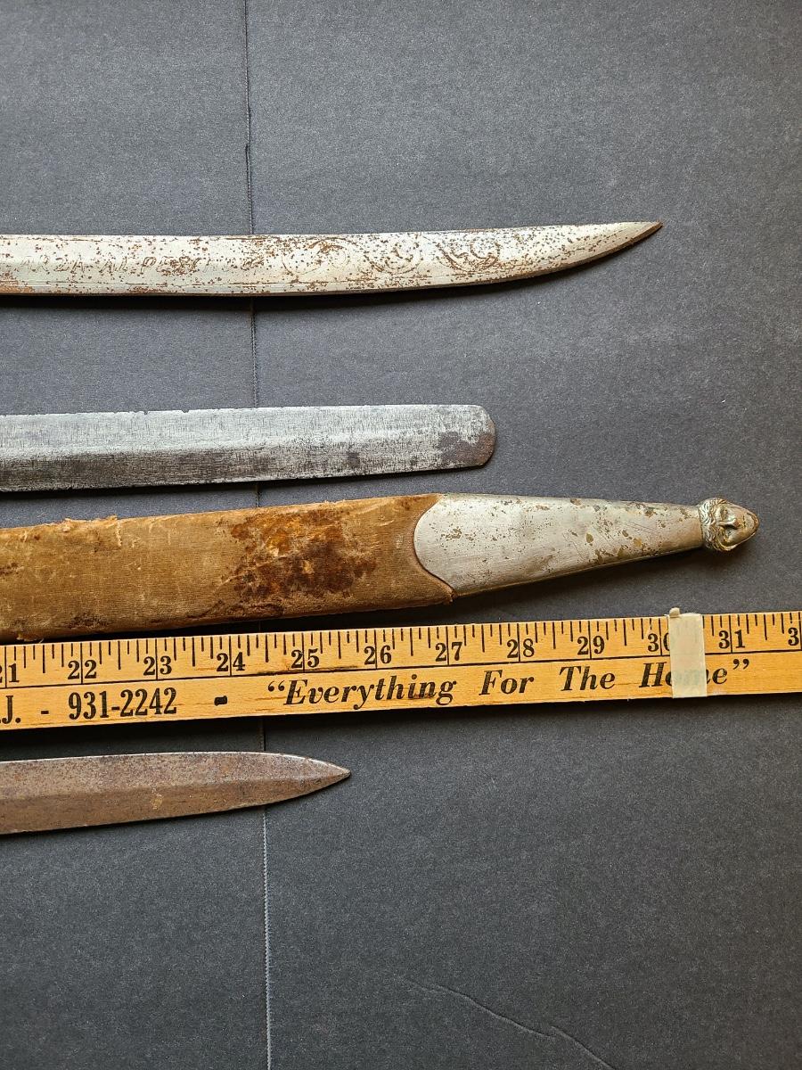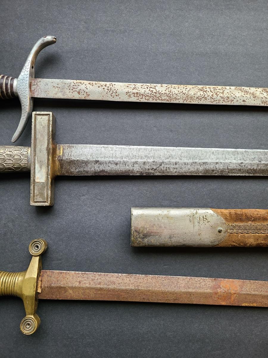 This lot is for three swords, one looks to have a brass guard with a 7 on it and is thought to be a French Foot Artillery Sword, the other with the Eagle head pommel has red eyes, a snake guard and spanish script down the blade. The other has no markings and looks to be one piece. Please see all pictures as they are the best representation of the items. The pictures show condition, measurements if taken, and what is included in the lot. Due to the large amount that we photograph and the time frame, we are not always able to take measurements. All items unless noted, are pre-owned and have been used. If you purchased furniture, you must bring help. We do not allow one person to carry large furniture out on their own. Bring help, tools and a truck for the safety of our client’s homes, and your personal safety. Any damages that result to the property including walls, and floors due to moving of the furniture will be charged to the buyer. Company policy. Thank you.