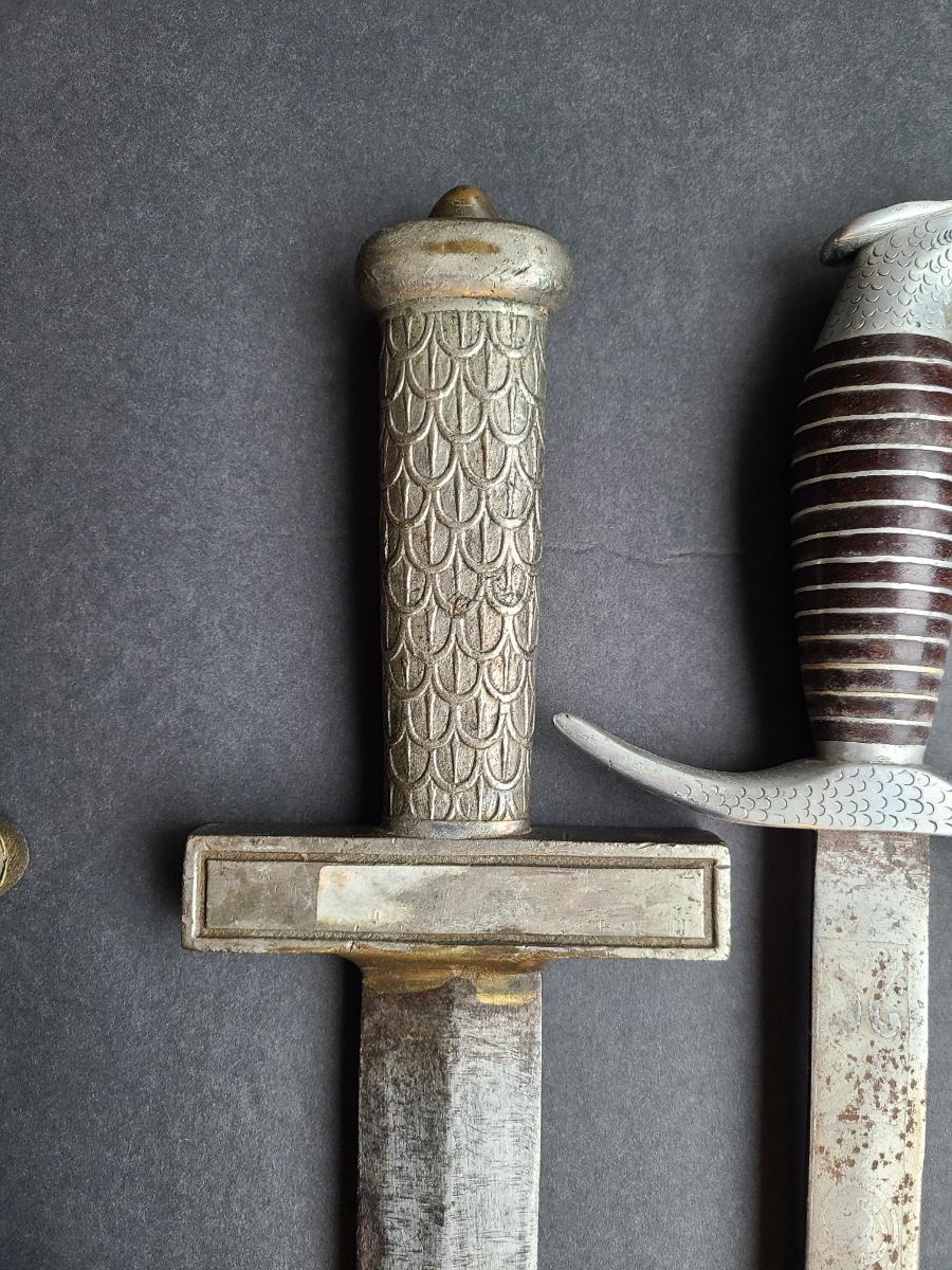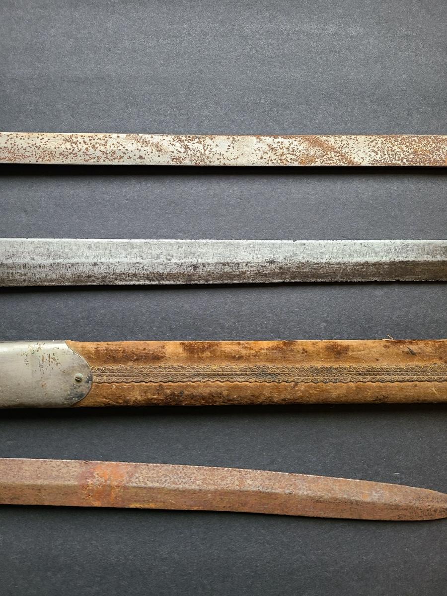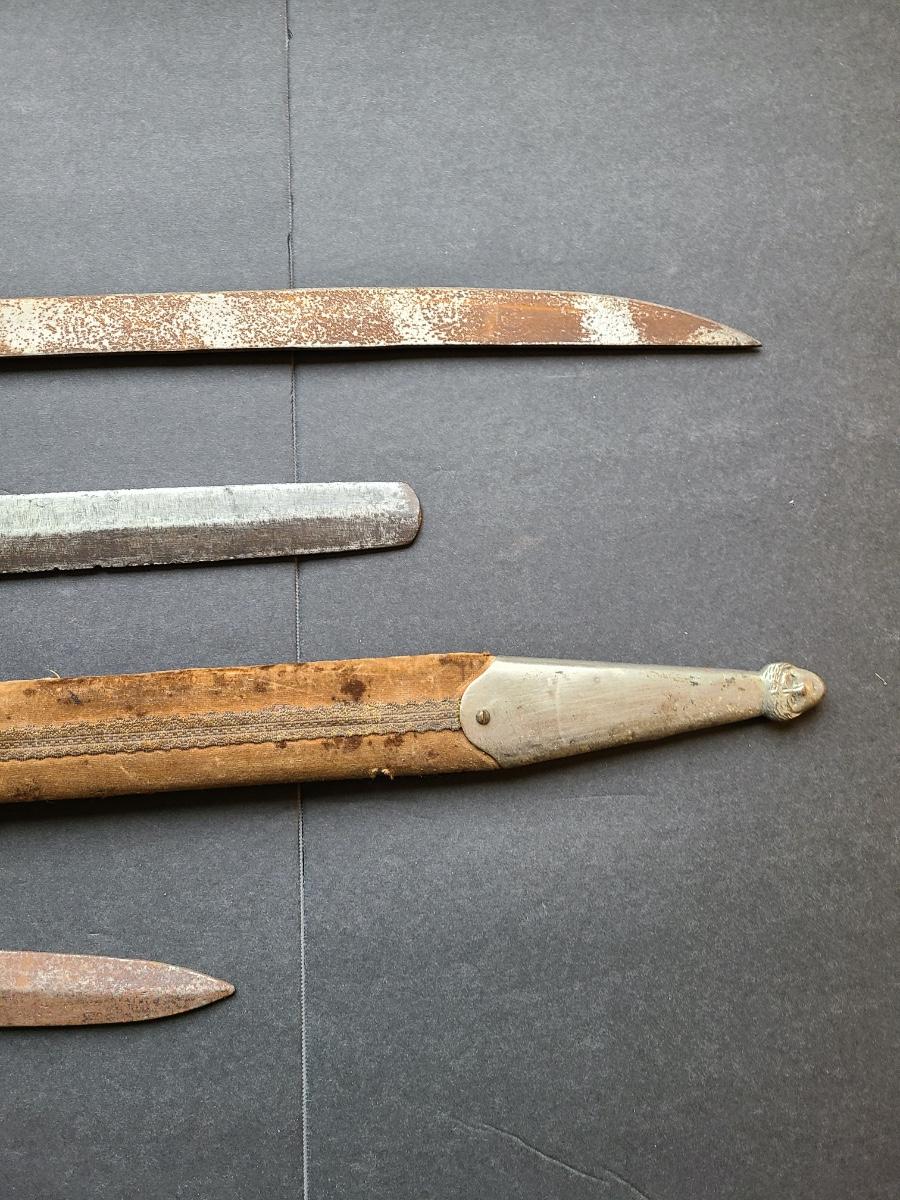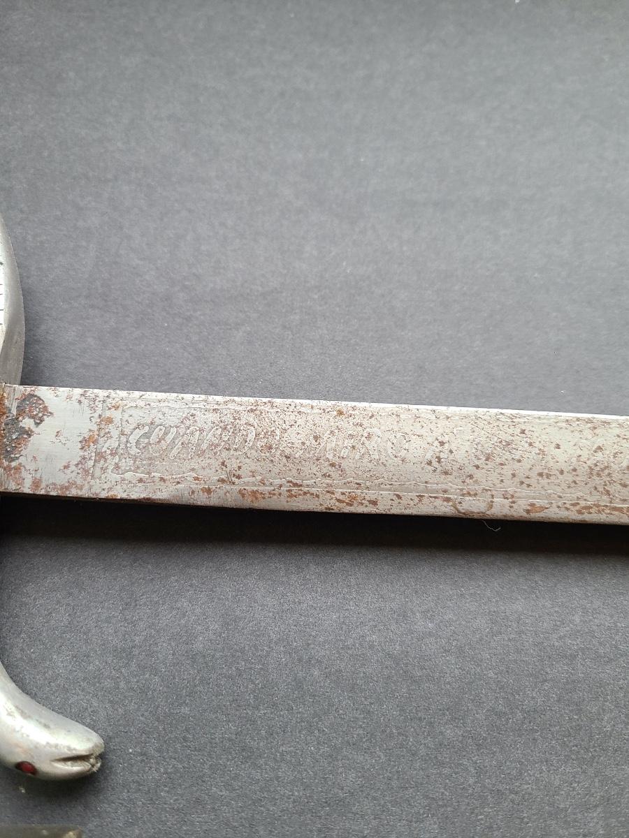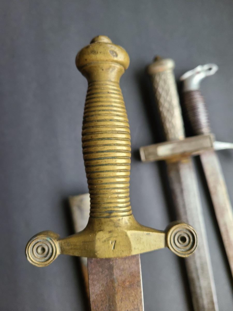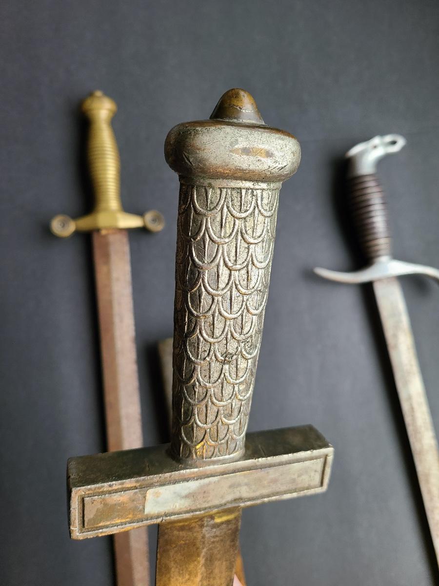 This lot is for three swords, one looks to have a brass guard with a 7 on it and is thought to be a French Foot Artillery Sword, the other with the Eagle head pommel has red eyes, a snake guard and spanish script down the blade. The other has no markings and looks to be one piece. Please see all pictures as they are the best representation of the items. The pictures show condition, measurements if taken, and what is included in the lot. Due to the large amount that we photograph and the time frame, we are not always able to take measurements. All items unless noted, are pre-owned and have been used. If you purchased furniture, you must bring help. We do not allow one person to carry large furniture out on their own. Bring help, tools and a truck for the safety of our client’s homes, and your personal safety. Any damages that result to the property including walls, and floors due to moving of the furniture will be charged to the buyer. Company policy. Thank you.
