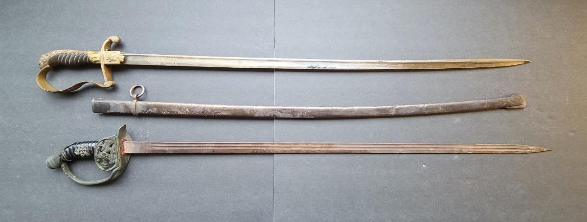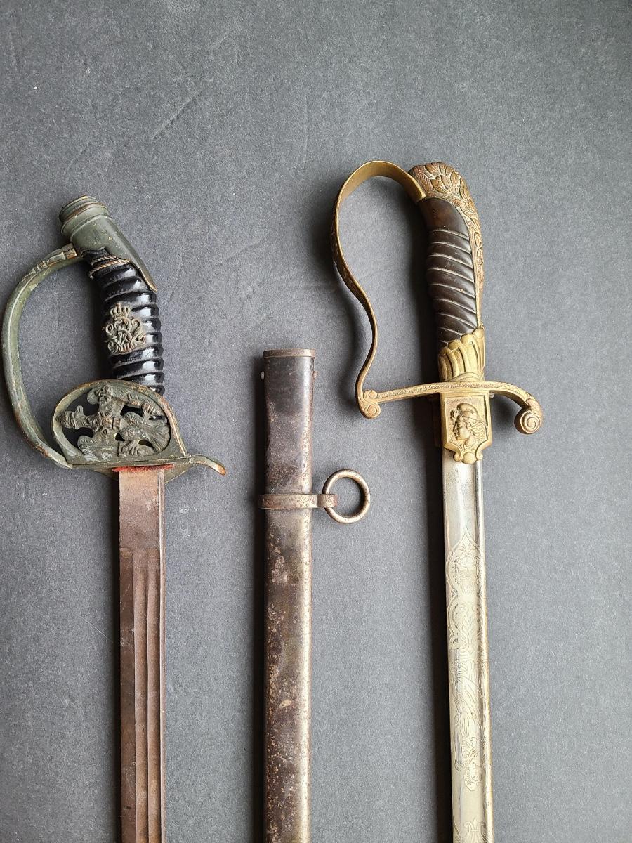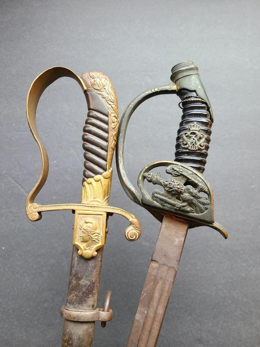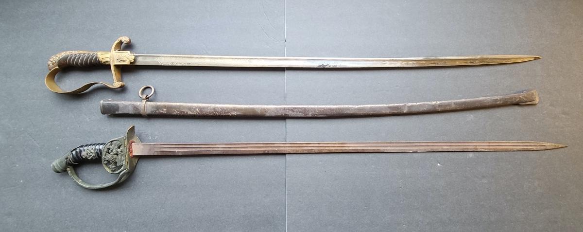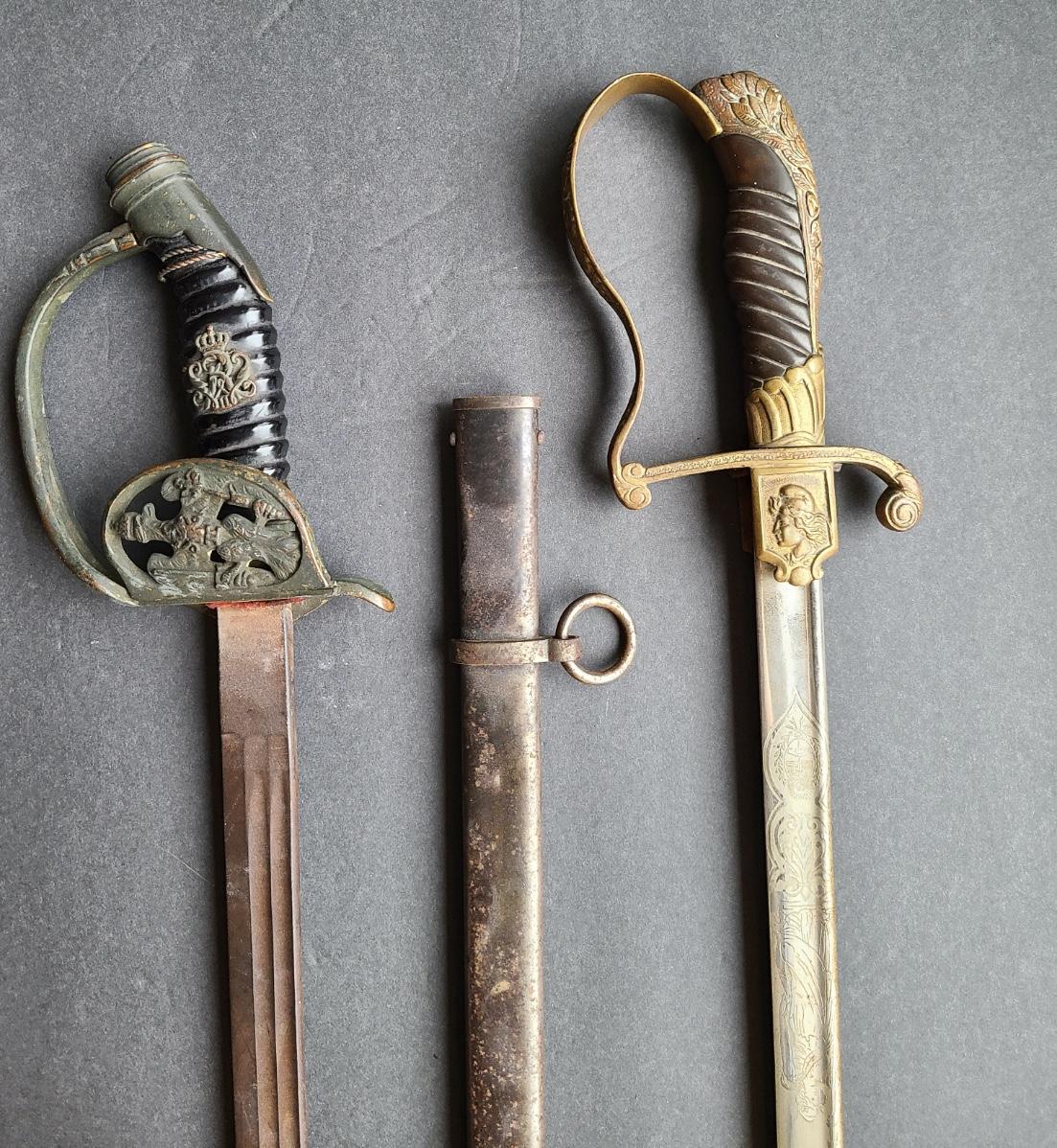 One sword is has the Sean Eternal Los Laurels which is "may the laurels be eternal" which is part of the national anthem, it also ha s the Clemen & Jung Forge Stamp. The other has the Nicholas II Griffin on the guard. Please see all pictures as they are the best representation of the items. The pictures show condition, measurements if taken, and what is included in the lot. Due to the large amount that we photograph and the time frame, we are not always able to take measurements. All items unless noted, are pre-owned and have been used. If you purchased furniture, you must bring help. We do not allow one person to carry large furniture out on their own. Bring help, tools and a truck for the safety of our client’s homes, and your personal safety. Any damages that result to the property including walls, and floors due to moving of the furniture will be charged to the buyer. Company policy. Thank you.