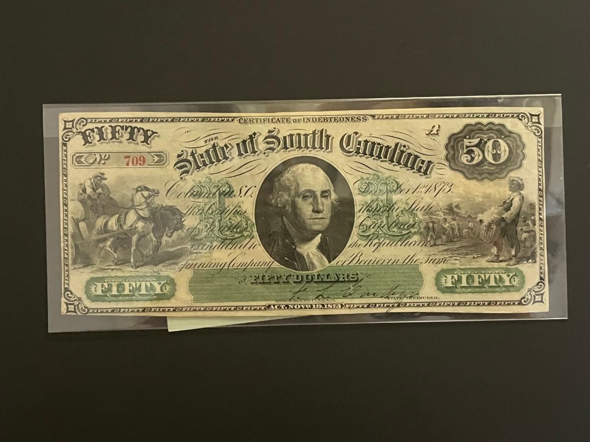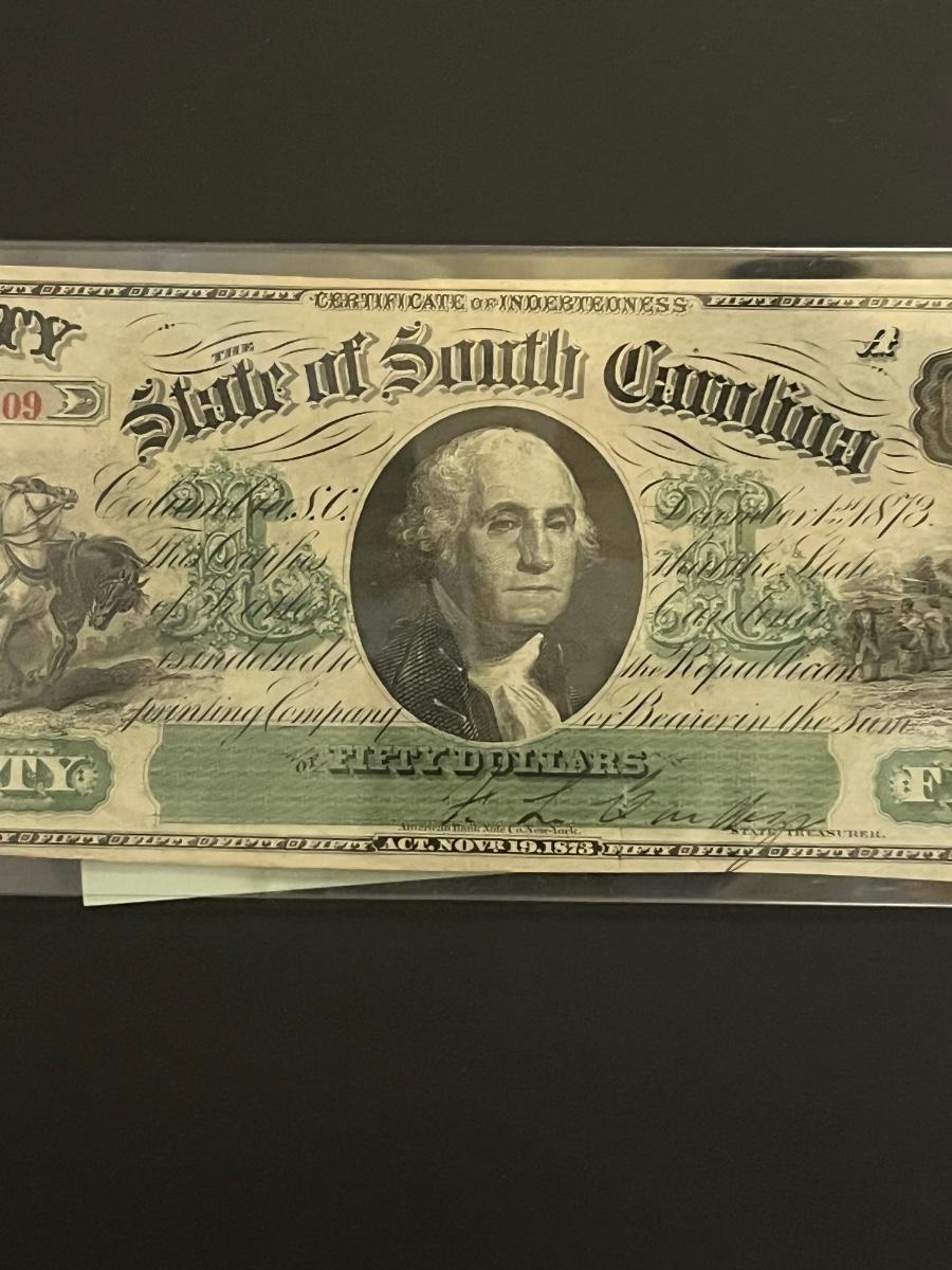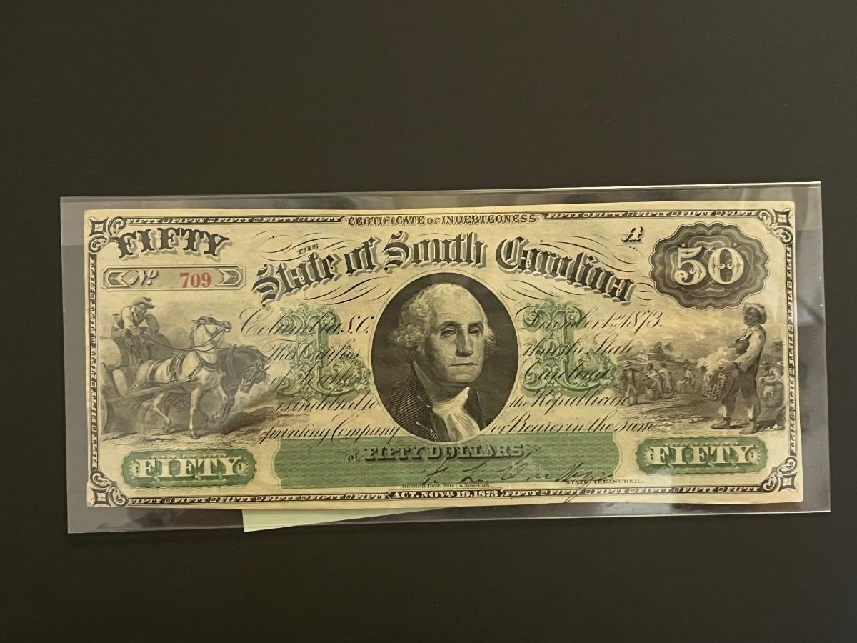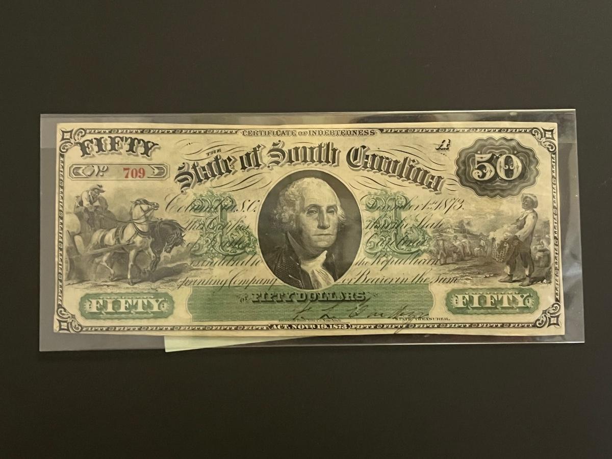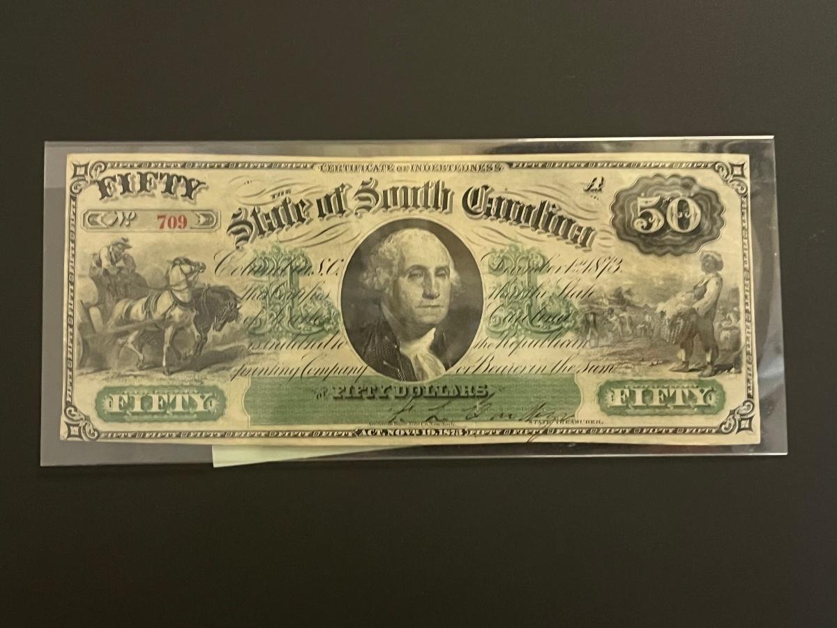 LOT 73C: 1873 State of South Carolina $50 Note Cancelled Certificate