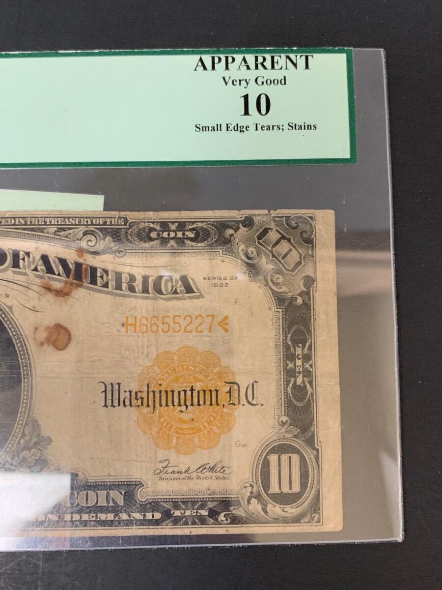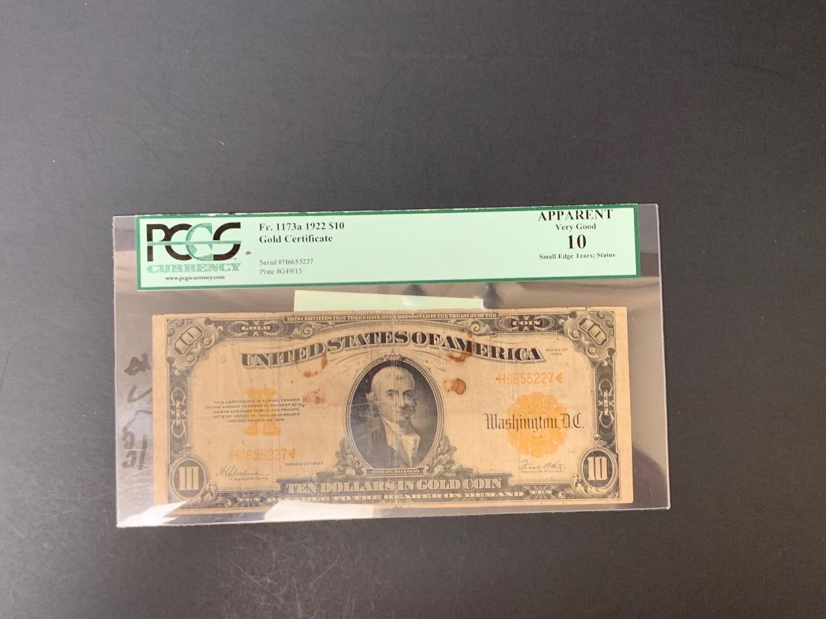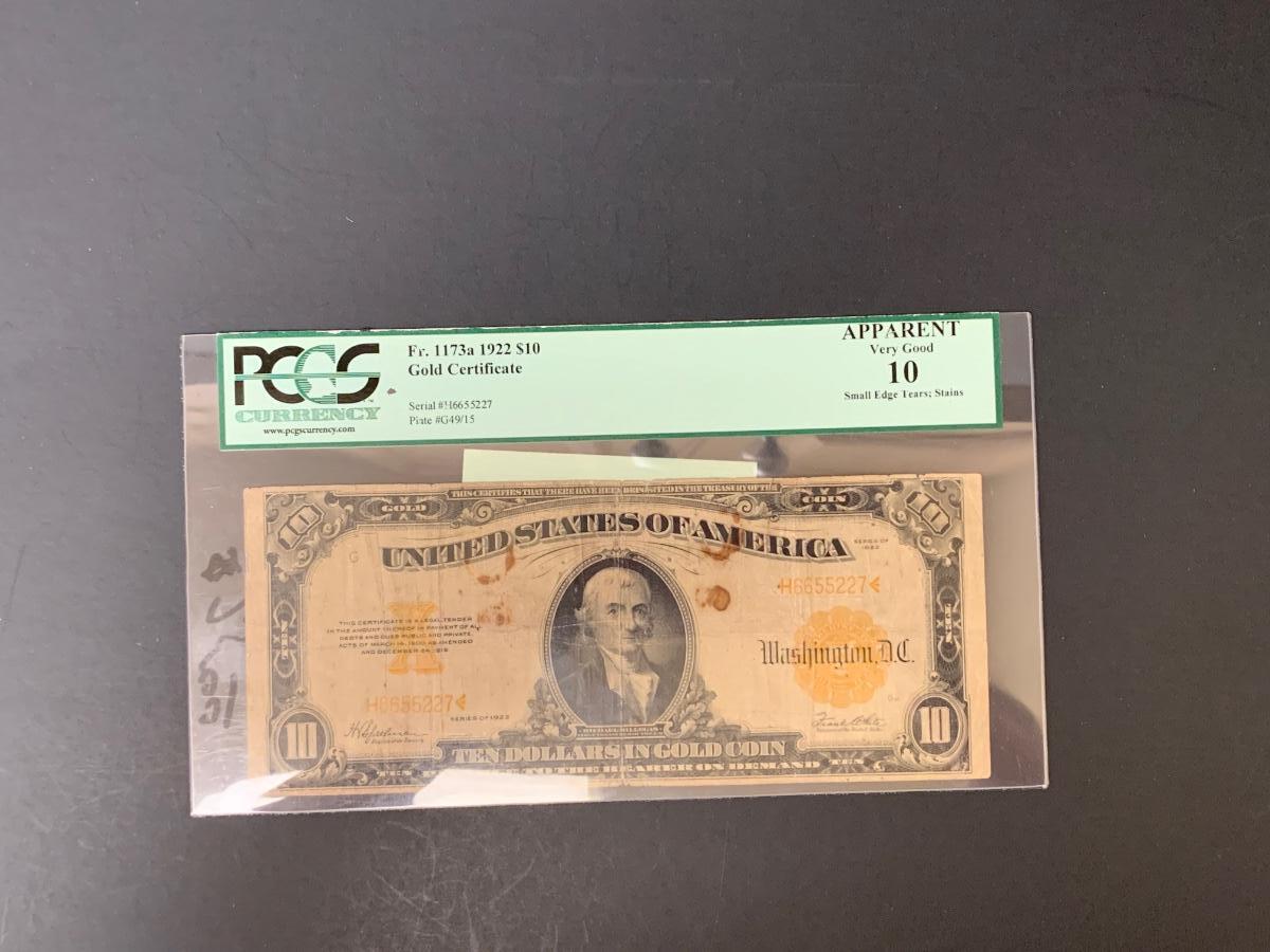 LOT 76: Graded 1922 US $10 Gold Certificate