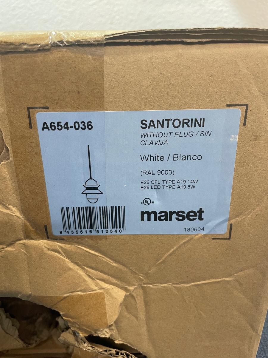 MARSET BRAND SANTORINI OUTDOOR LIGHT (WHITE COLOR). THE LIGHT OUT OF THE BOX IS SHOWN AS A SAMPLE OF THE LIGHT STYLE. THE ACTUAL COLOR OF THE LAMP IS ON A CLOSE PIC OF THE TAG ON BOX