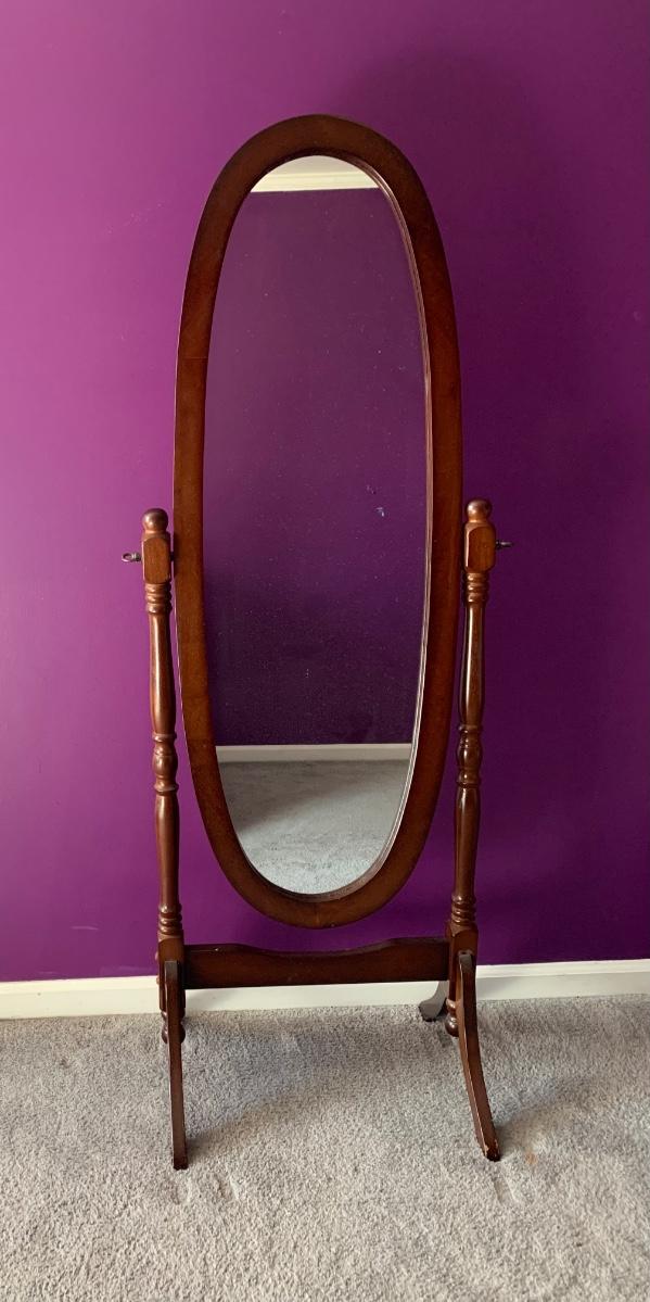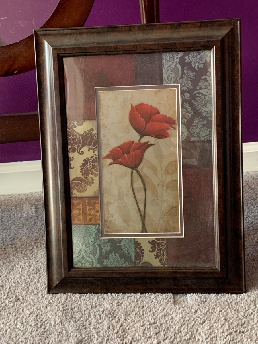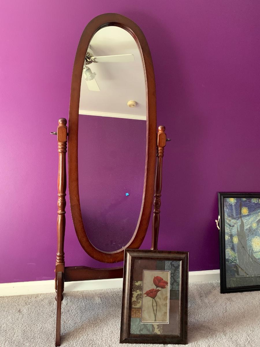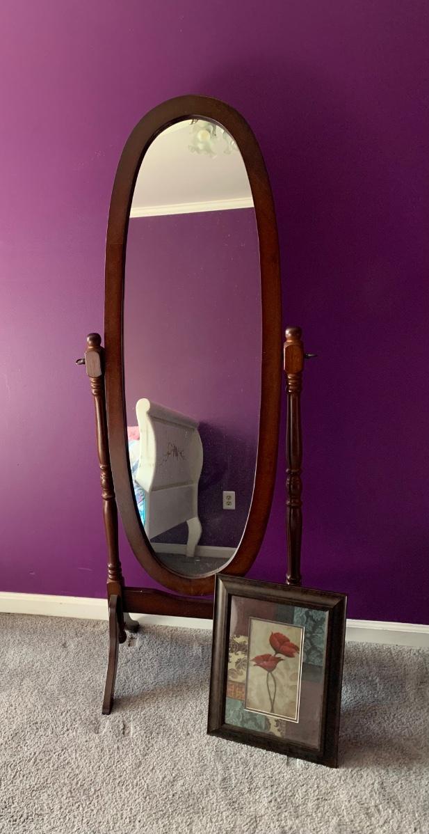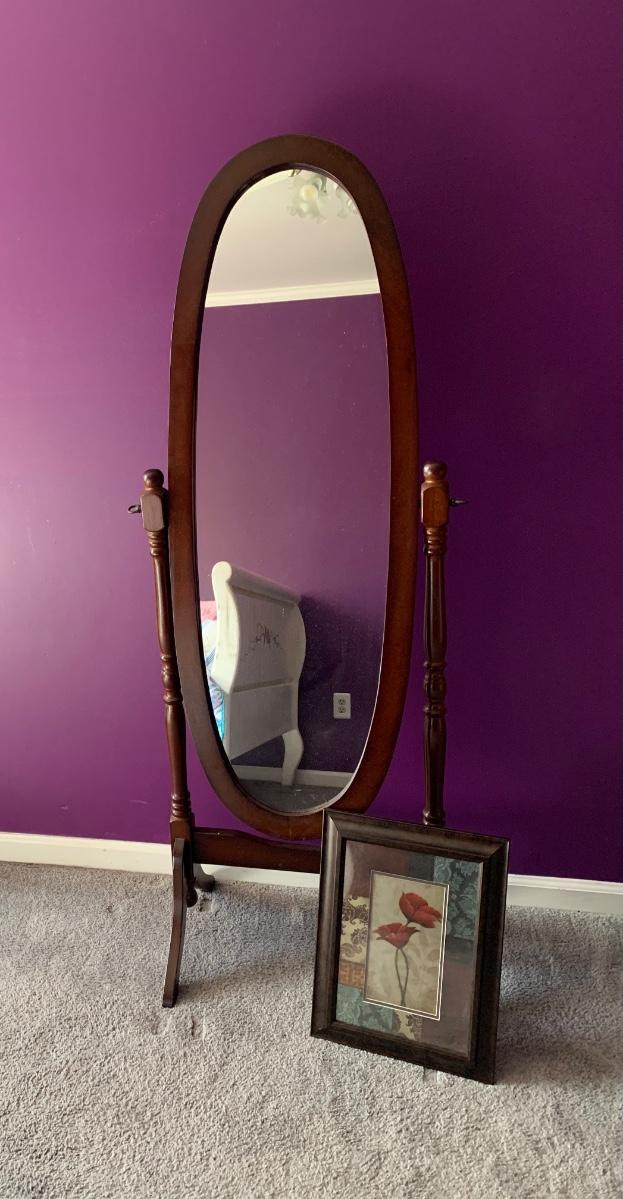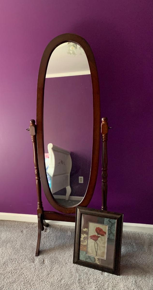 Wood framed, dark in color oval standing mirror and a 12 x 16 floral print.