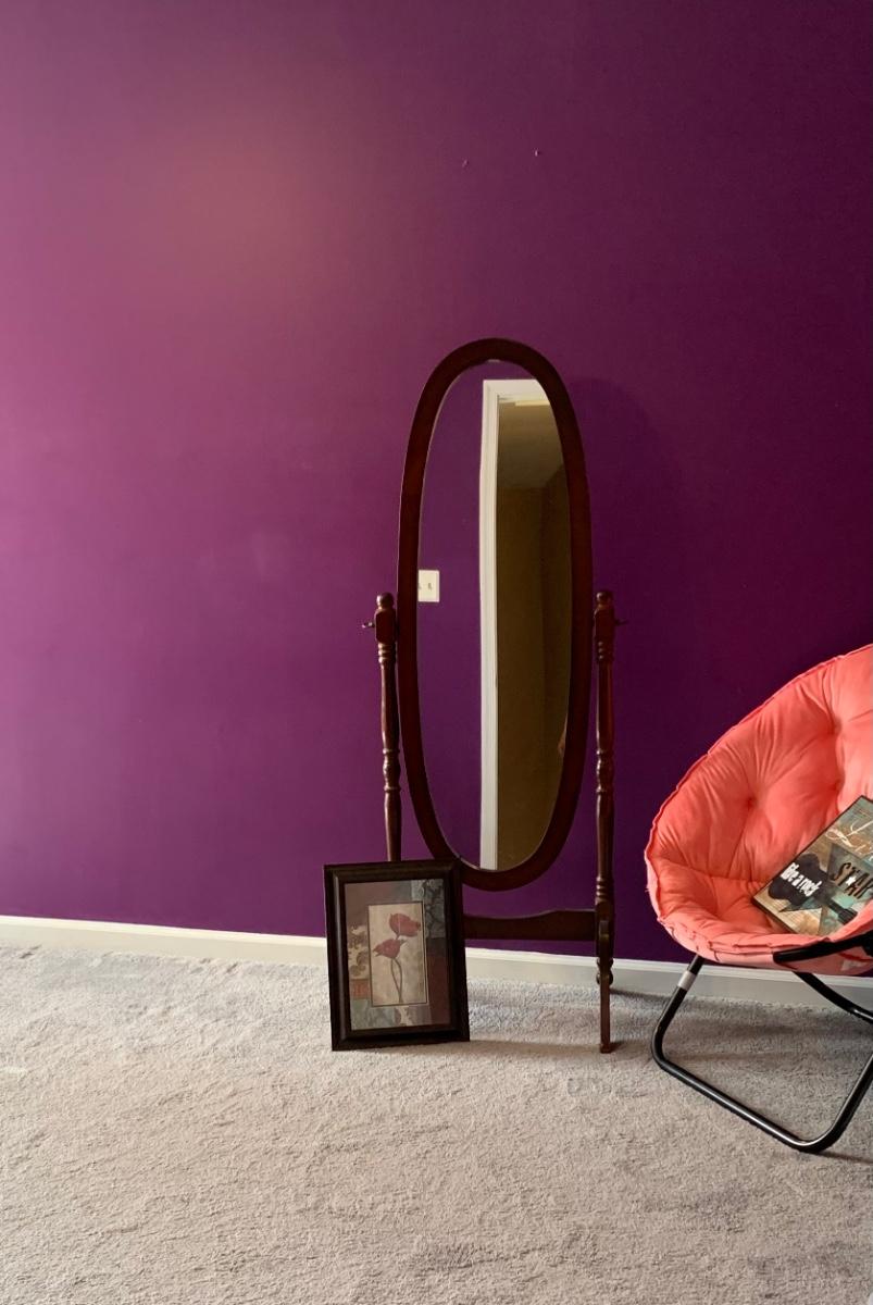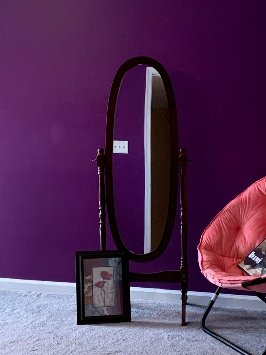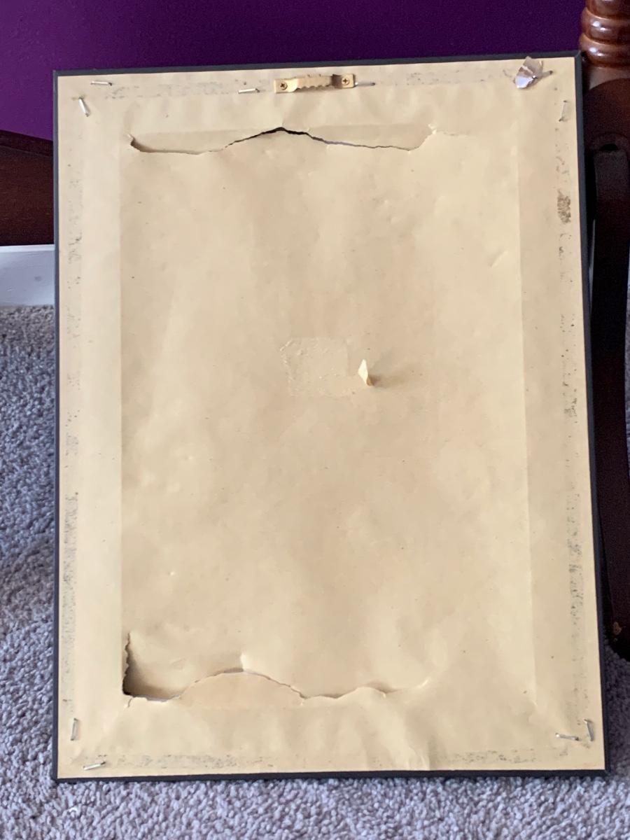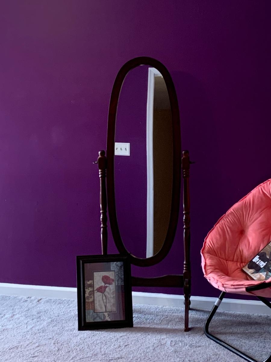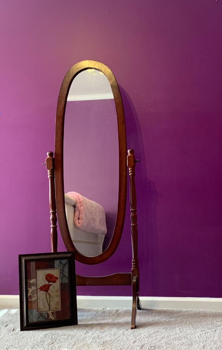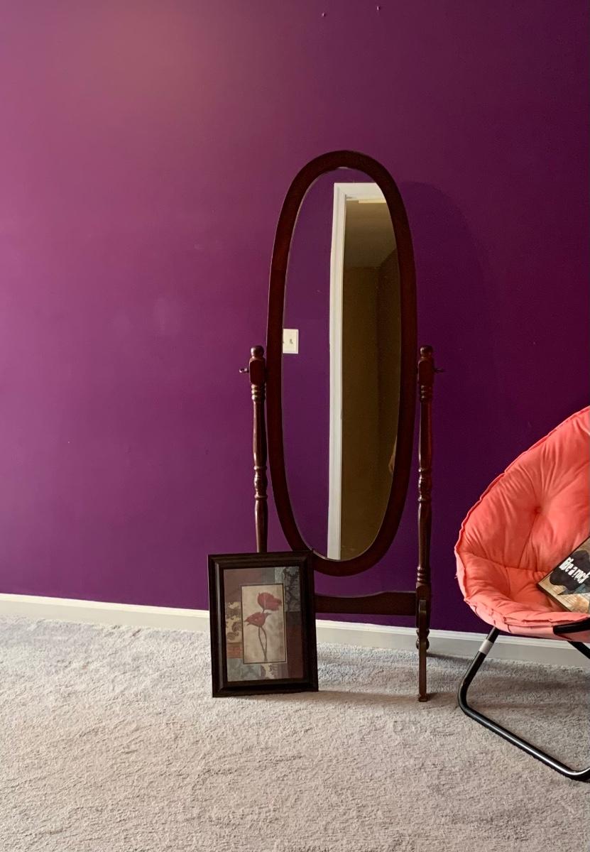 Wood framed, dark in color oval standing mirror and a 12 x 16 floral print.