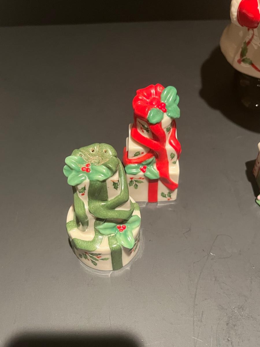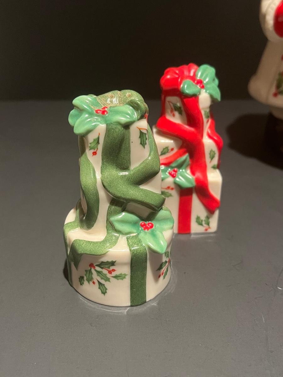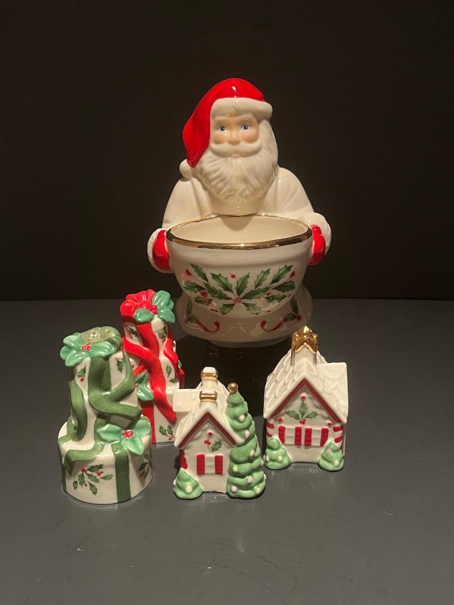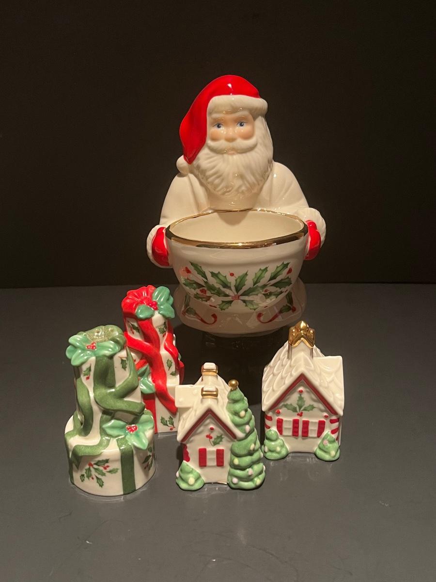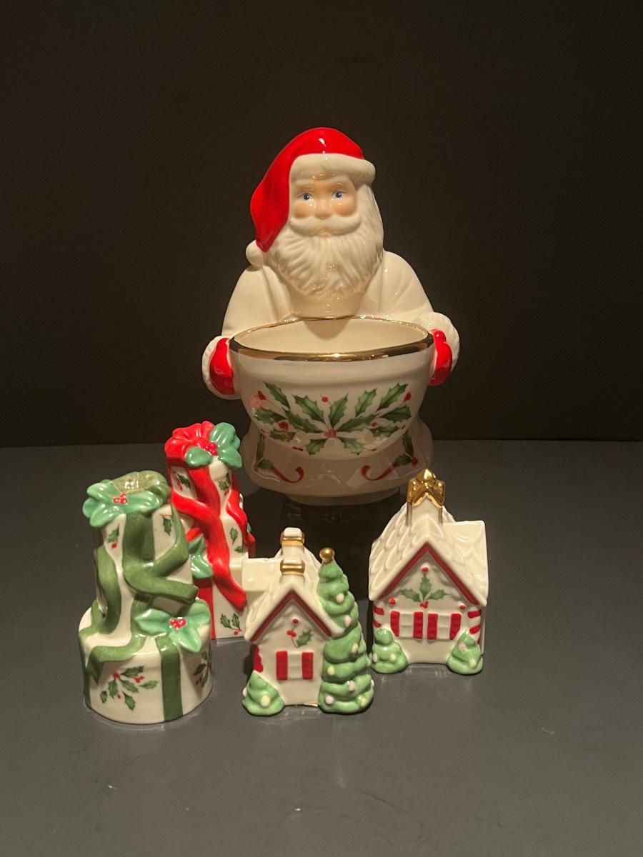 Lenox Santa candy dish or can be used as just a decoration, 2 sets of Lenox salt & pepper shakers: gift boxes and Christmas houses.