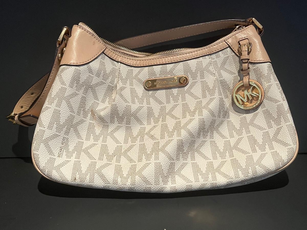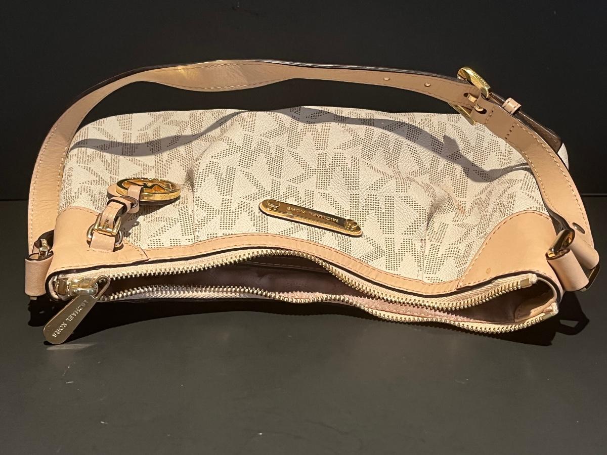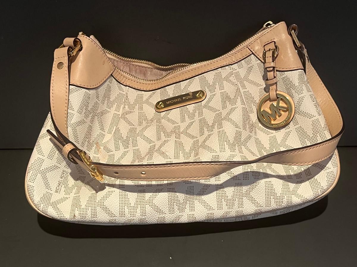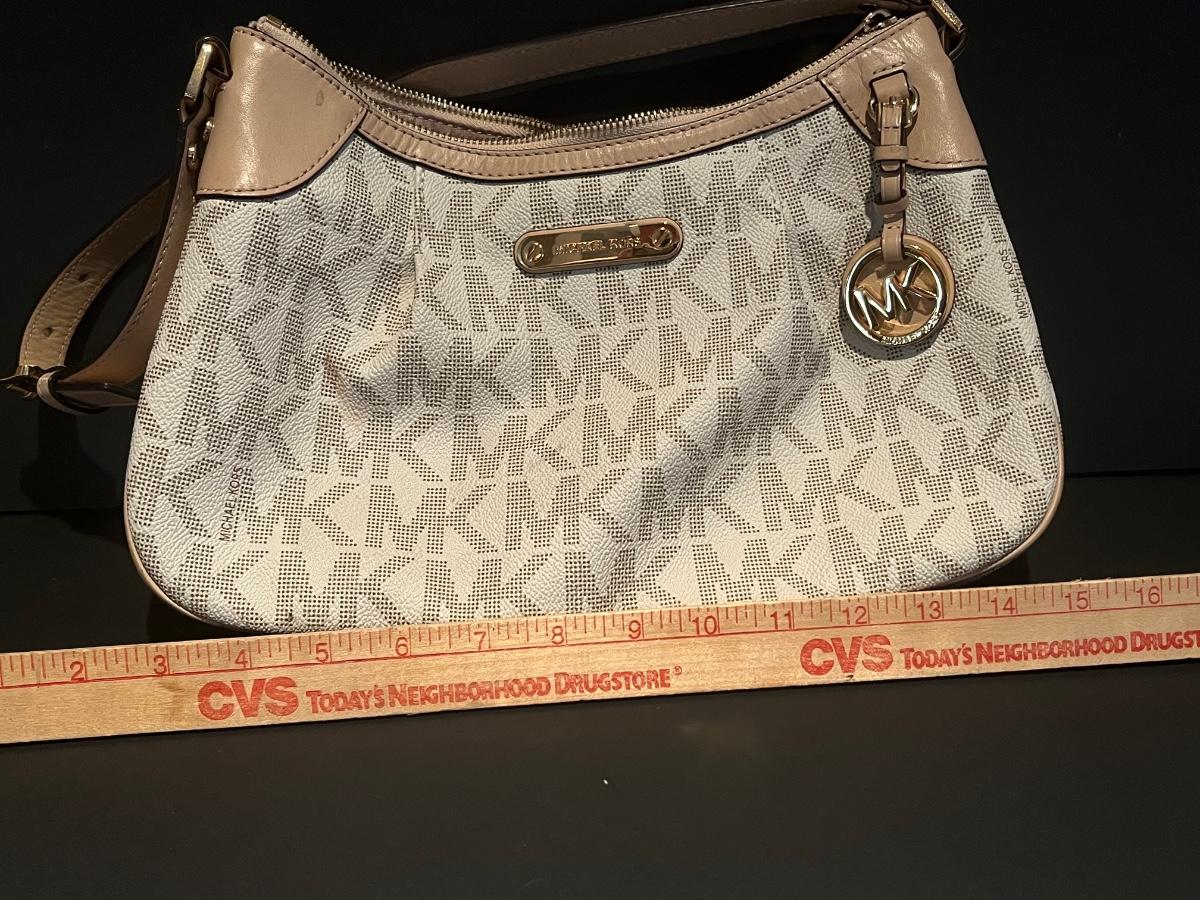 Off white bag with brown MK’s. Please see all pictures as they are the best representation of the items. The pictures show condition, measurements if taken, and what is included in the lot. Due to the large amount that we photograph and the time frame, we are not always able to take measurements. All items unless noted, are pre-owned and have been used. If you purchased furniture, you must bring help. We do not allow one person to carry large furniture out on their own. Bring help, tools and a truck for the safety of our client’s homes, and your personal safety. Any damages that result to the property including walls, and floors due to moving of the furniture will be charged to the buyer. Company policy. Thank you.