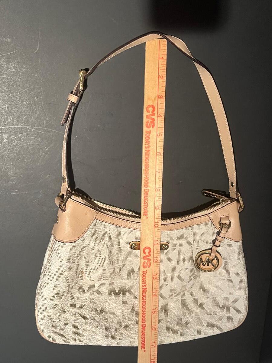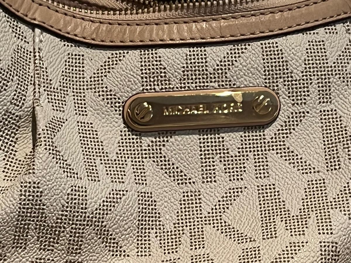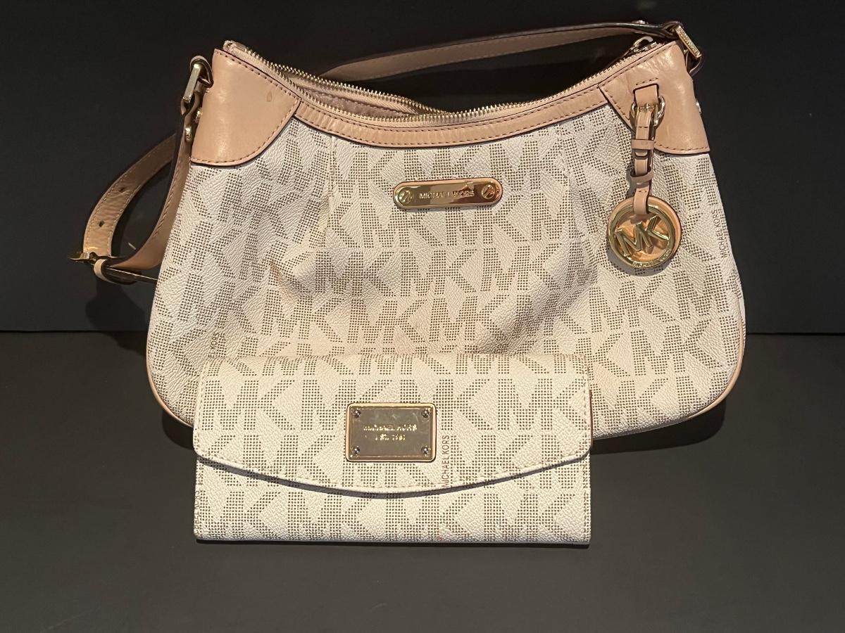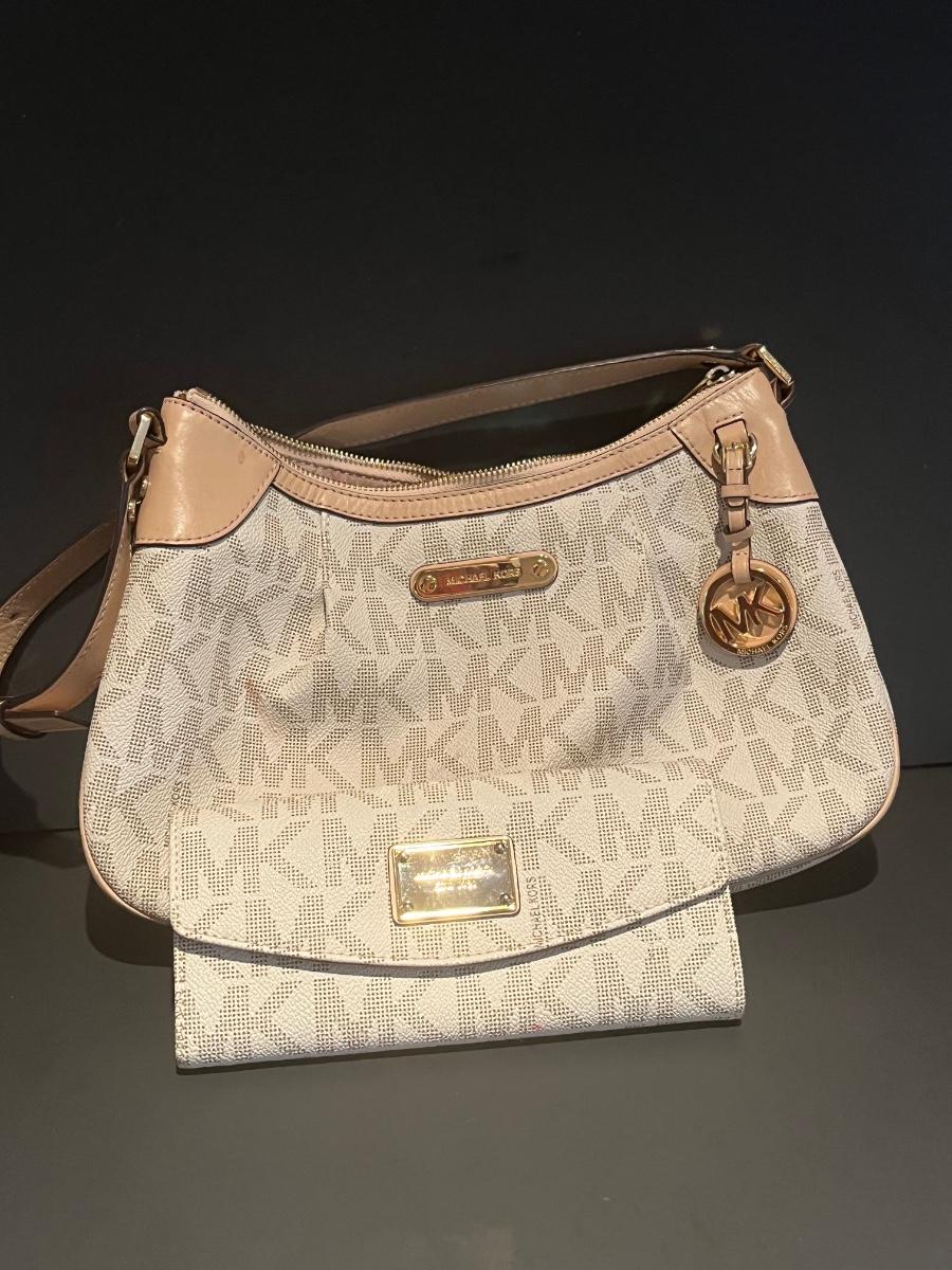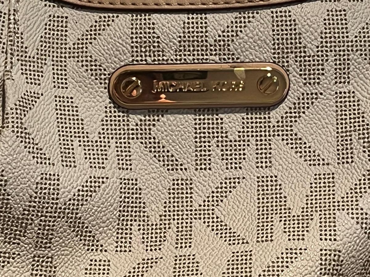Off white bag with brown MK’s. Please see all pictures as they are the best representation of the items. The pictures show condition, measurements if taken, and what is included in the lot. Due to the large amount that we photograph and the time frame, we are not always able to take measurements. All items unless noted, are pre-owned and have been used. If you purchased furniture, you must bring help. We do not allow one person to carry large furniture out on their own. Bring help, tools and a truck for the safety of our client’s homes, and your personal safety. Any damages that result to the property including walls, and floors due to moving of the furniture will be charged to the buyer. Company policy. Thank you.