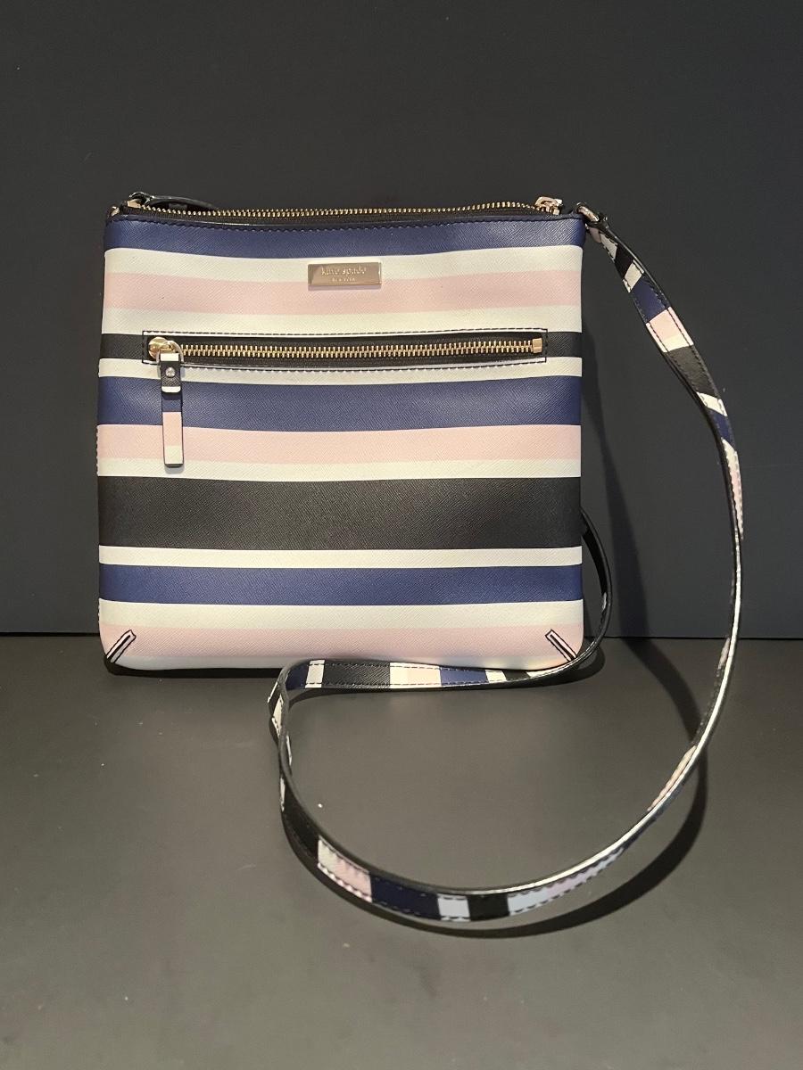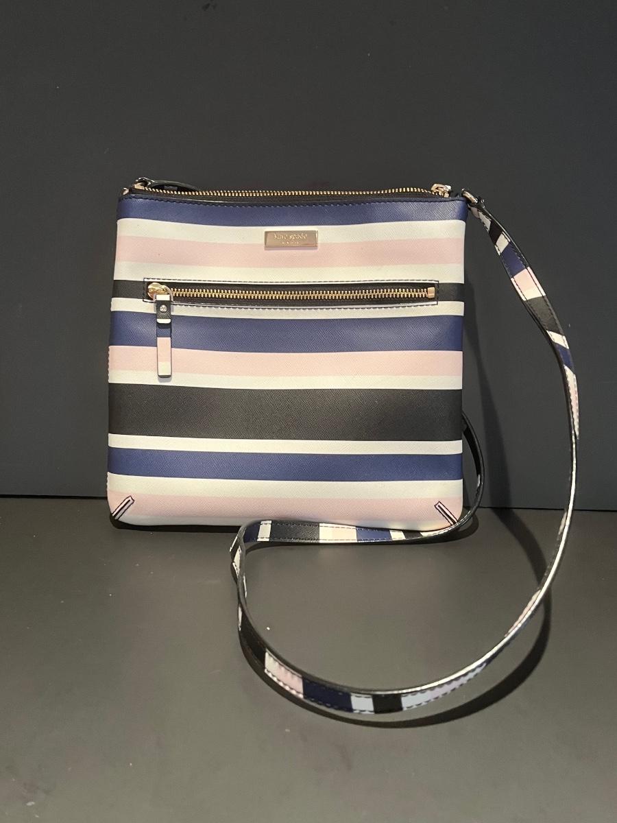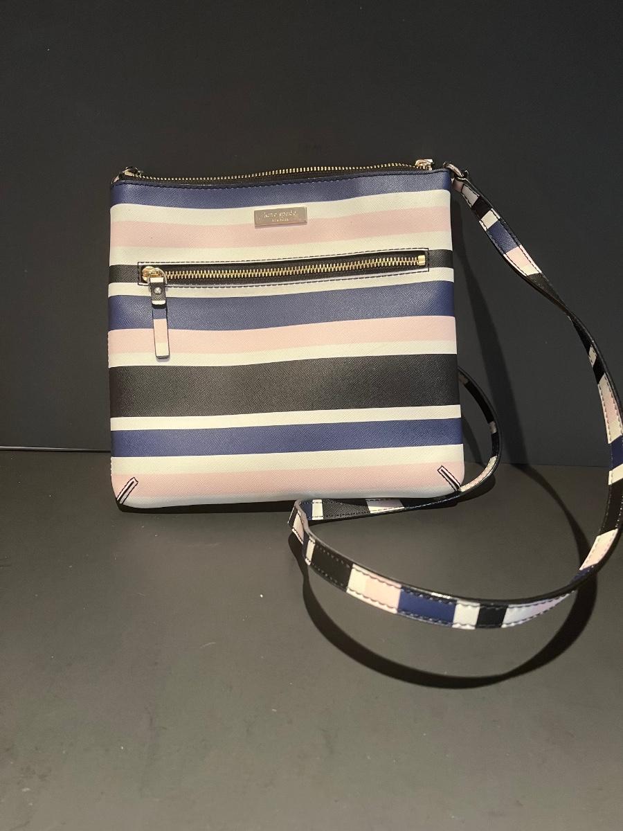 Pink, blue, black and white striped bag. Perfect for your spring wardrobe! Please see all pictures as they are the best representation of the items. The pictures show condition, measurements if taken, and what is included in the lot. Due to the large amount that we photograph and the time frame, we are not always able to take measurements. All items unless noted, are pre-owned and have been used. If you purchased furniture, you must bring help. We do not allow one person to carry large furniture out on their own. Bring help, tools and a truck for the safety of our client’s homes, and your personal safety. Any damages that result to the property including walls, and floors due to moving of the furniture will be charged to the buyer. Company policy. Thank you.