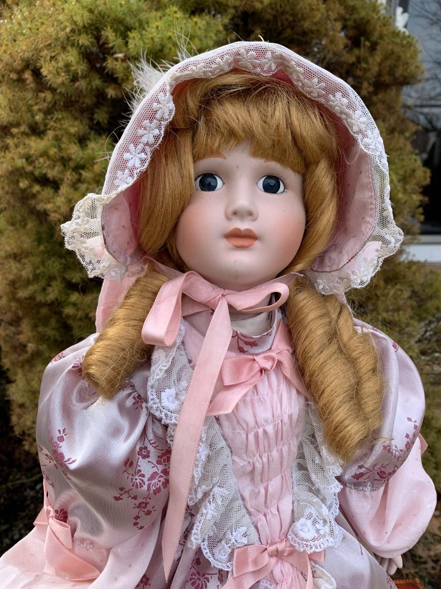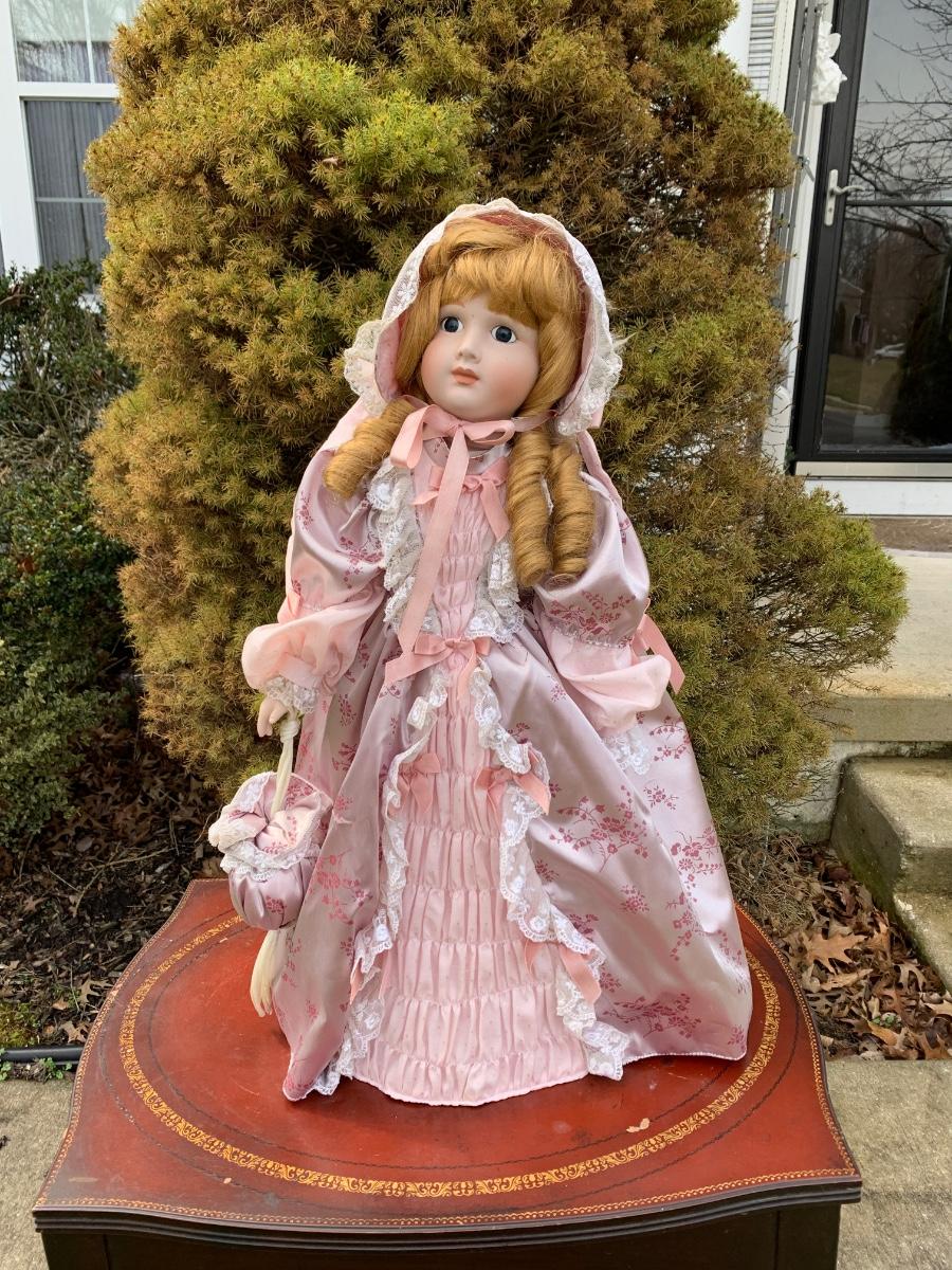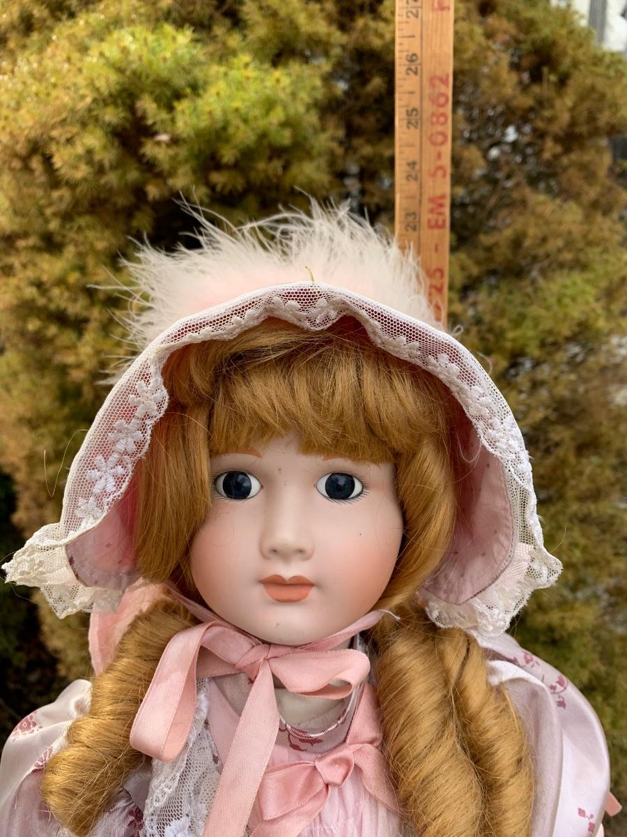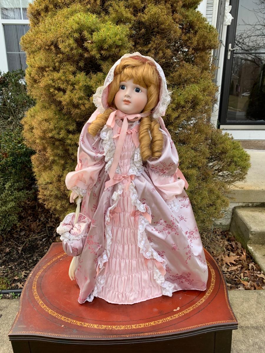Collectible 21" porcelain doll with no marking.in Victorian era clothing.