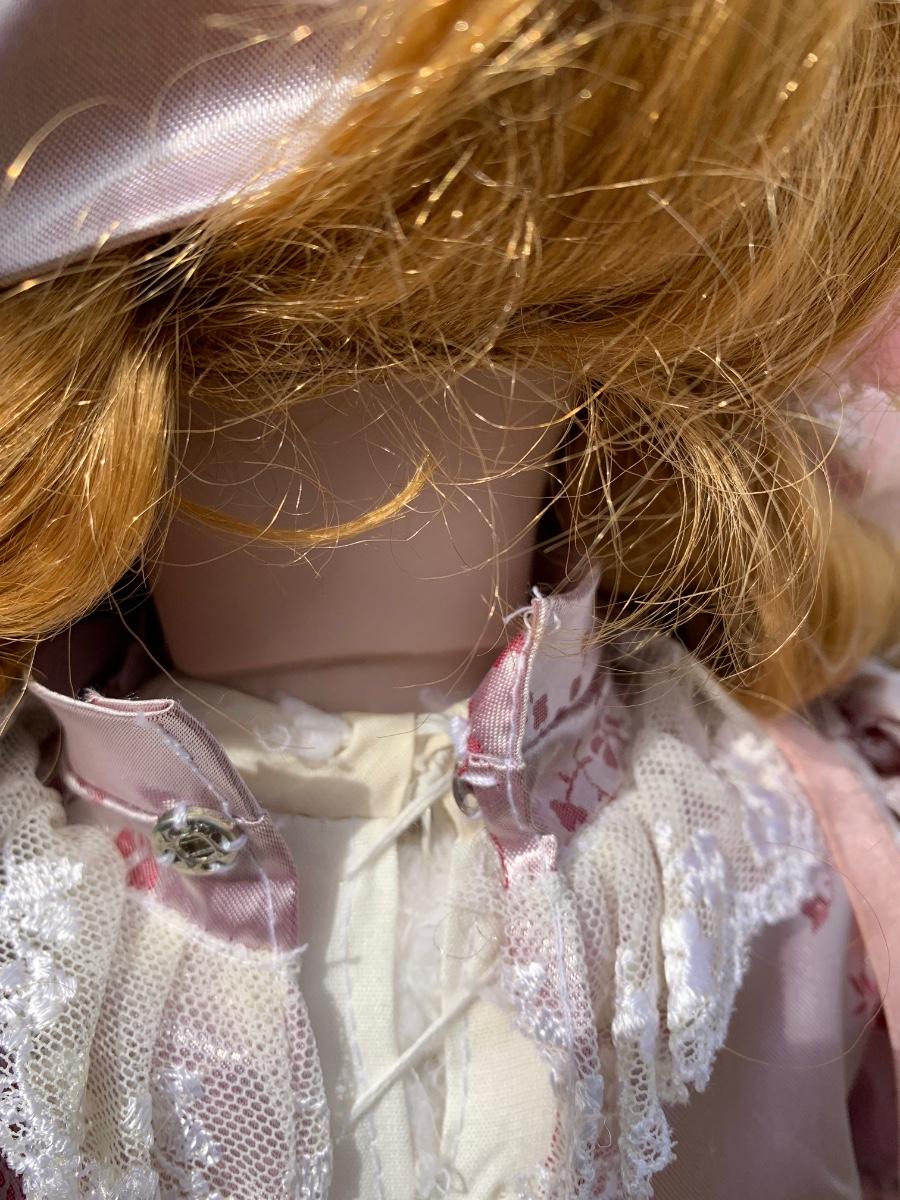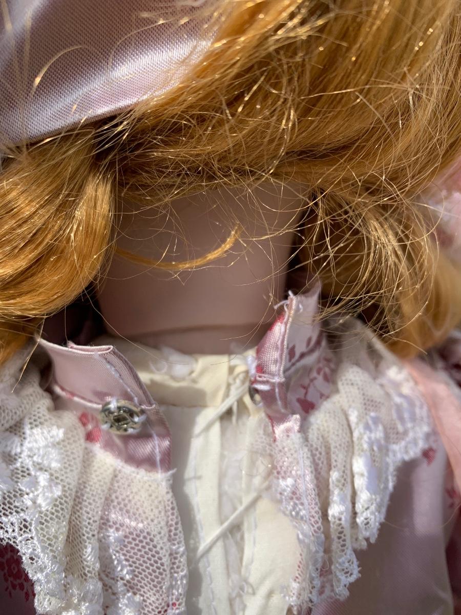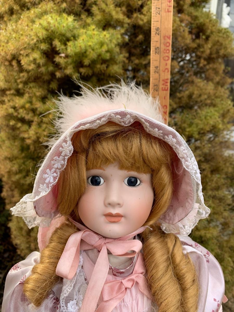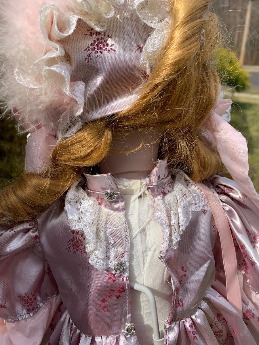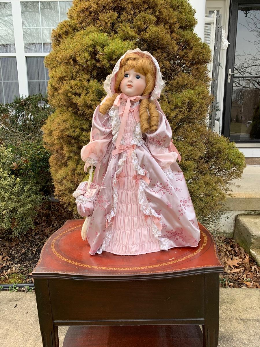 Collectible 21" porcelain doll with no marking.in Victorian era clothing.