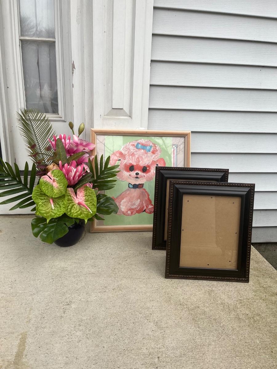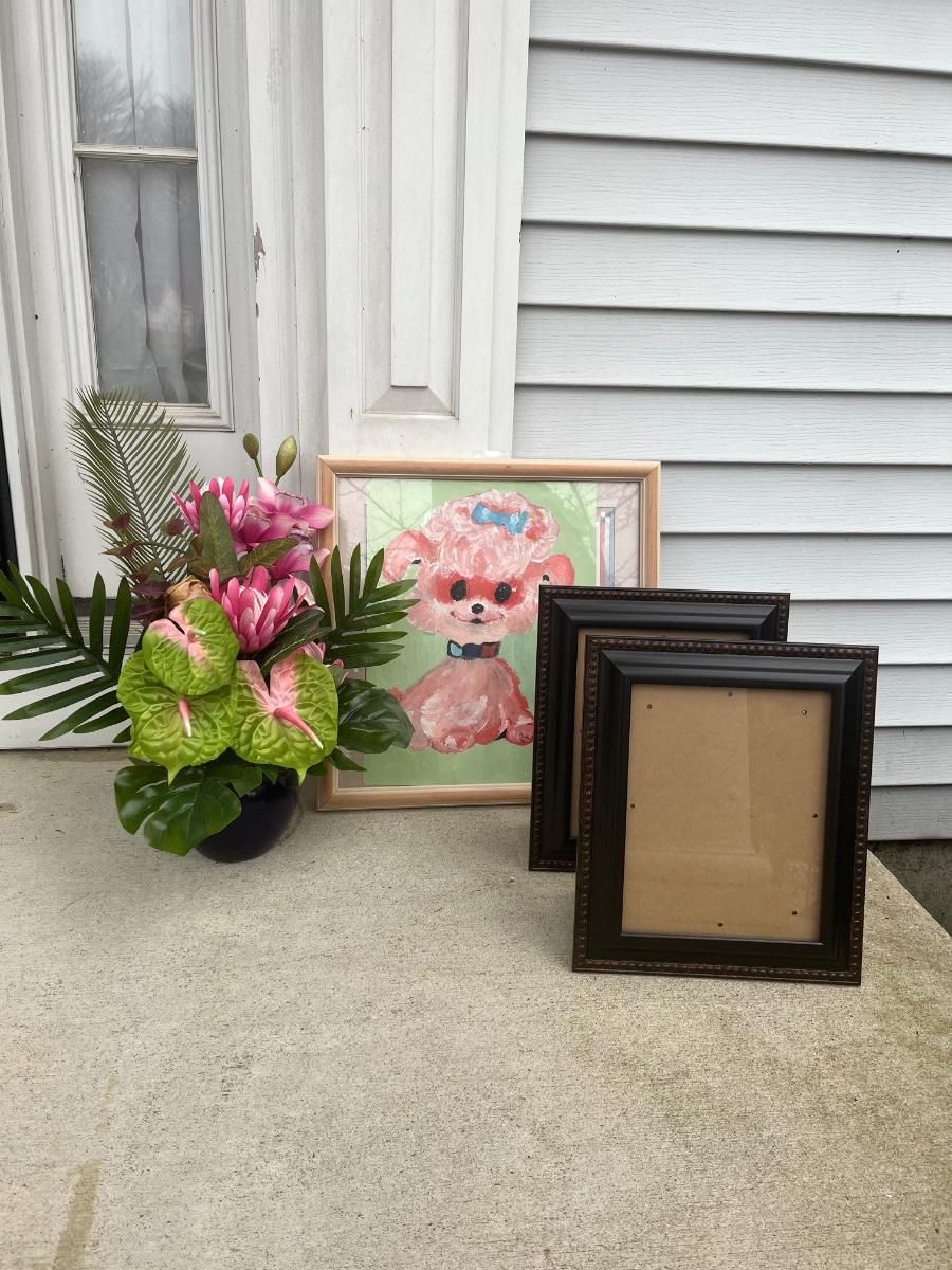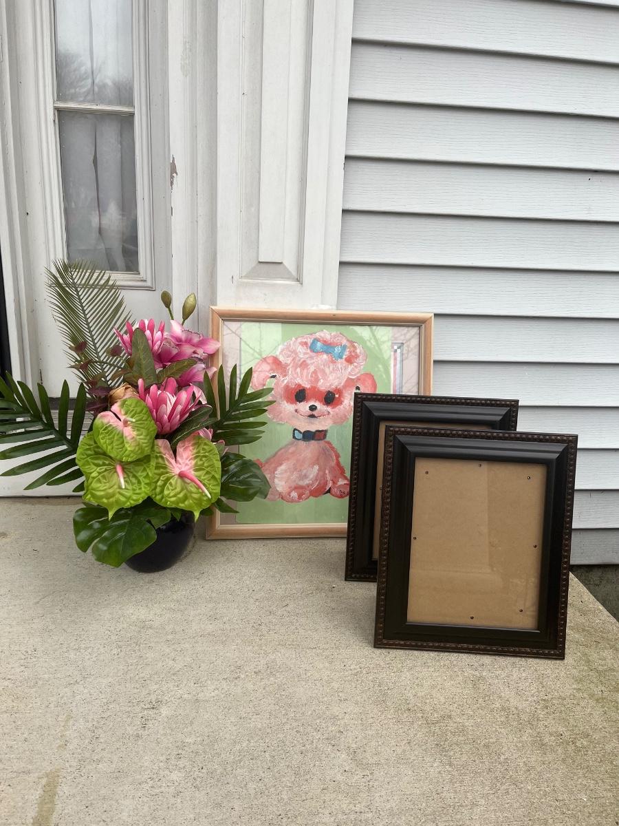 Poodle was painted by a 12 yr old boy. Painting 12x18, frame 18x18. 2 decorative wood frames and beautiful fake floral centerpiece. Please see all pictures as they are the best representation of the items. The pictures show condition, measurements if taken, and what is included in the lot. Due to the large amount that we photograph and the time frame, we are not always able to take measurements. All items unless noted, are pre-owned and have been used. If you purchased furniture, you must bring help. We do not allow one person to carry large furniture out on their own. Bring help, tools and a truck for the safety of our client’s homes, and your personal safety. Any damages that result to the property including walls, and floors due to moving of the furniture will be charged to the buyer. Company policy. Thank you.