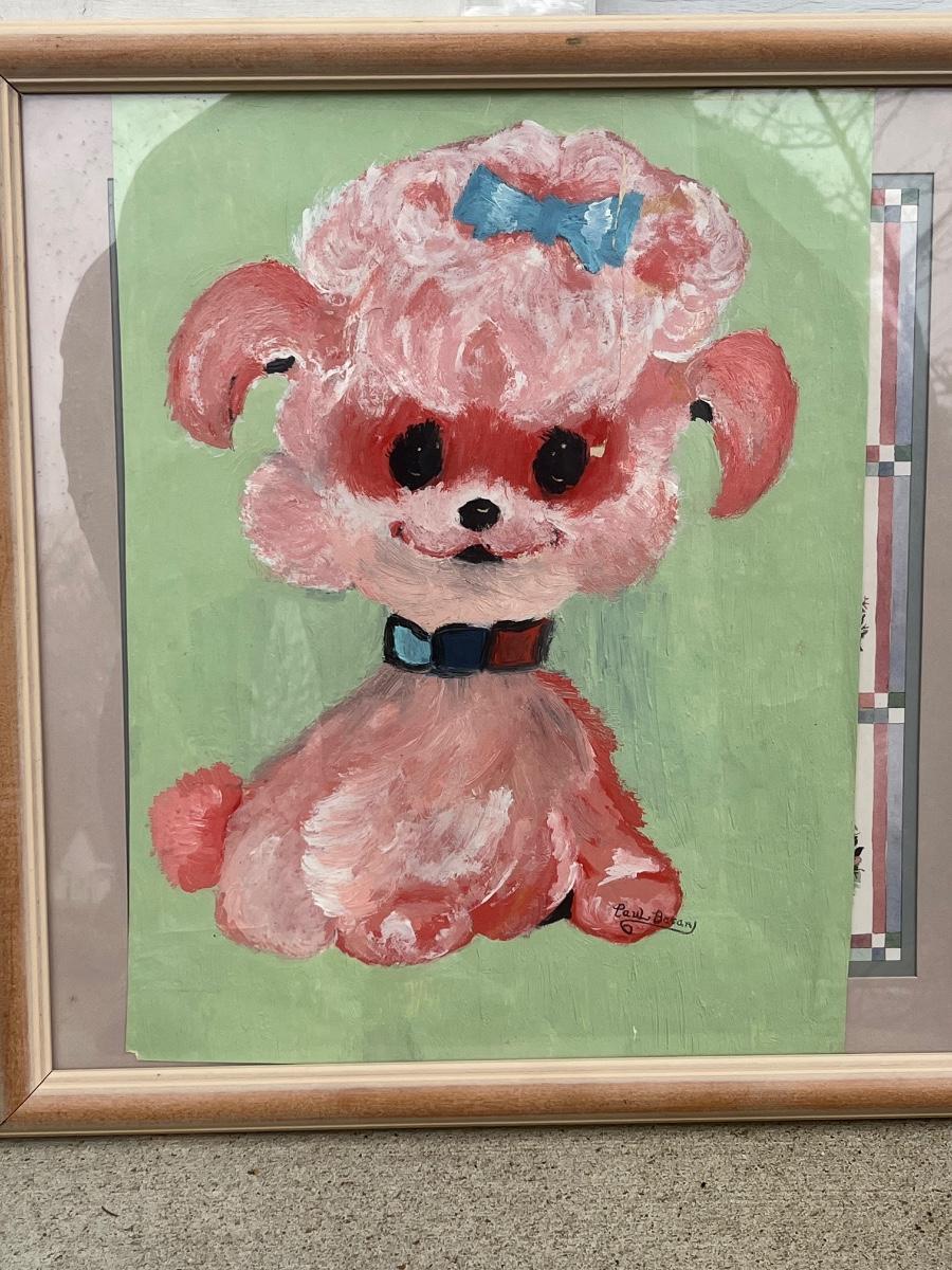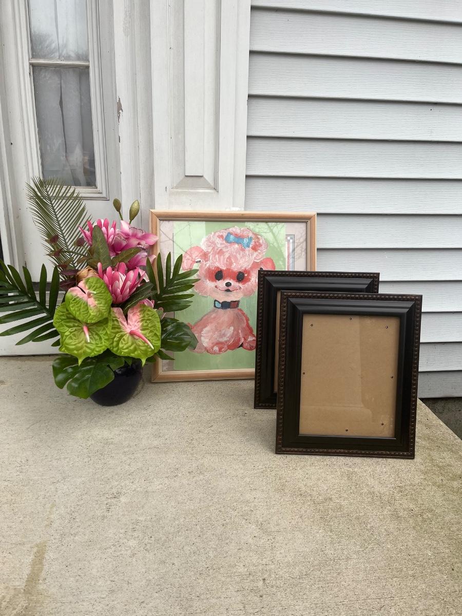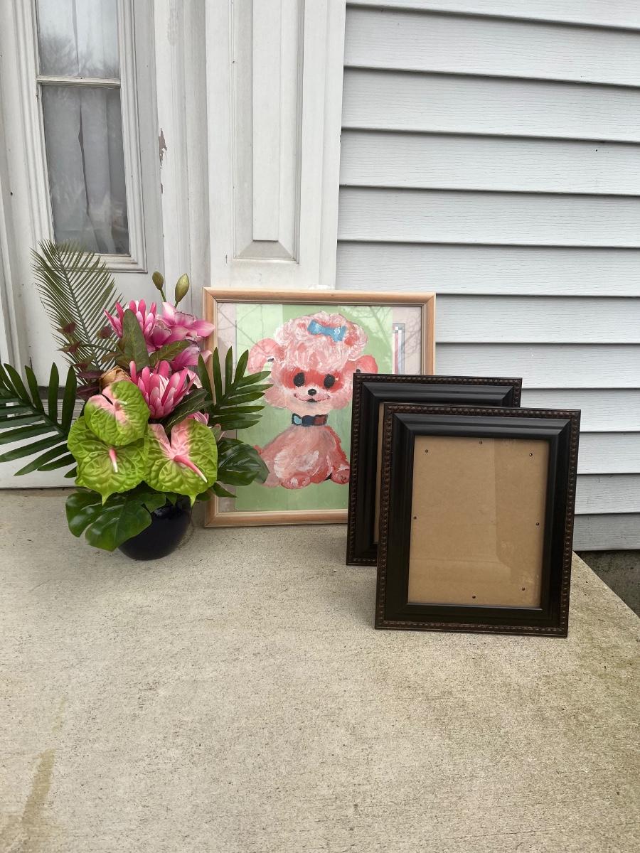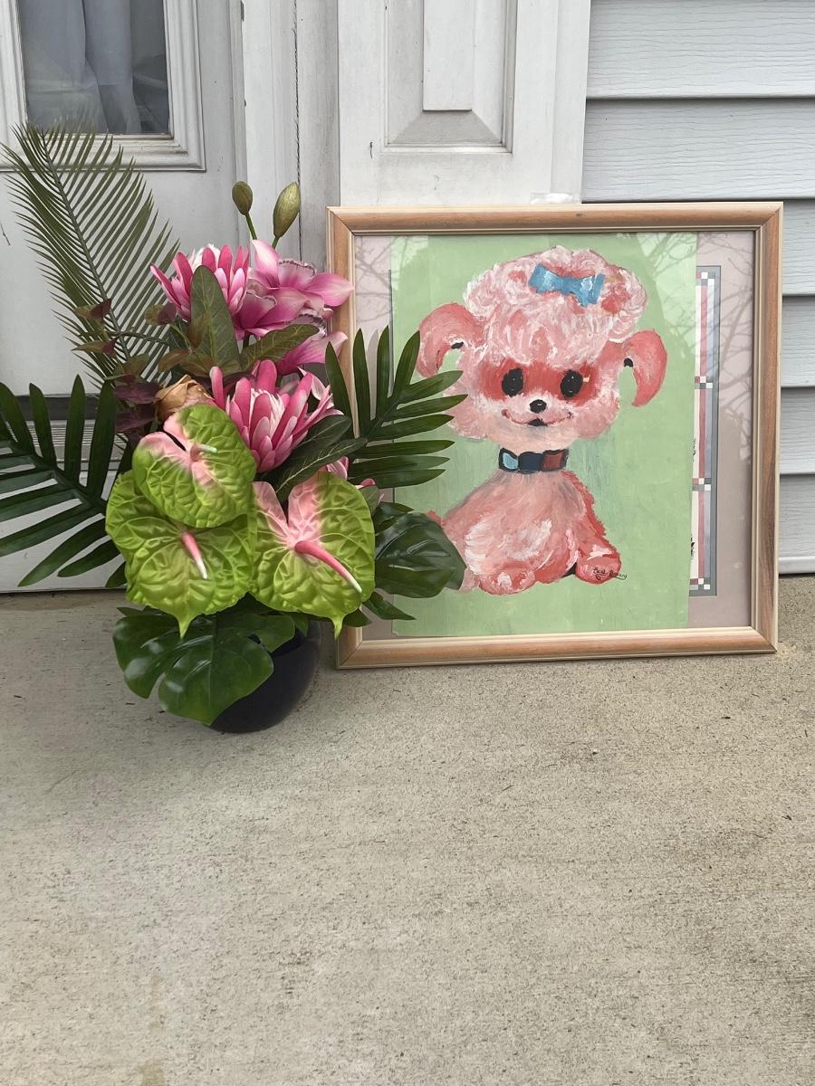 Poodle was painted by a 12 yr old boy. Painting 12x18, frame 18x18. 2 decorative wood frames and beautiful fake floral centerpiece. Please see all pictures as they are the best representation of the items. The pictures show condition, measurements if taken, and what is included in the lot. Due to the large amount that we photograph and the time frame, we are not always able to take measurements. All items unless noted, are pre-owned and have been used. If you purchased furniture, you must bring help. We do not allow one person to carry large furniture out on their own. Bring help, tools and a truck for the safety of our client’s homes, and your personal safety. Any damages that result to the property including walls, and floors due to moving of the furniture will be charged to the buyer. Company policy. Thank you.
