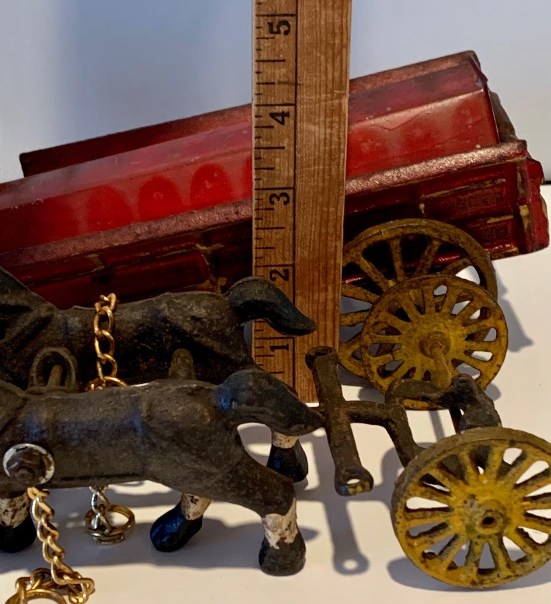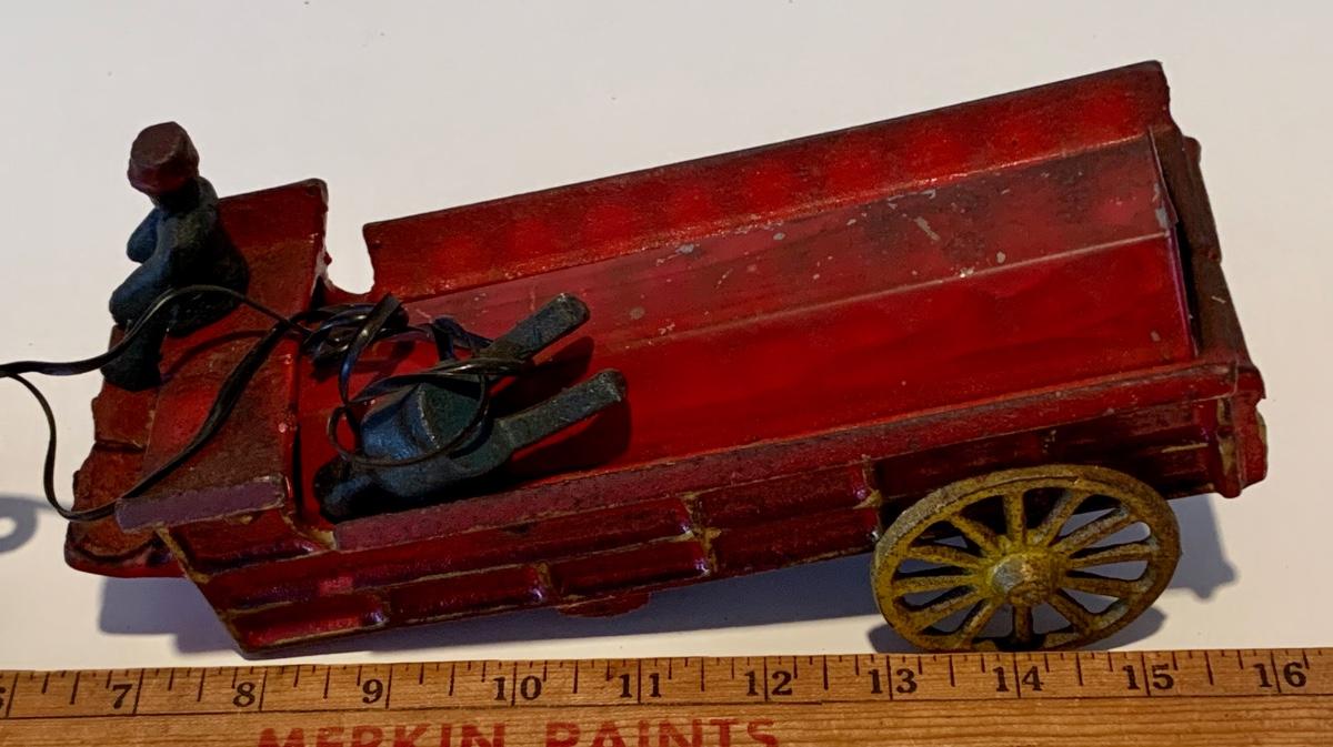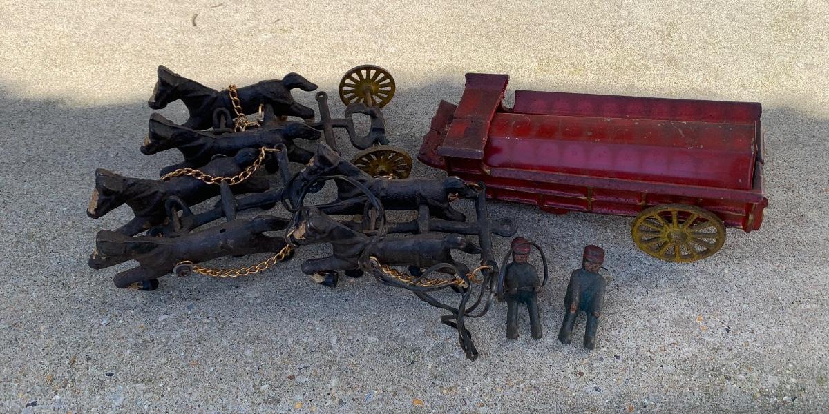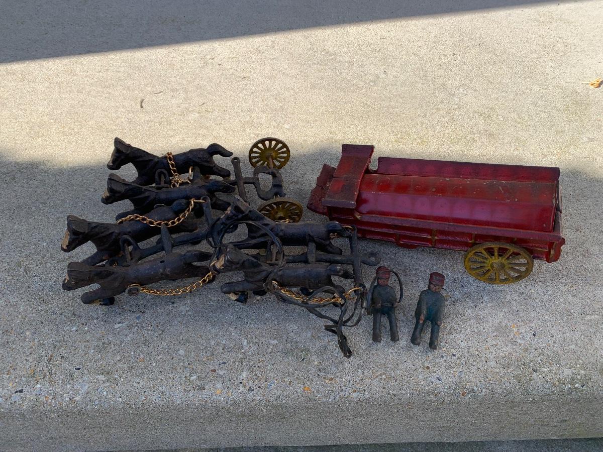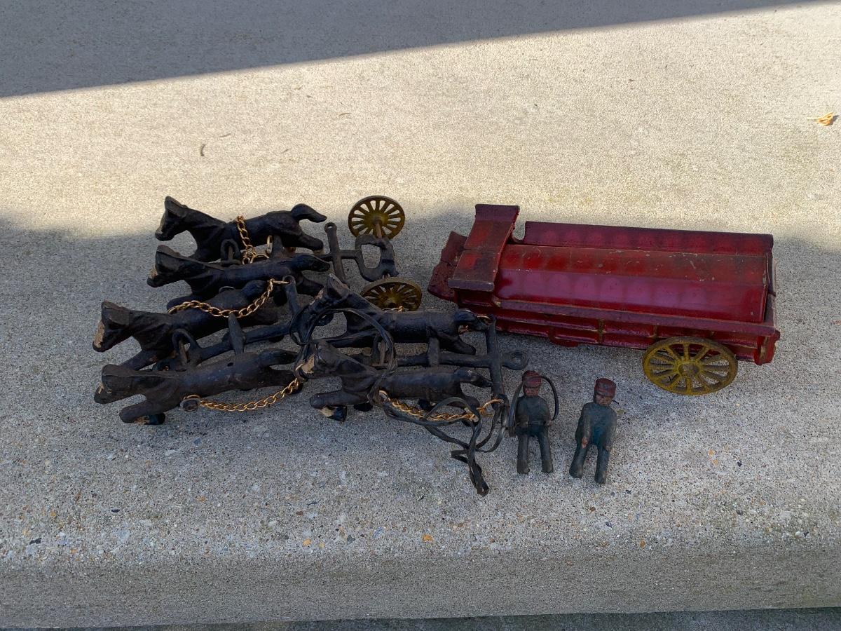 LOT 406R: Cast Iron Vintage Toy Horse Drawn Wagon w/People