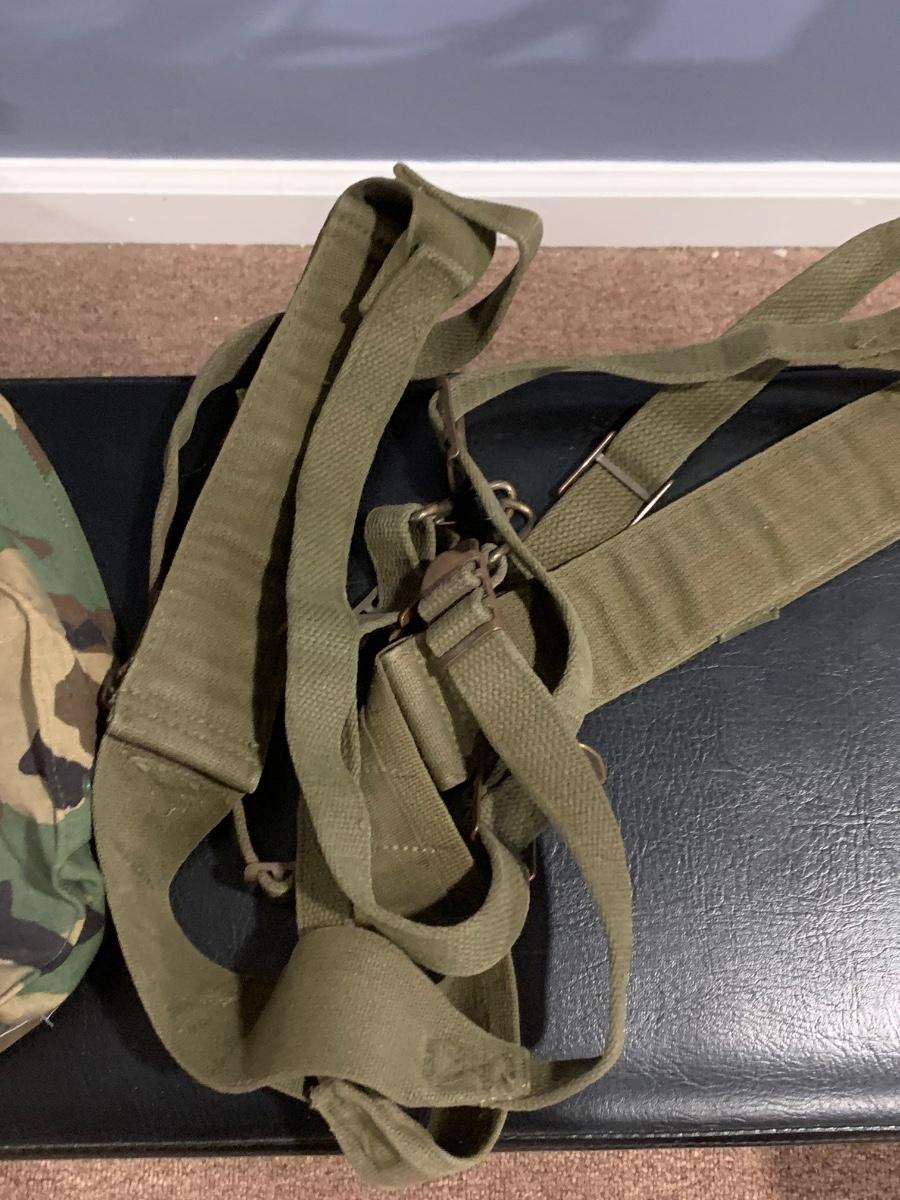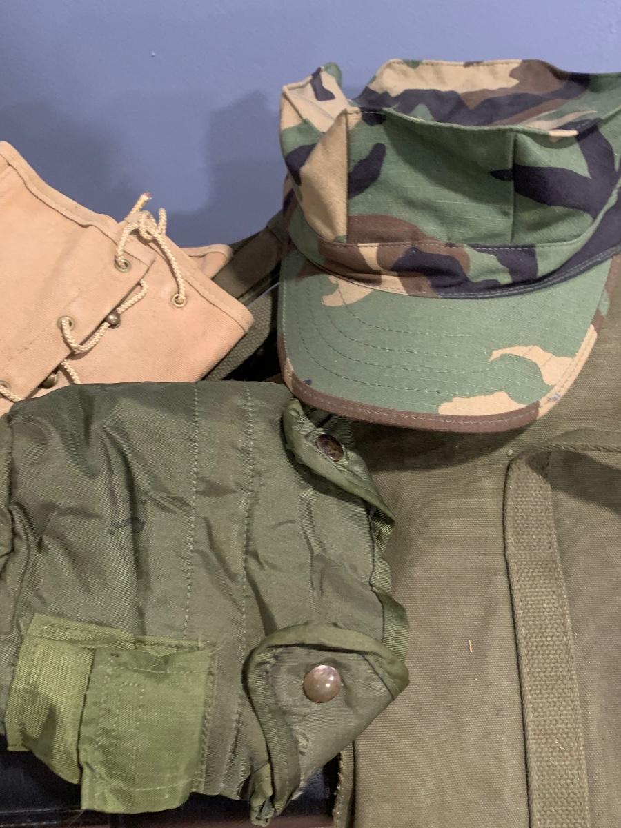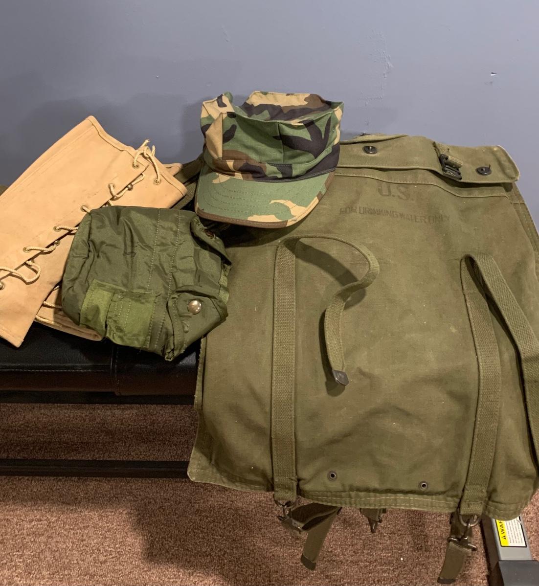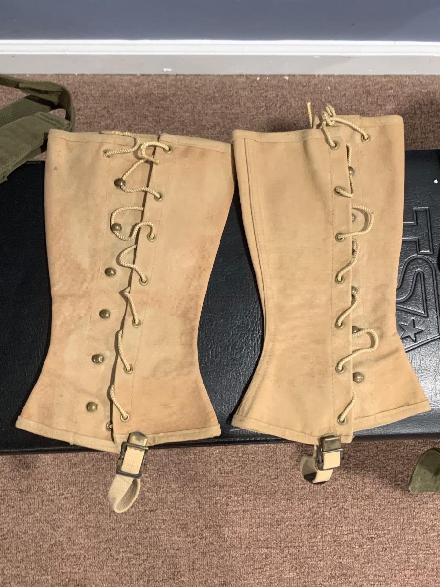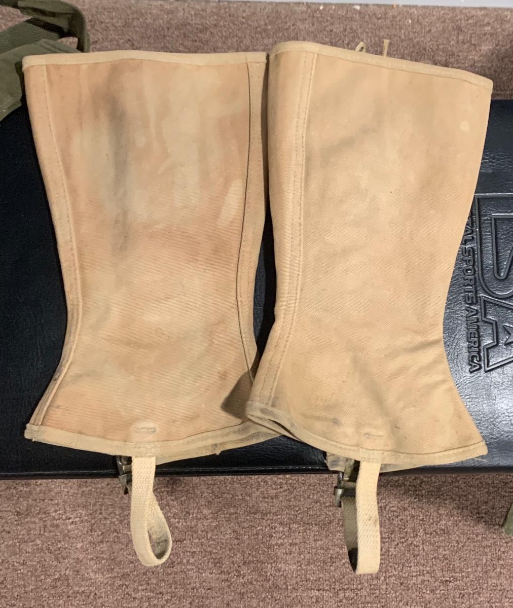 Vintage US Army Military canvas uniform brown gaitors/boot leggings, water bag & more
