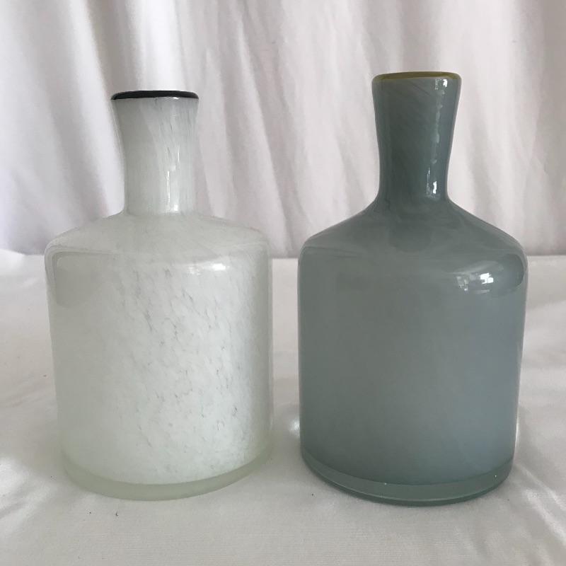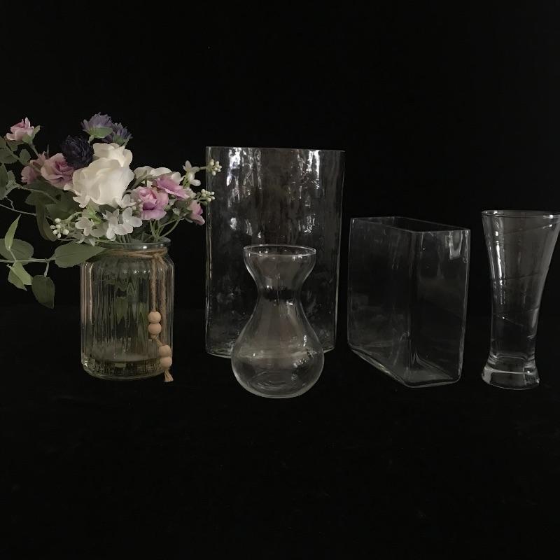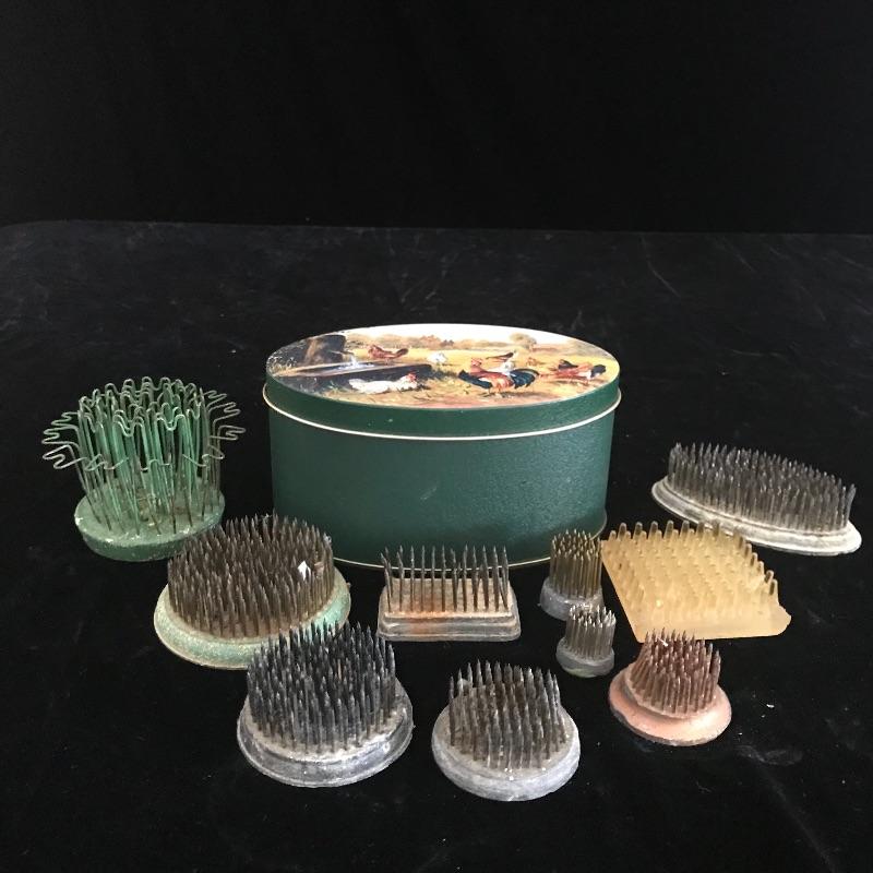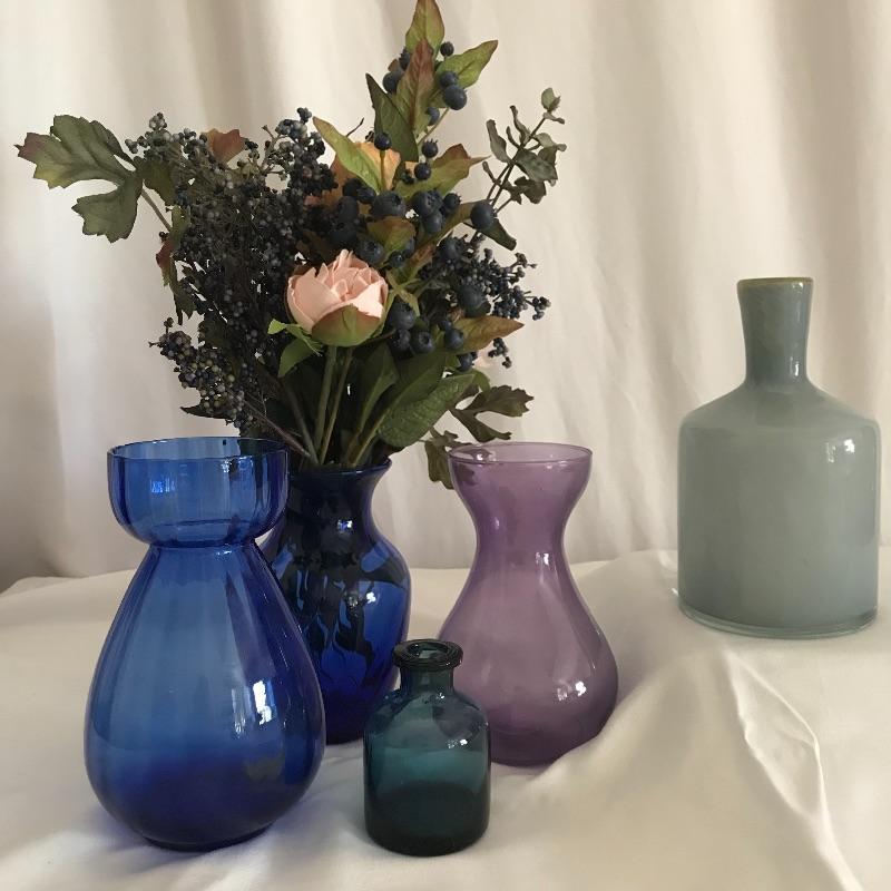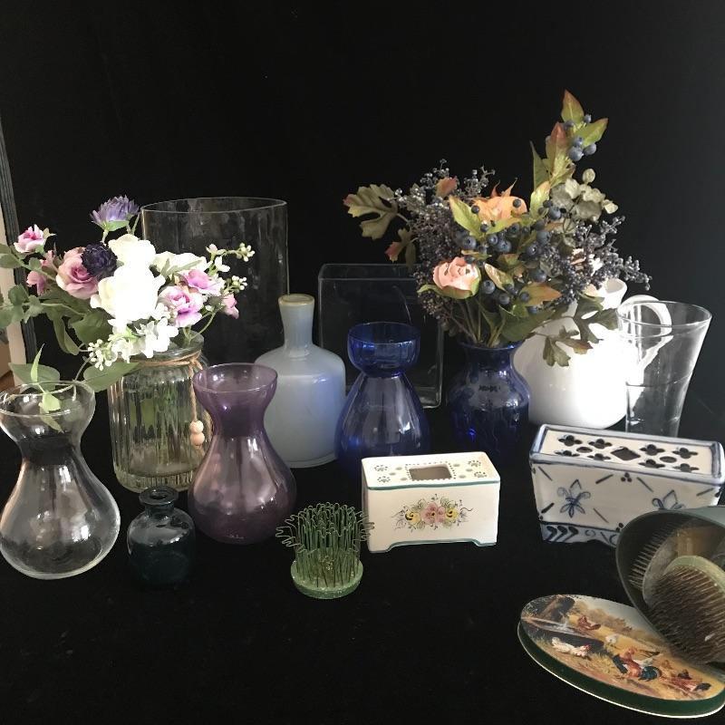 Lovely array of blown, formed and pottery foliage displays pieces. The tallest piece is a uniquely textured bulb clear glass vase standing approximately 12.5” tall with dried foliage. Two faux floral arrangements included, the clear glass arrangement is fixed with faux water. Smaller pottery bud vases, small and tiny frogs included with a country chicken tin. See photos. No shipping.