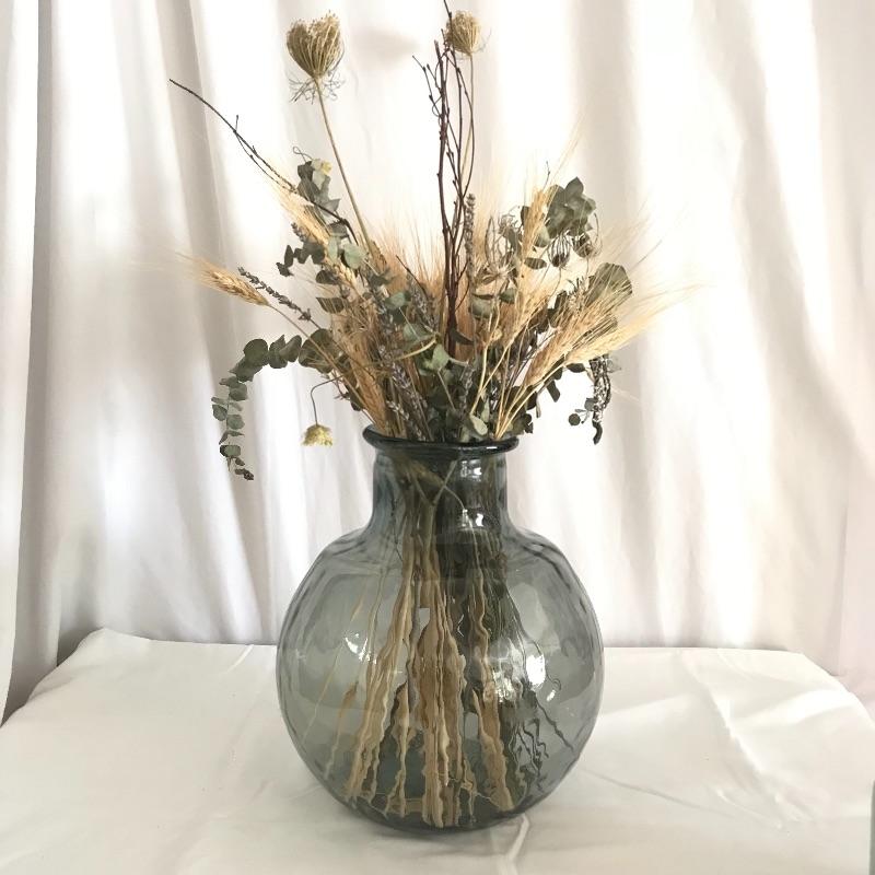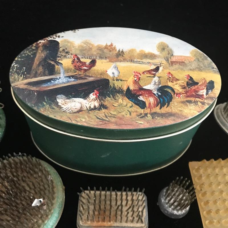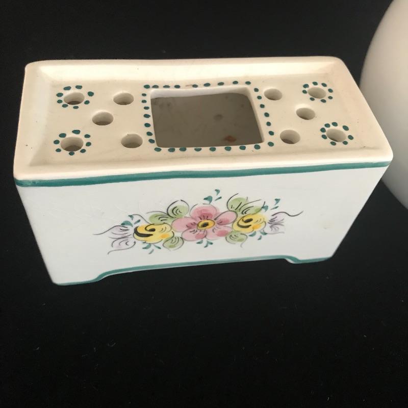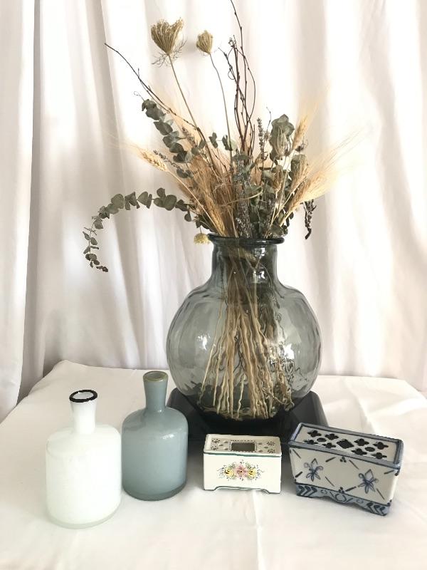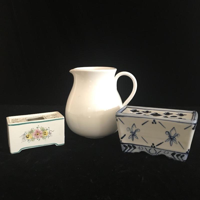 Lovely array of blown, formed and pottery foliage displays pieces. The tallest piece is a uniquely textured bulb clear glass vase standing approximately 12.5” tall with dried foliage. Two faux floral arrangements included, the clear glass arrangement is fixed with faux water. Smaller pottery bud vases, small and tiny frogs included with a country chicken tin. See photos. No shipping.