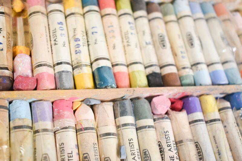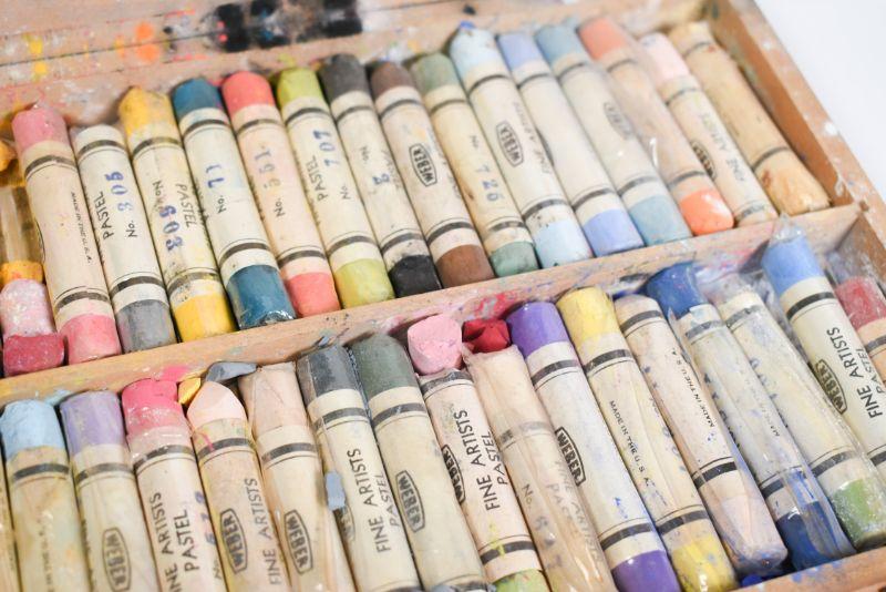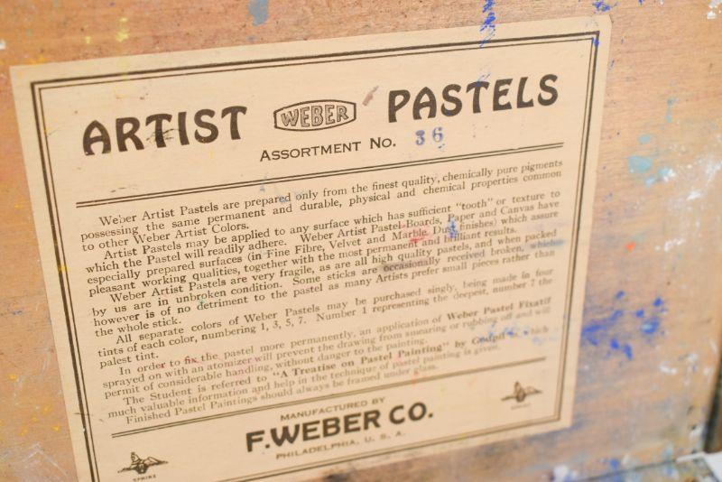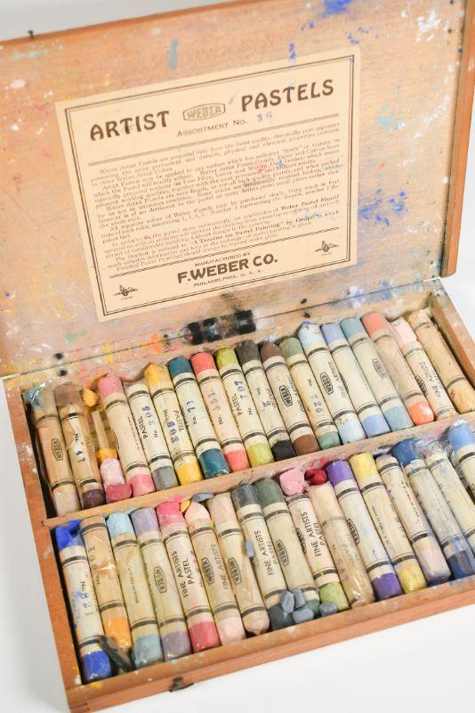 Wooden box filled with artist pastels by Weber. Unsure of age, condition, or usability. **Please read Terms and Conditions before placing a bid. Pick up is Sunday, December 22 from 11am to 3pm or Monday, December 23 from 4pm-7pm in Mantua, NJ. All sales are final. All sales are as is, where is. Please review all photos. Props are not included. Measurements are approximate.