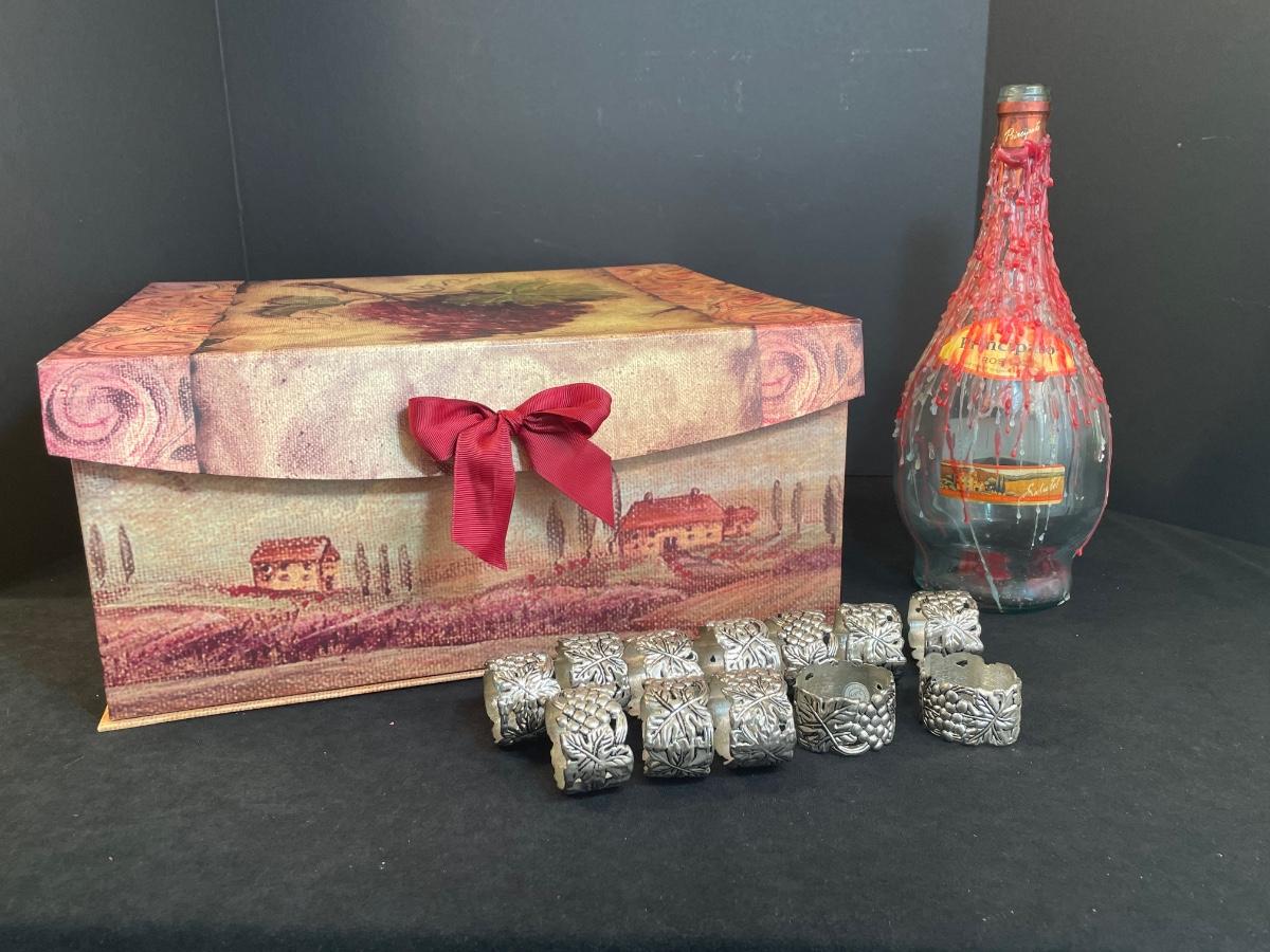 Chianti bottle, scenic storage box, 12 Godinger silver plate napkin rings