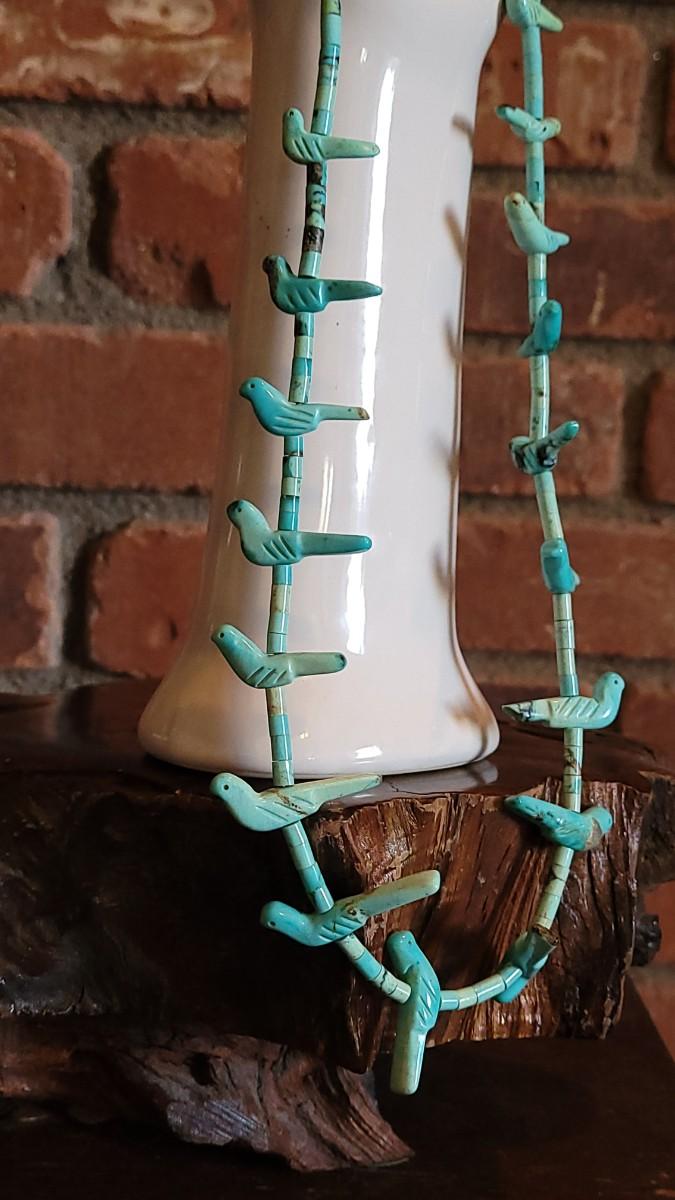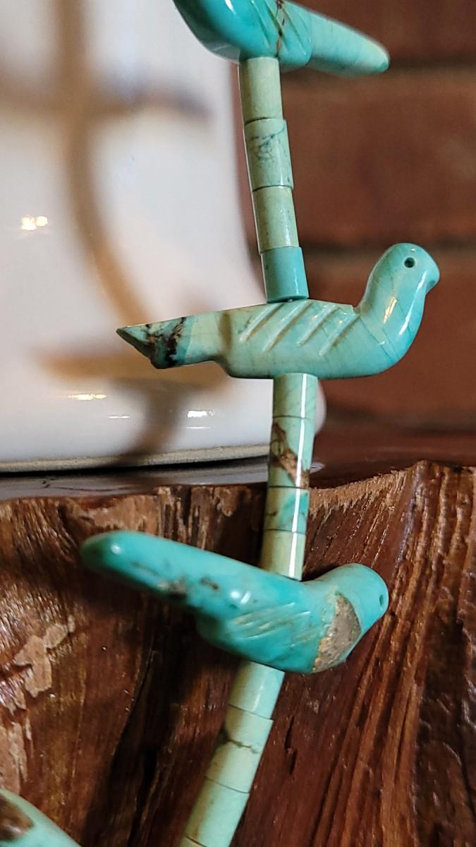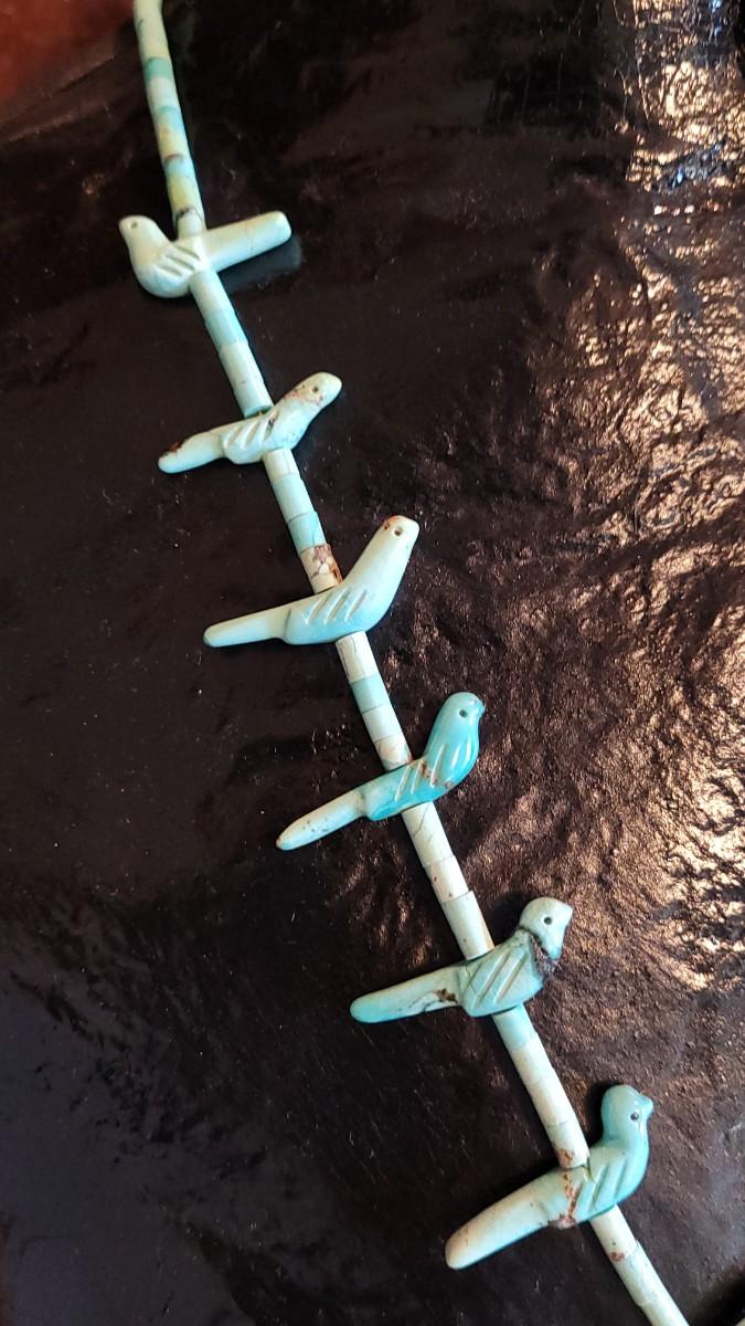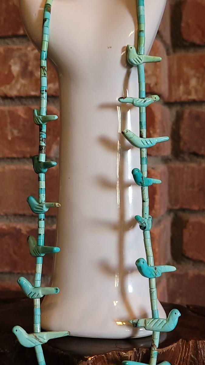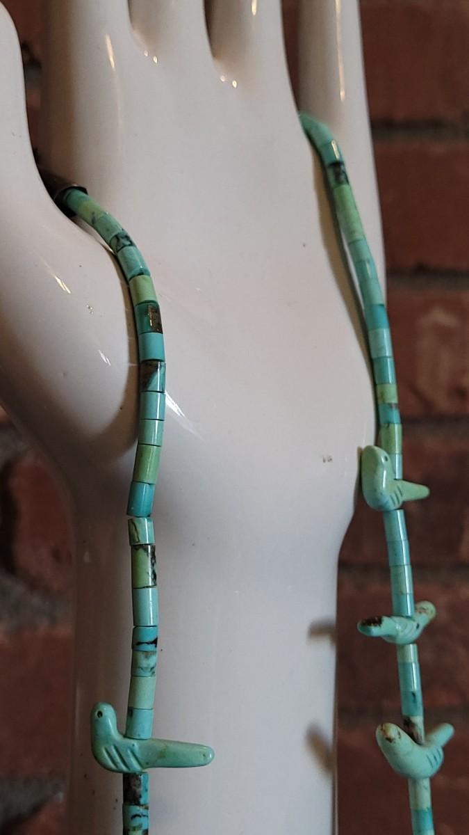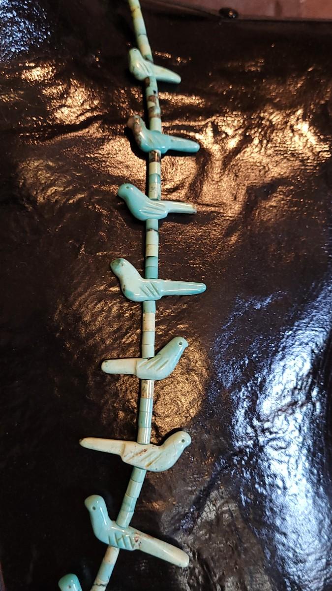 27" long heishi and carved Turquoise bird fetish necklace with sterling silver clasp. One bird has a broken tail.