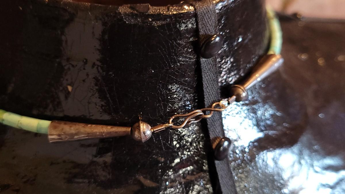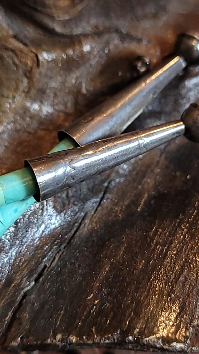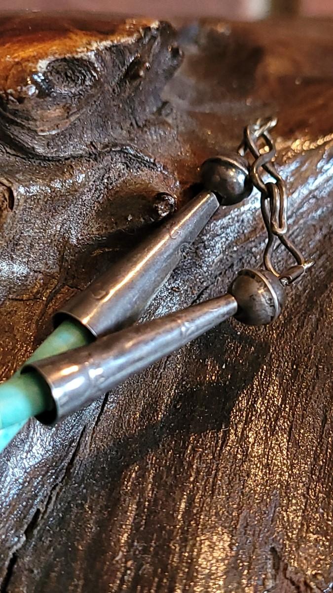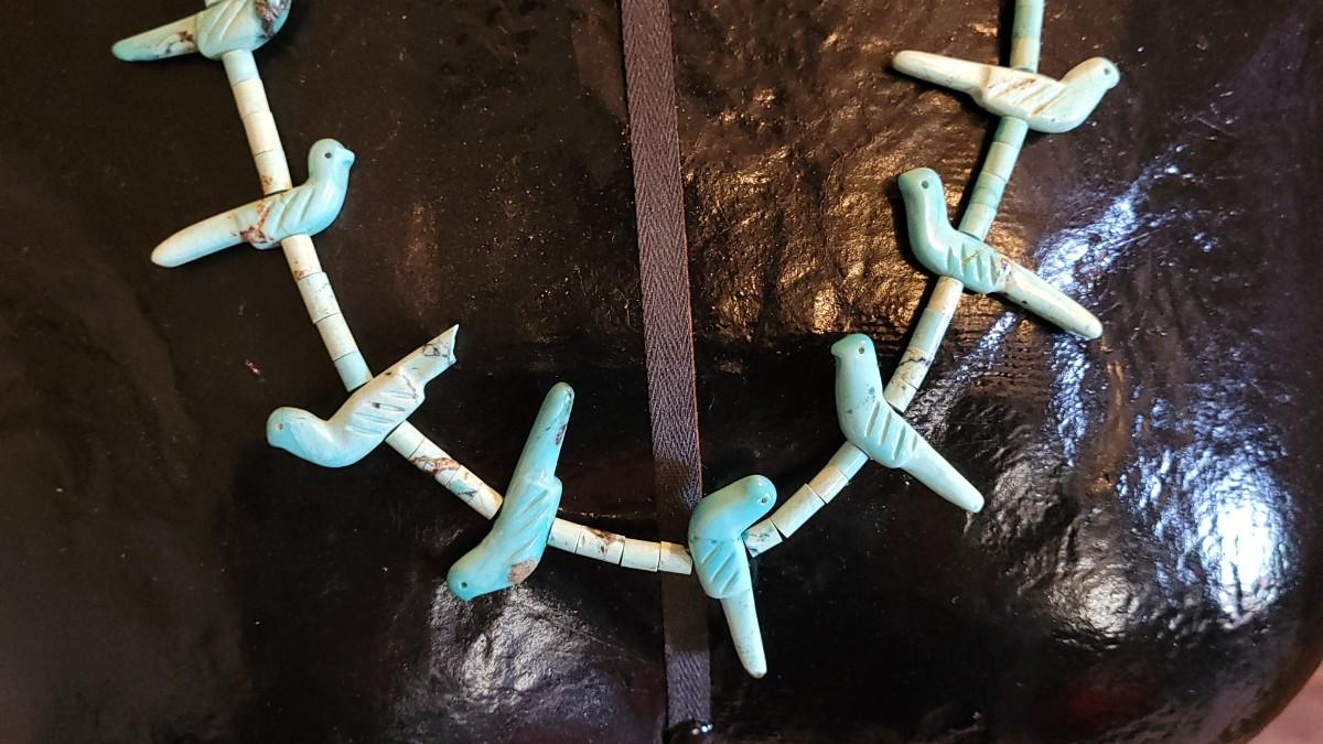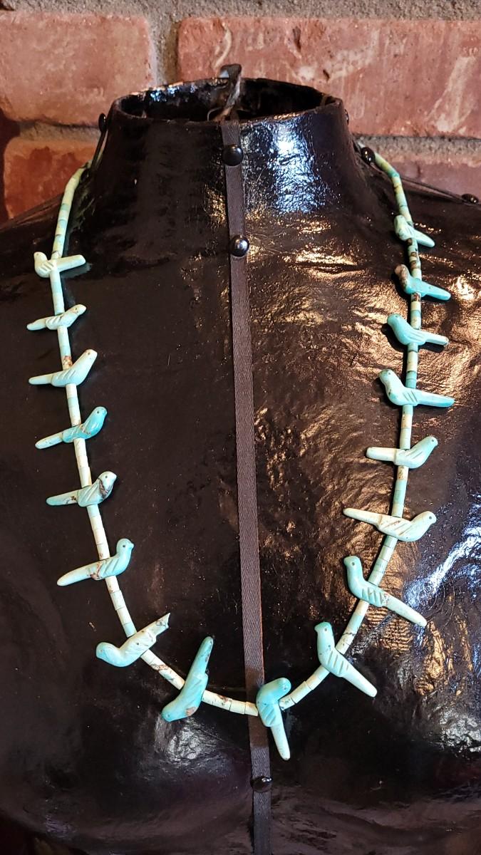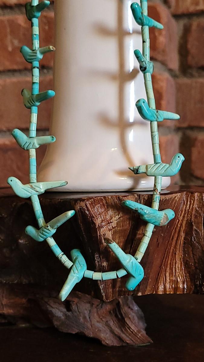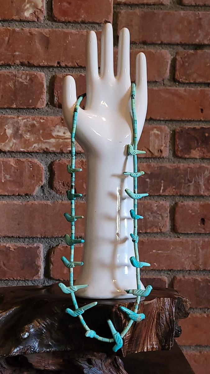 27" long heishi and carved Turquoise bird fetish necklace with sterling silver clasp. One bird has a broken tail.
