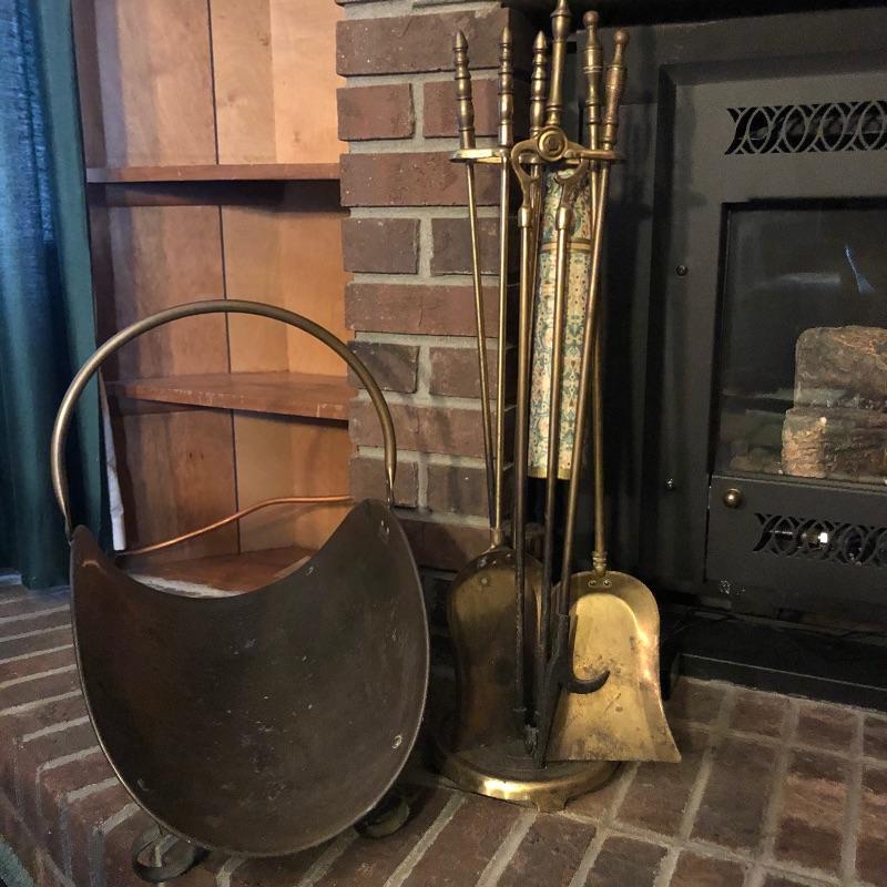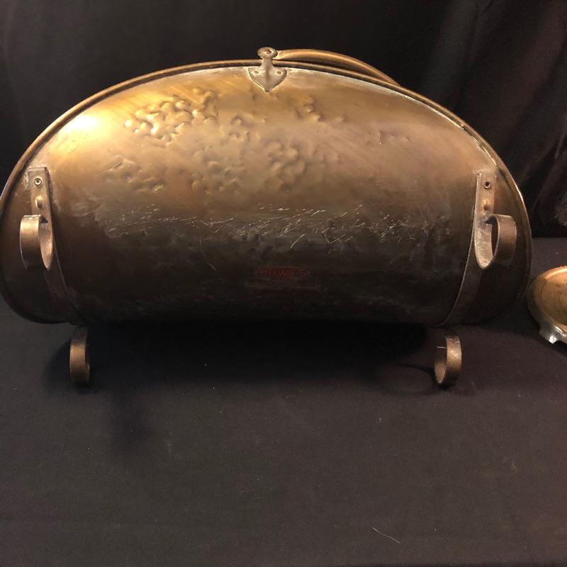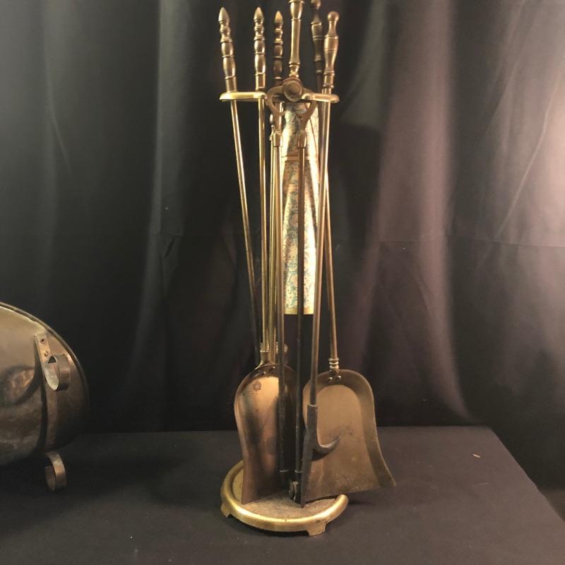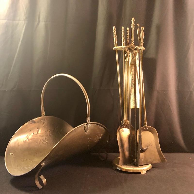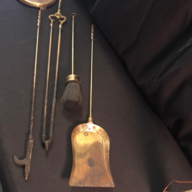 Dress up your fireplace with these antique brass accessories. The firewood carrier with collapsible handle is a hammered brass piece by Howe’s of Boston. We have added what appears to be two sets of fireplace tools. The main set comes with the holder, brush, poker, shovel and tongs. Also included is an additional shovel and poker and safety matches.