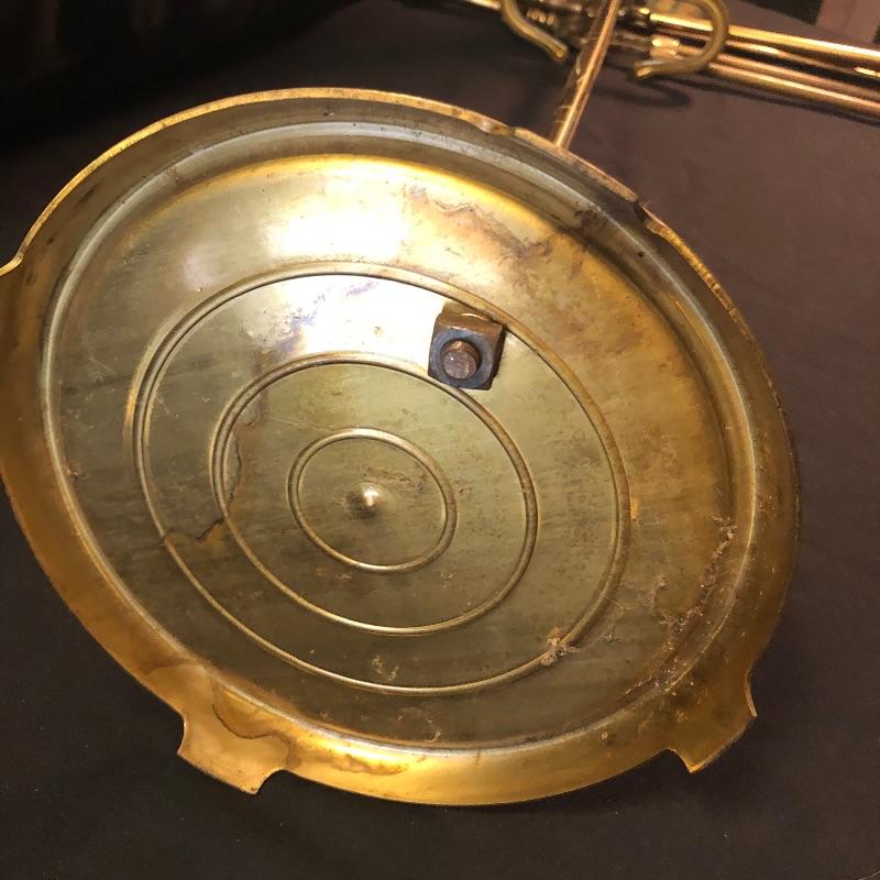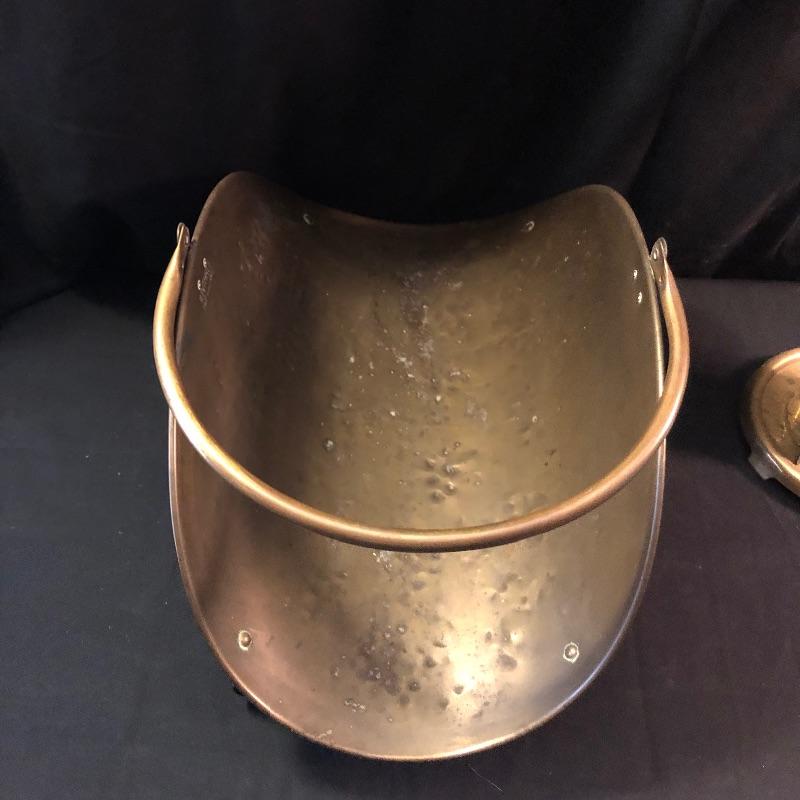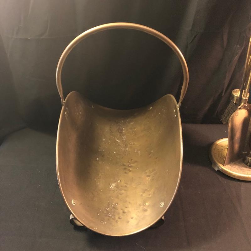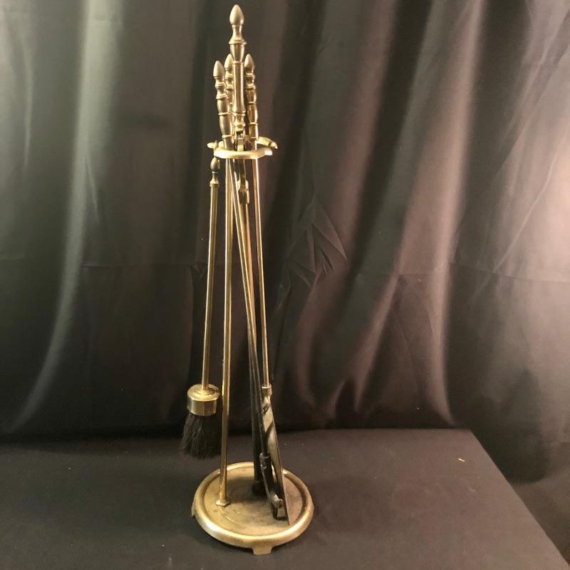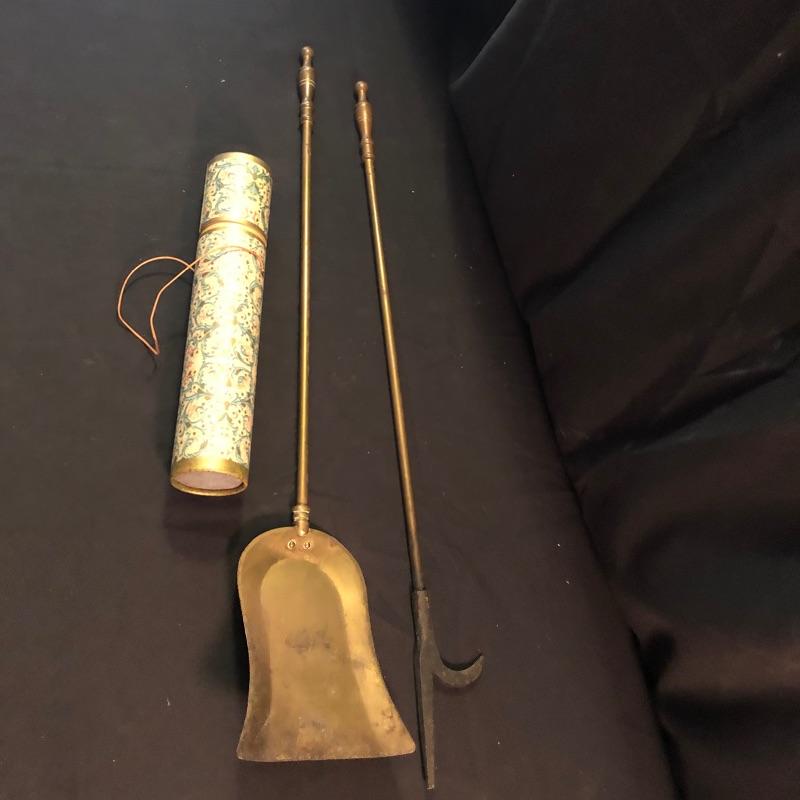 Dress up your fireplace with these antique brass accessories. The firewood carrier with collapsible handle is a hammered brass piece by Howe’s of Boston. We have added what appears to be two sets of fireplace tools. The main set comes with the holder, brush, poker, shovel and tongs. Also included is an additional shovel and poker and safety matches.