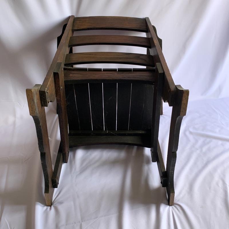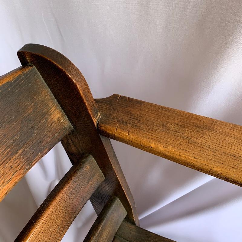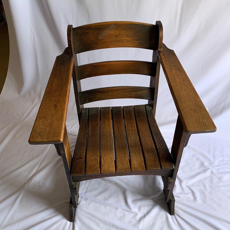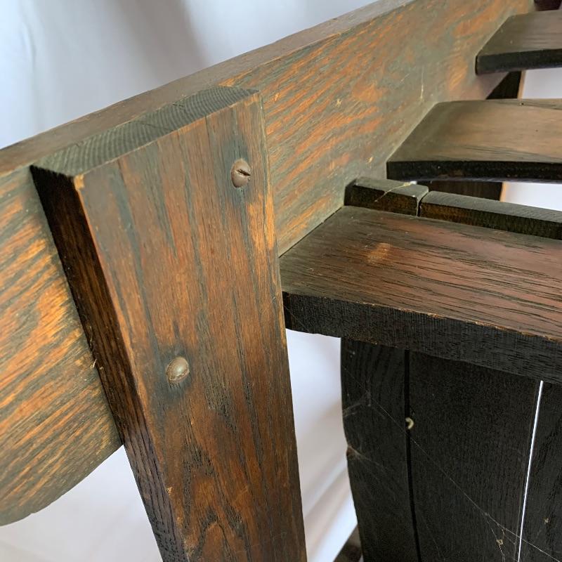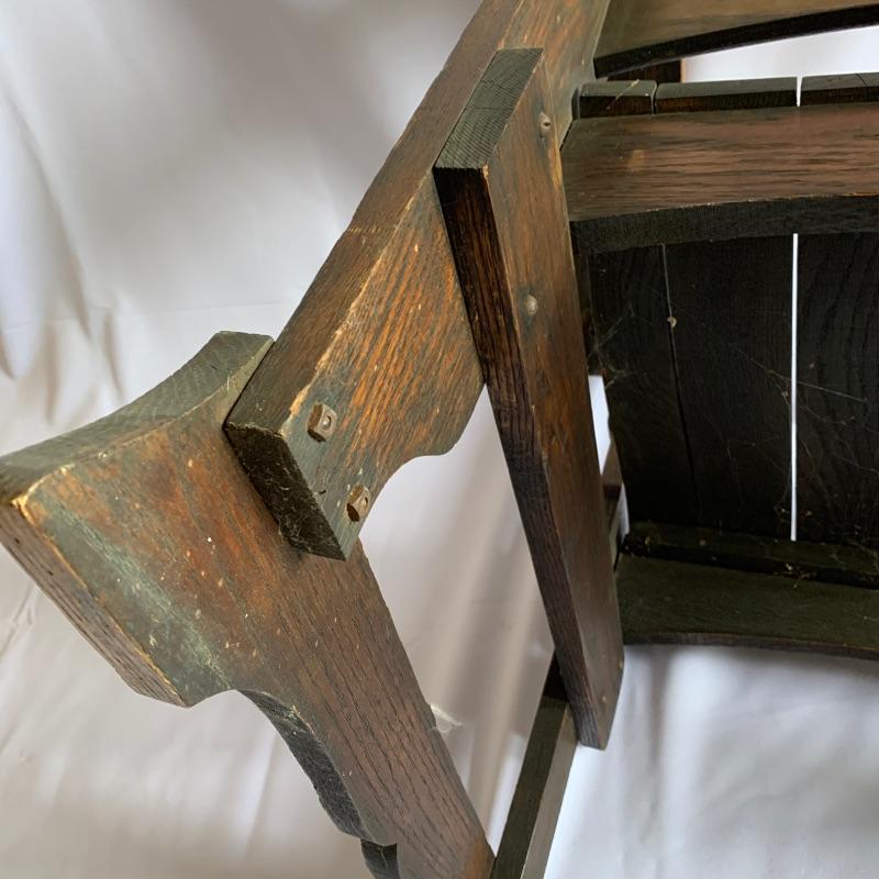 Arts & Crafts wooden chair. Nice solidly made with metal hardware chair that has a few nicks and scratches and is a little unstable, see pictures. Executor of estate has told us that this is a Limbert Outdoor Chair.
