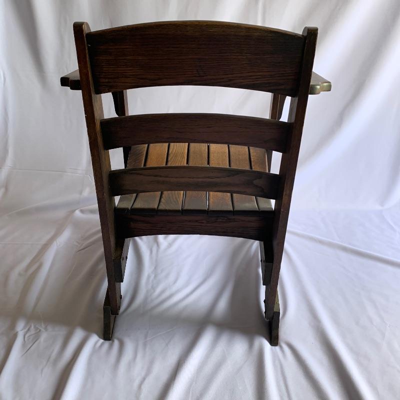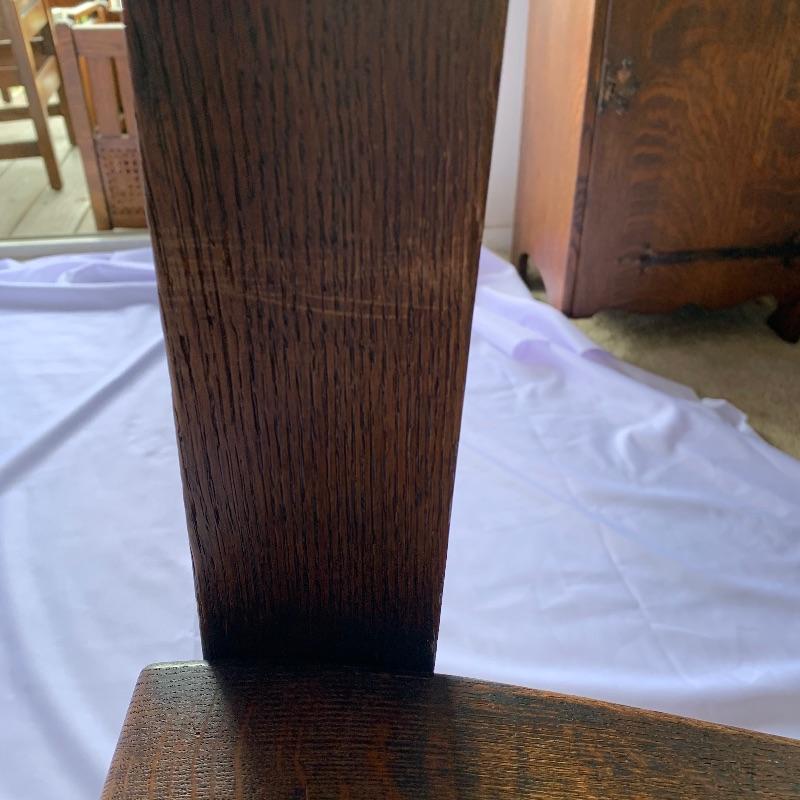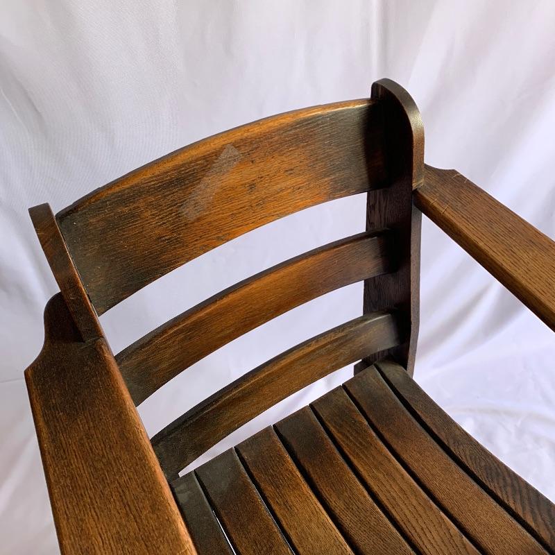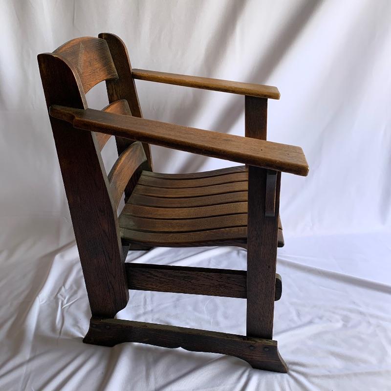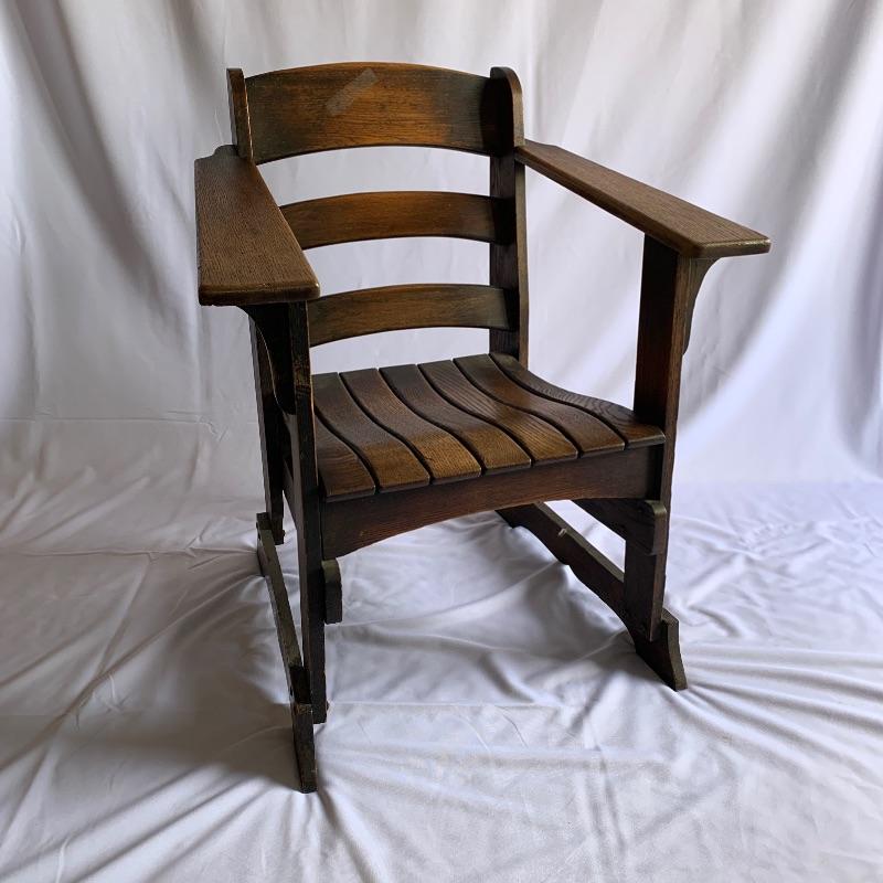 Arts & Crafts wooden chair. Nice solidly made with metal hardware chair that has a few nicks and scratches and is a little unstable, see pictures. Executor of estate has told us that this is a Limbert Outdoor Chair.