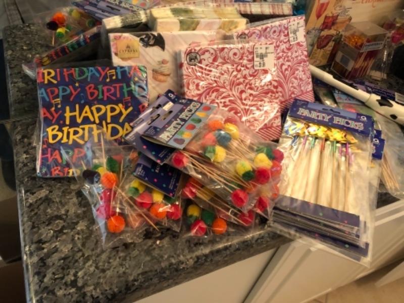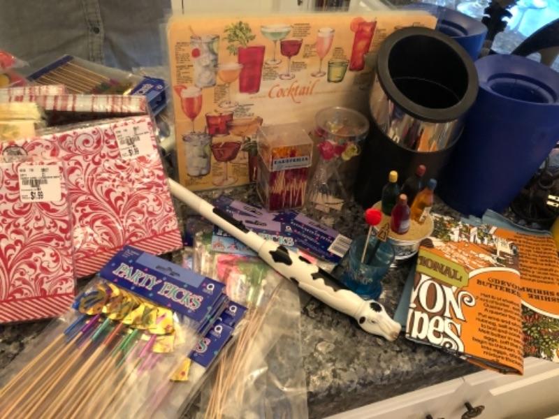 Lot 69. Assorted party napkins, hors d’oeuvres picks, art deco lamp, Stiletto wine bottle holder, tea towels, cocktail recipes, placemats, etc.--WAS $45““NOW $22.50