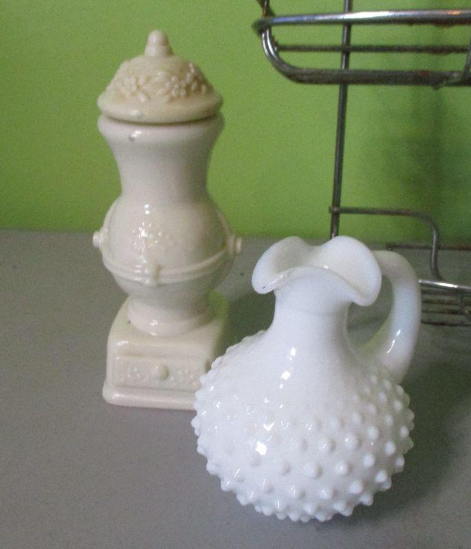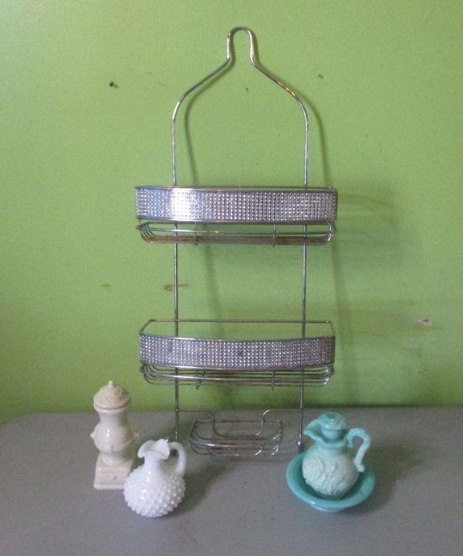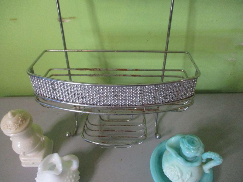 The shower caddy needs a visit from some steel wool, but it will add some bling to your shower. The three collectibles are all avon and in great shape. The milk glass one is missing it's stopper, but would made a nice little vase or candle holder.