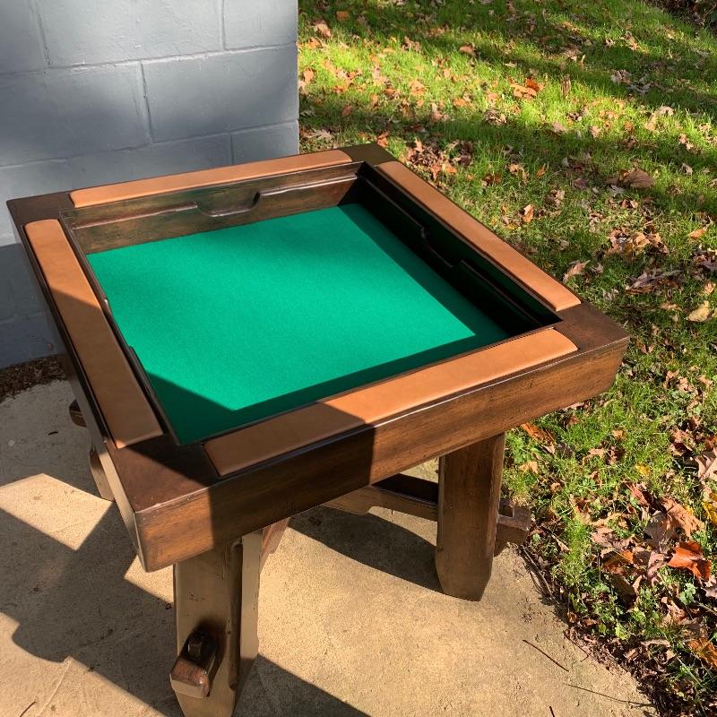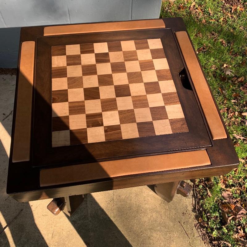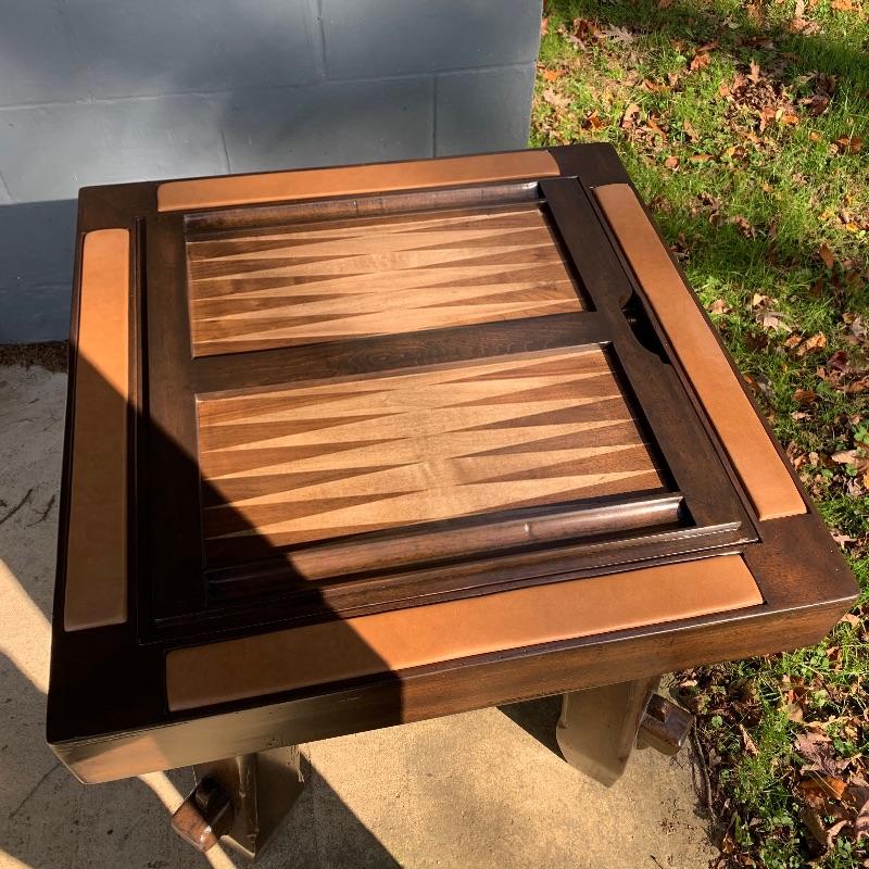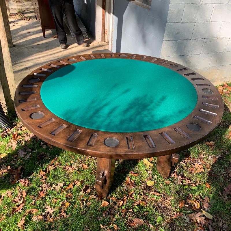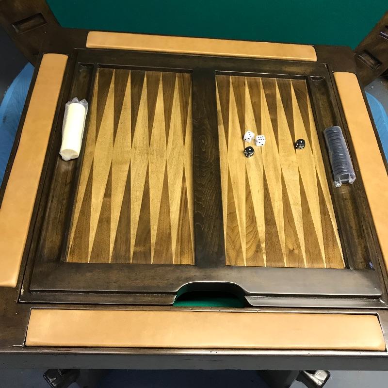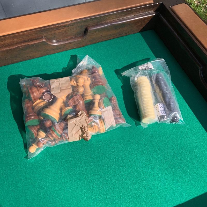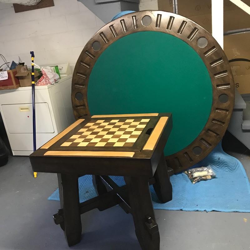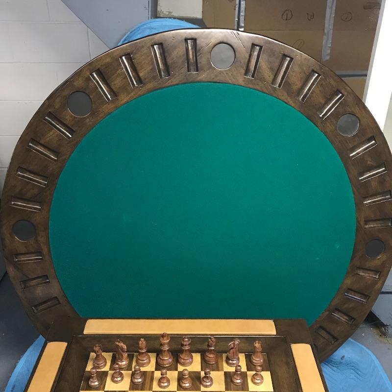 Woah. This is one amazing work of art! Bausman gaming table measures approximately 30”sq x 29” with a separate poker/dining table top measuring about a 5ft diameter and 1.5” thick solid wood. Poker side has chip and cup holders built in and smooth table side is a sunburst pie top with hi lo planking (just stunning). The gaming table has a board of chess/checker on one side and backgammon on the reverse. It has a felt lined storage area that’s about 2” deep with game board inserted. Piece also has leather-like palm rests which probably double as padding when tabletop is on. All surfaces are in very nice condition, the wood has lovely grain, dark stain with some natural texture. Lot also features a full backgammon game piece set and a stunning wooden chess set. Please bring help to load. Local pick up only.