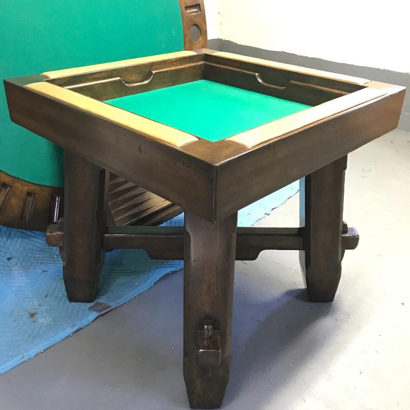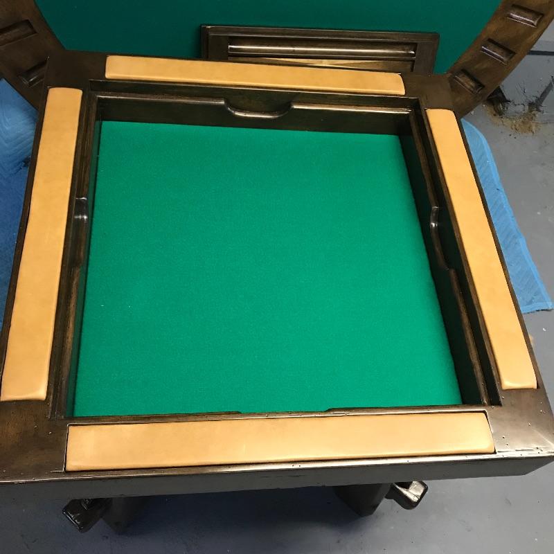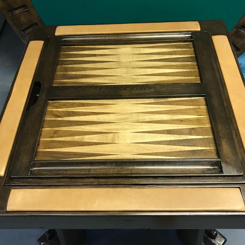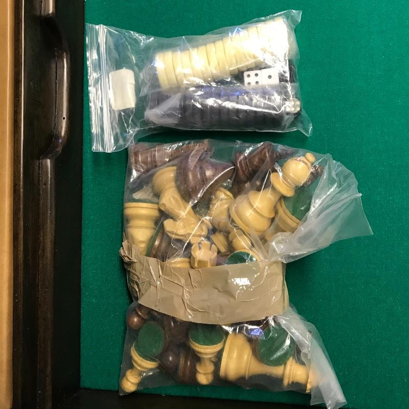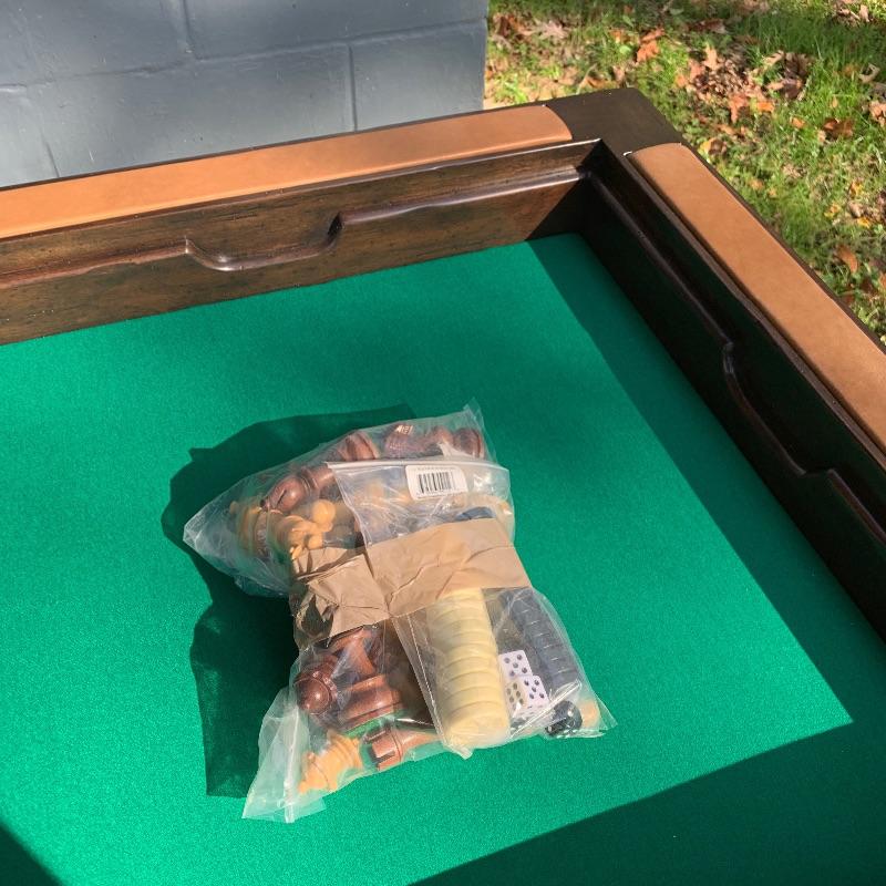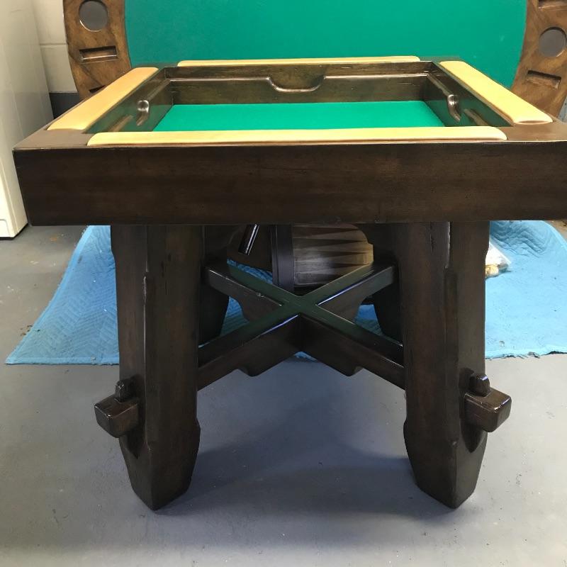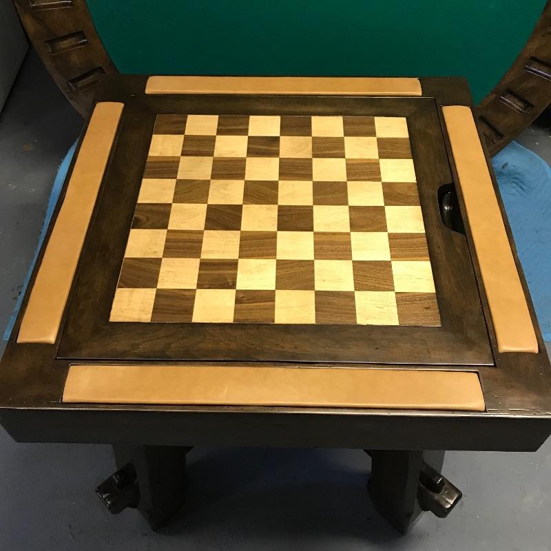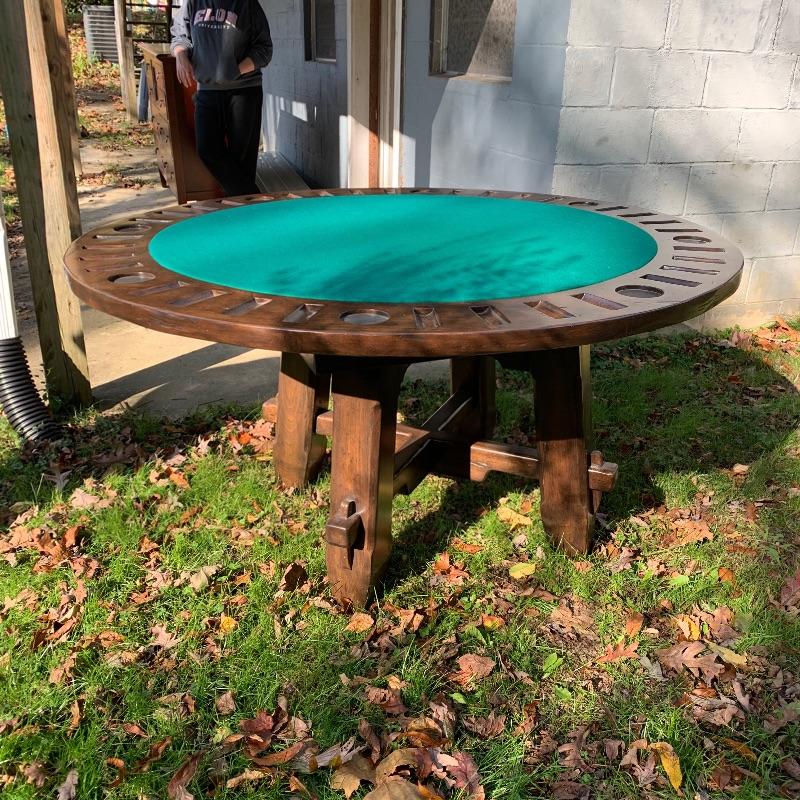 Woah. This is one amazing work of art! Bausman gaming table measures approximately 30”sq x 29” with a separate poker/dining table top measuring about a 5ft diameter and 1.5” thick solid wood. Poker side has chip and cup holders built in and smooth table side is a sunburst pie top with hi lo planking (just stunning). The gaming table has a board of chess/checker on one side and backgammon on the reverse. It has a felt lined storage area that’s about 2” deep with game board inserted. Piece also has leather-like palm rests which probably double as padding when tabletop is on. All surfaces are in very nice condition, the wood has lovely grain, dark stain with some natural texture. Lot also features a full backgammon game piece set and a stunning wooden chess set. Please bring help to load. Local pick up only.