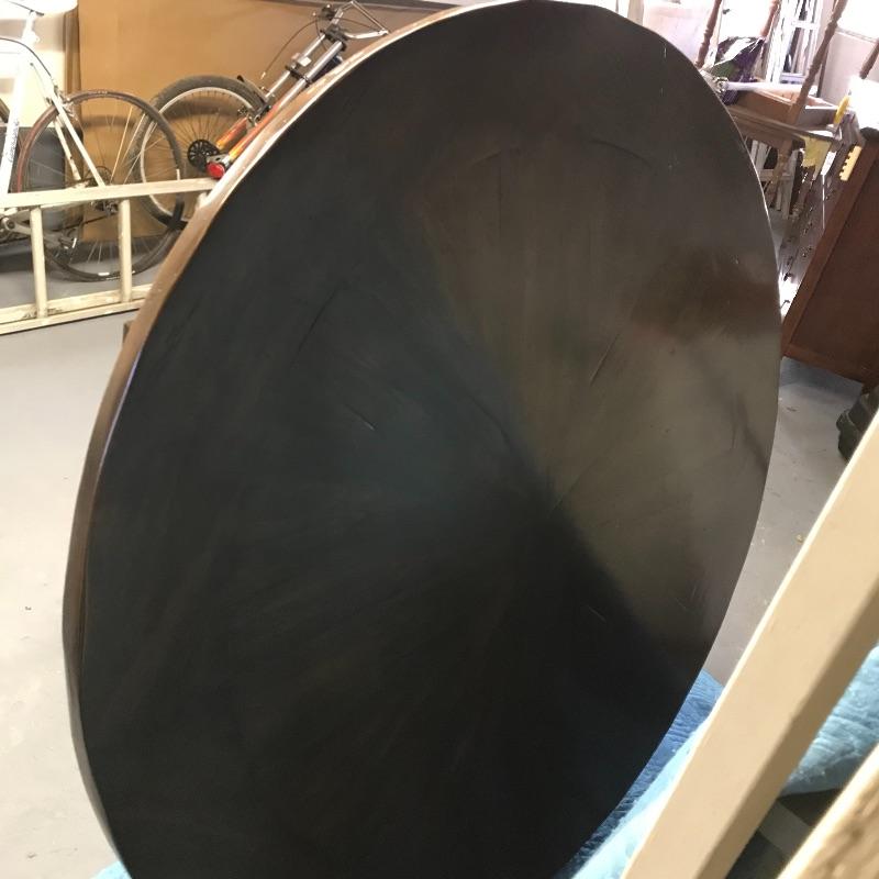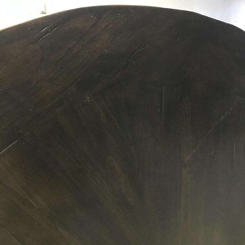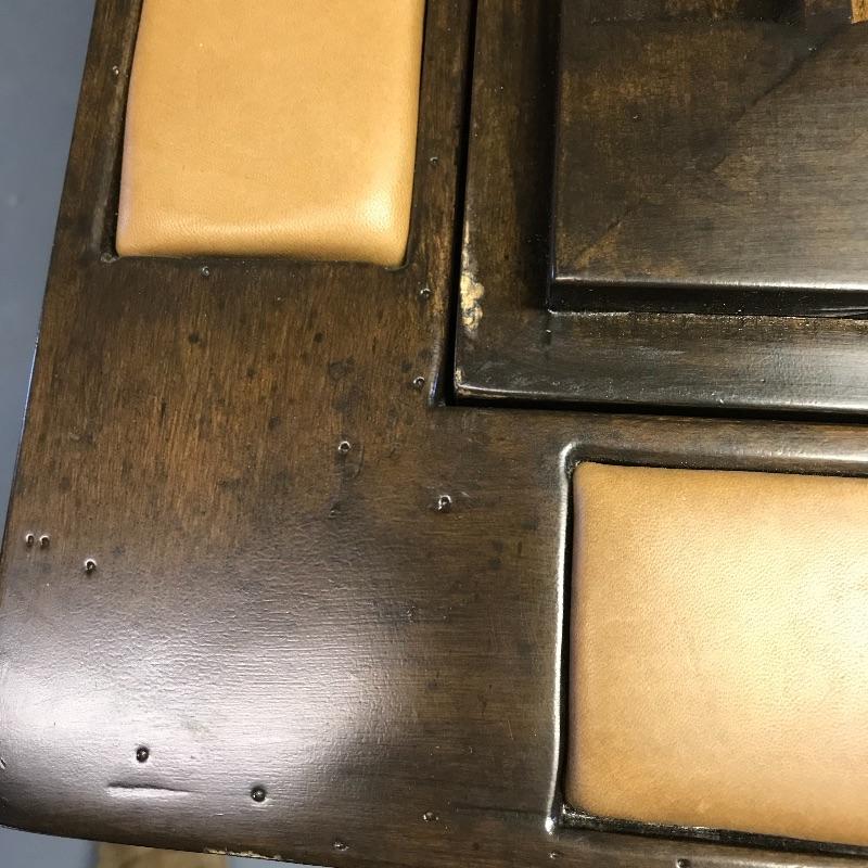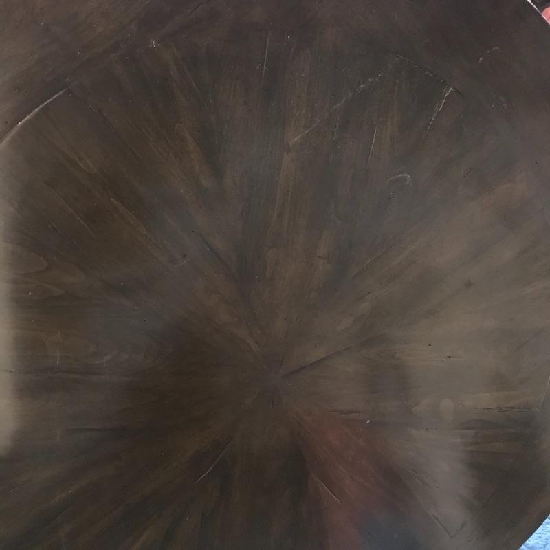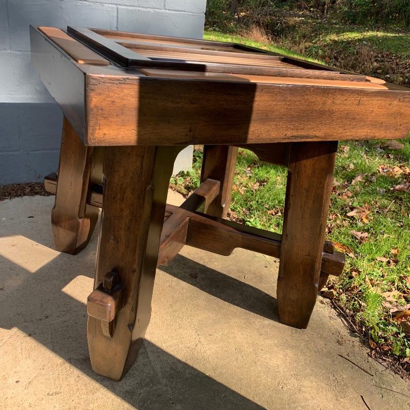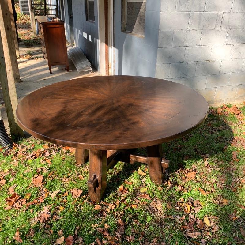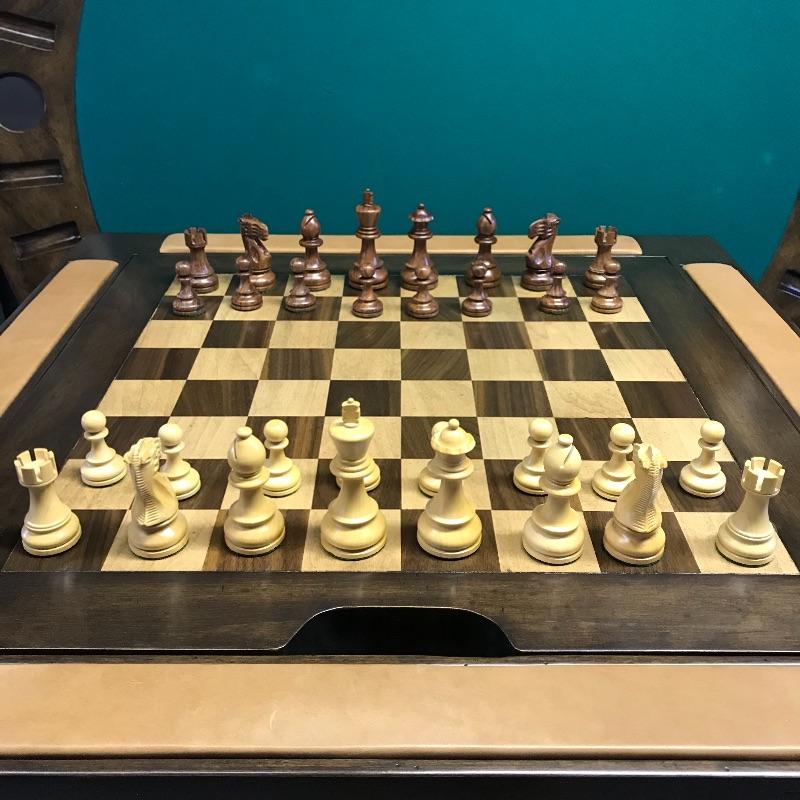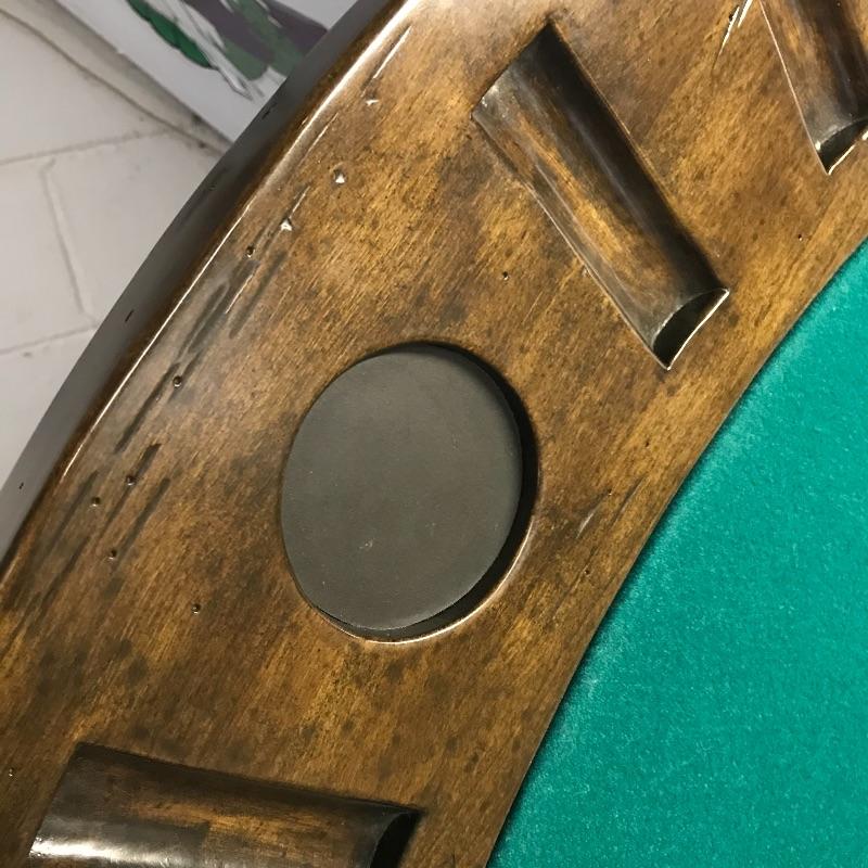 Woah. This is one amazing work of art! Bausman gaming table measures approximately 30”sq x 29” with a separate poker/dining table top measuring about a 5ft diameter and 1.5” thick solid wood. Poker side has chip and cup holders built in and smooth table side is a sunburst pie top with hi lo planking (just stunning). The gaming table has a board of chess/checker on one side and backgammon on the reverse. It has a felt lined storage area that’s about 2” deep with game board inserted. Piece also has leather-like palm rests which probably double as padding when tabletop is on. All surfaces are in very nice condition, the wood has lovely grain, dark stain with some natural texture. Lot also features a full backgammon game piece set and a stunning wooden chess set. Please bring help to load. Local pick up only.