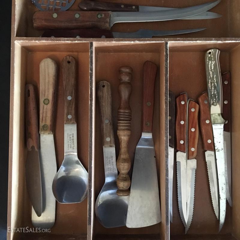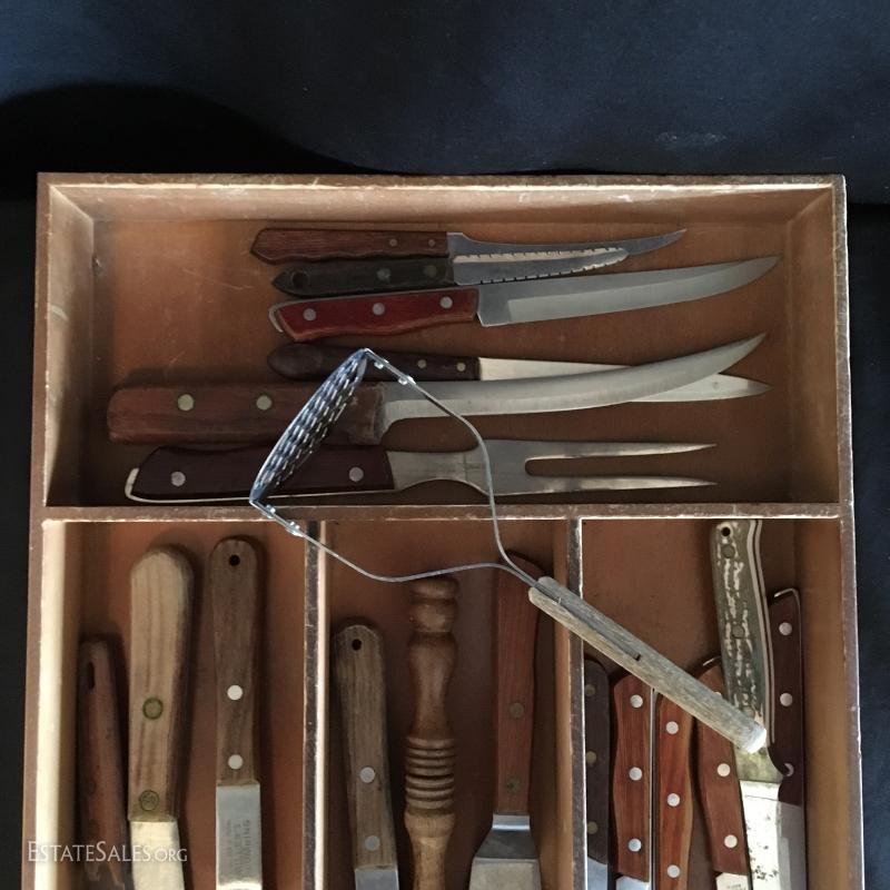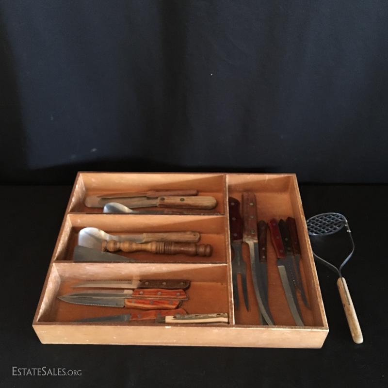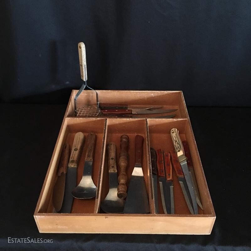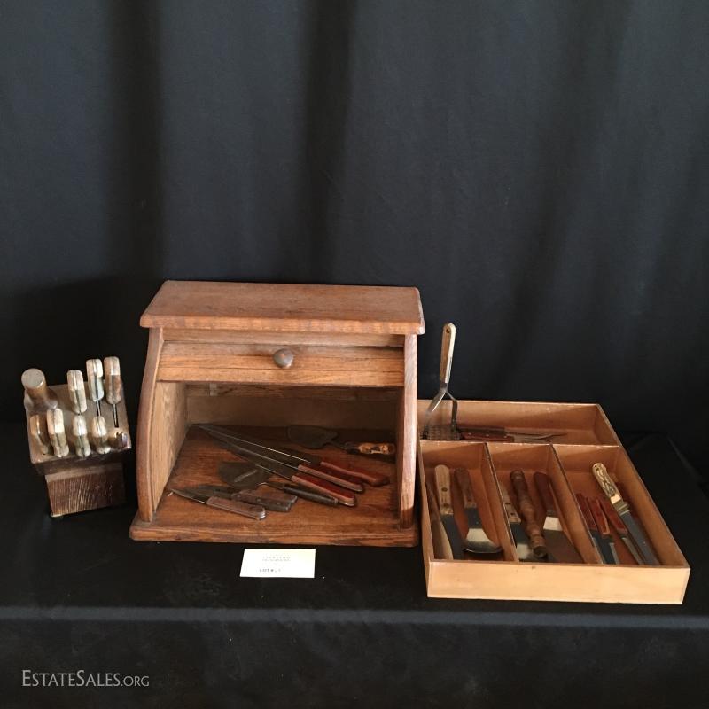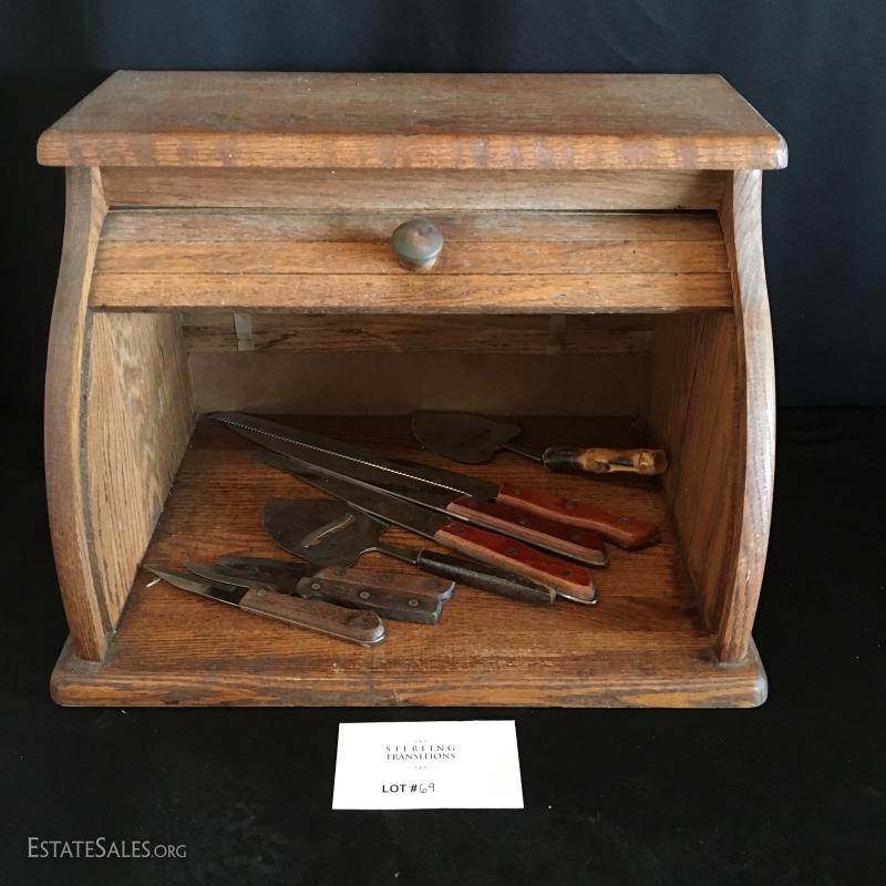 LOT 69- Bread box, Kitchen Knives, Utensils