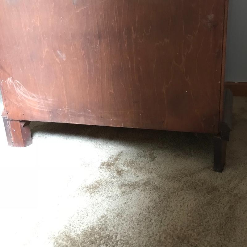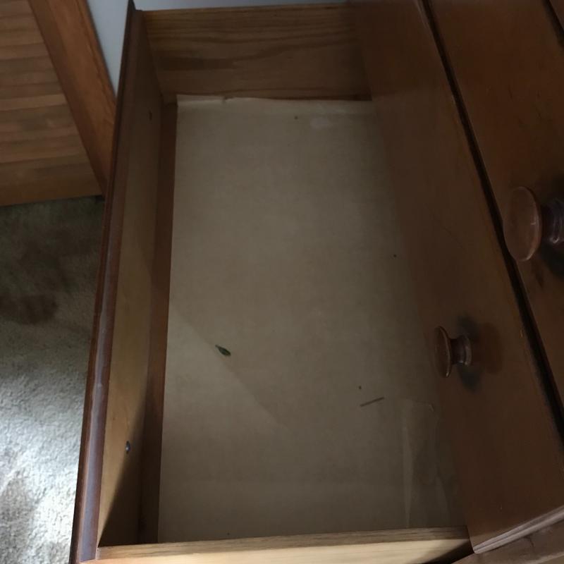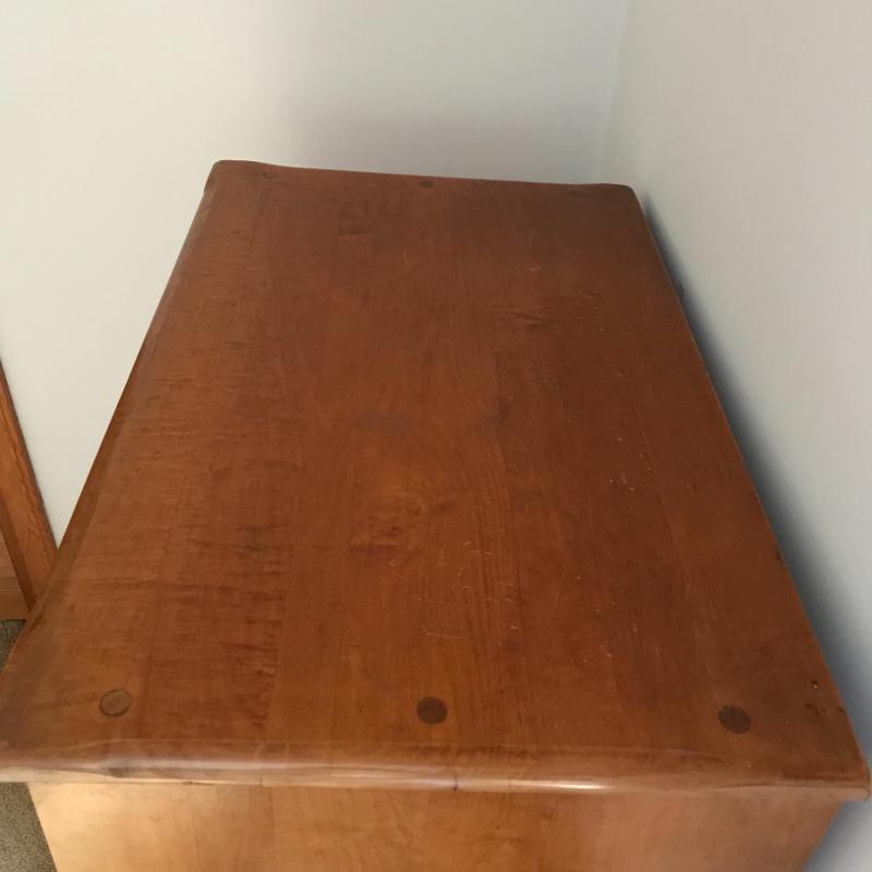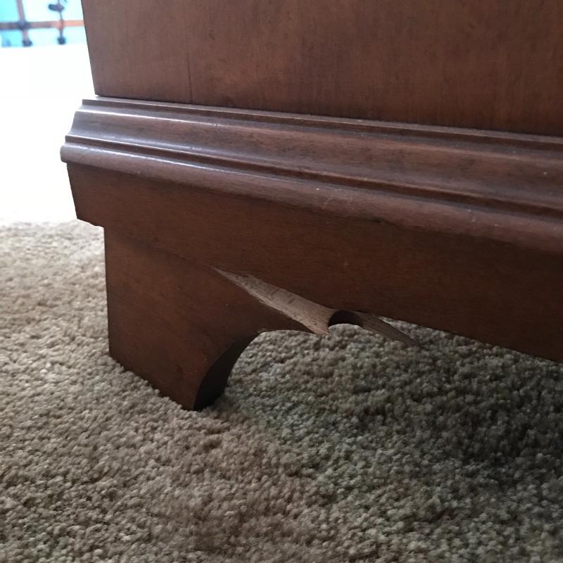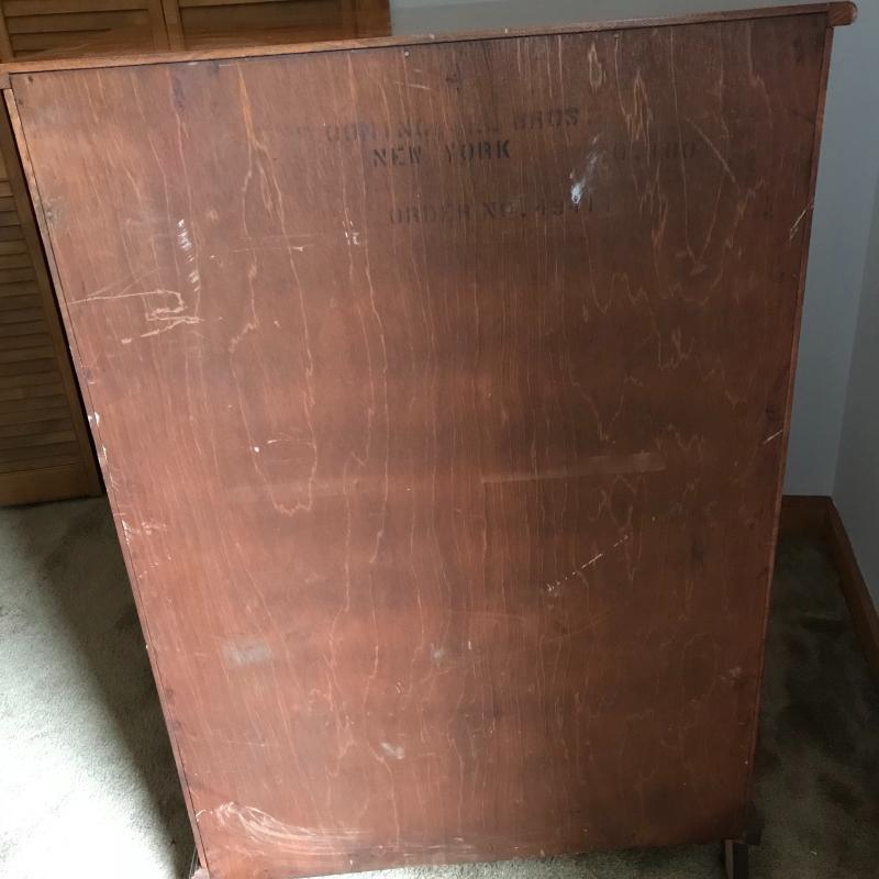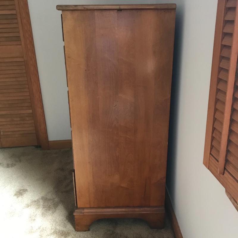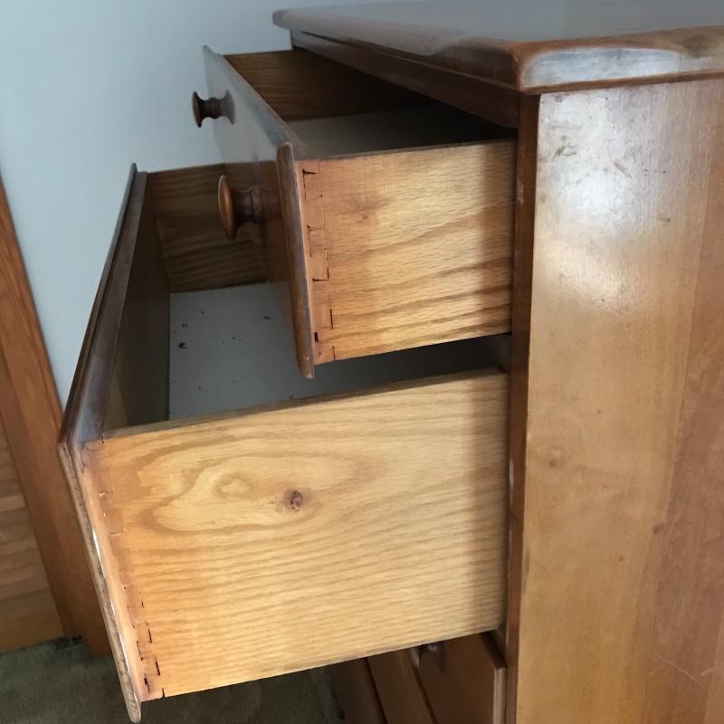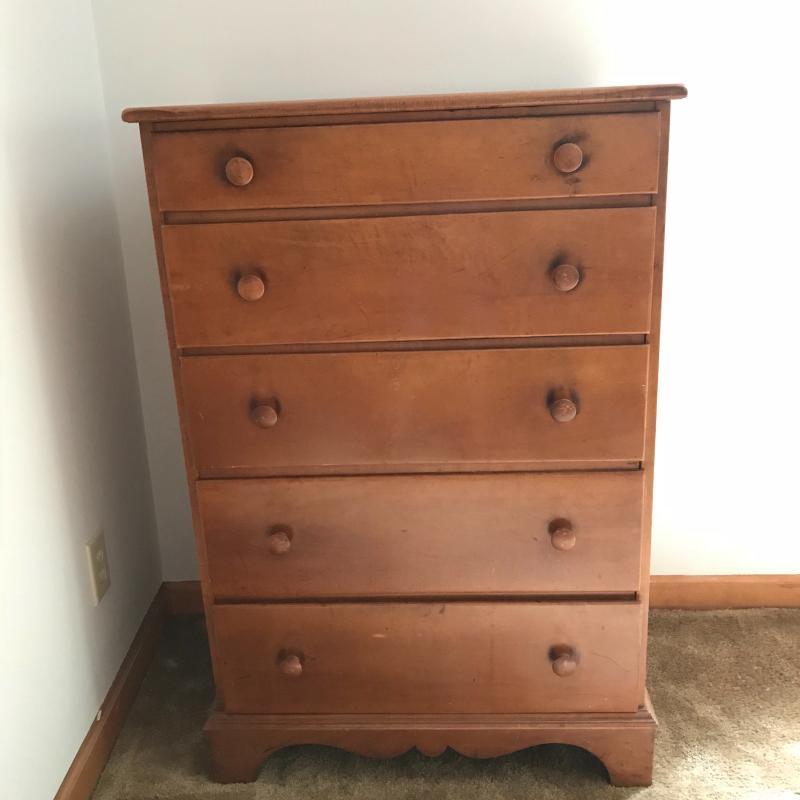 Five drawer dresser with wood handles and dovetail drawers. Appears to be solid wood. Back foot is in need of repair and stabilization, see photos. Otherwise dresser is sturdy and a great find measuring 30” x 19” x 45”. No shipping.