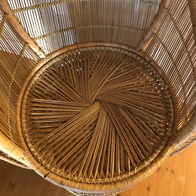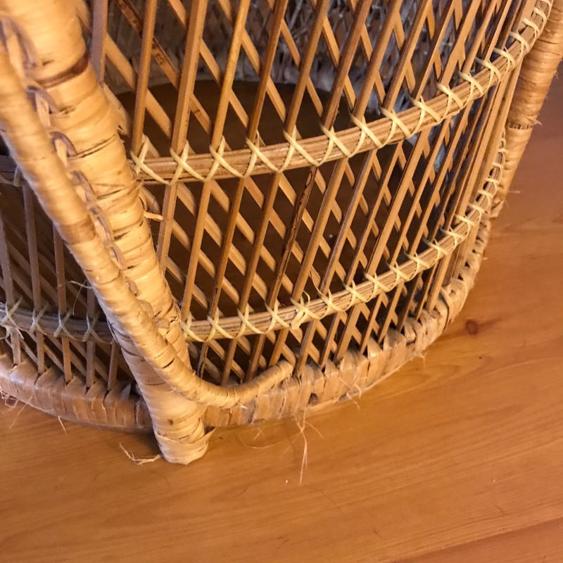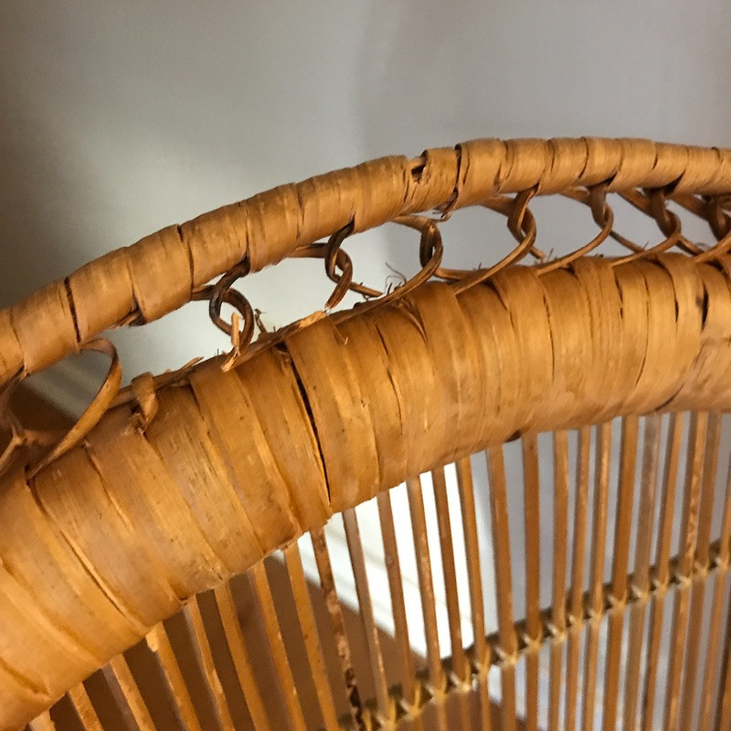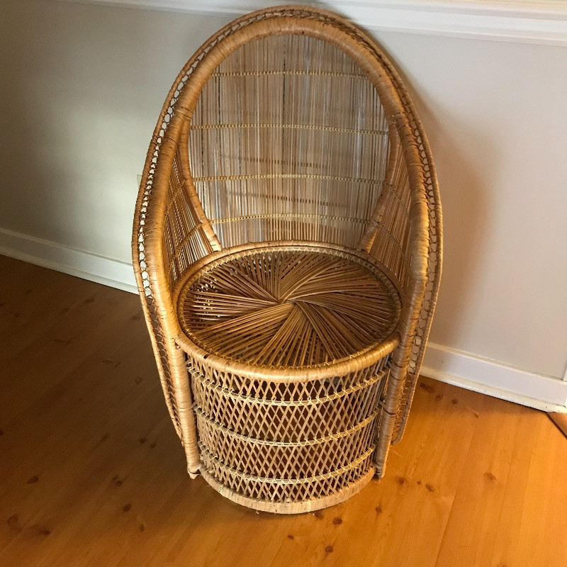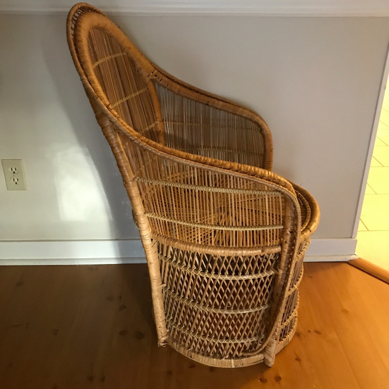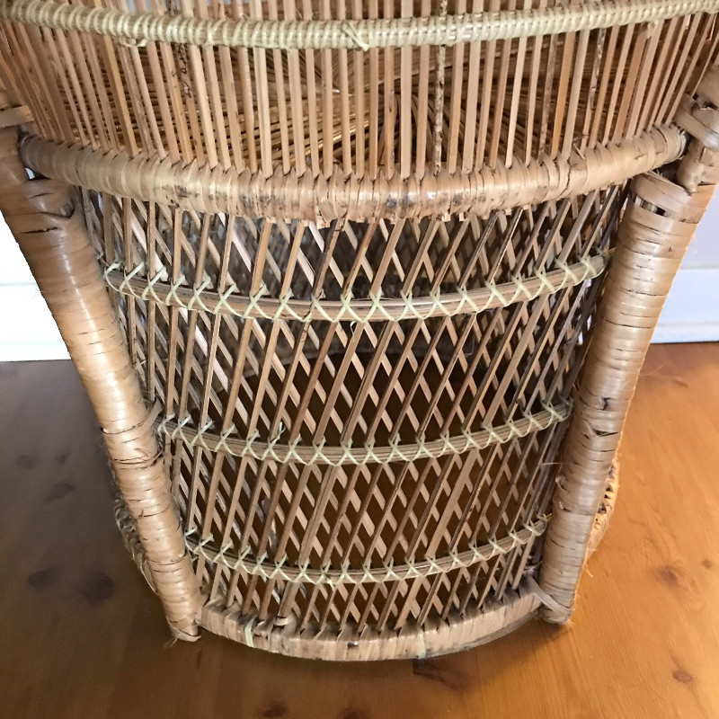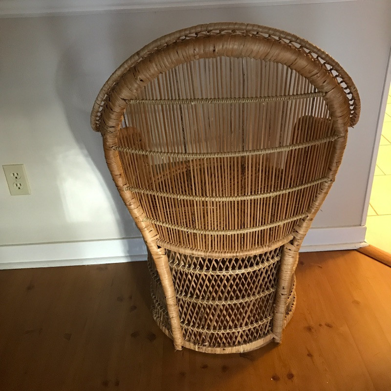 Awesome patio chair made of wicker with round seat. Has different woven designs throughout. It shows it’s age a little on some of the wicker but it is sturdy. Would look great as an accent chair in a sunroom! Add a cushion for comfort or decor. Measures approx 24” x 21.5” x 35”. No shipping.