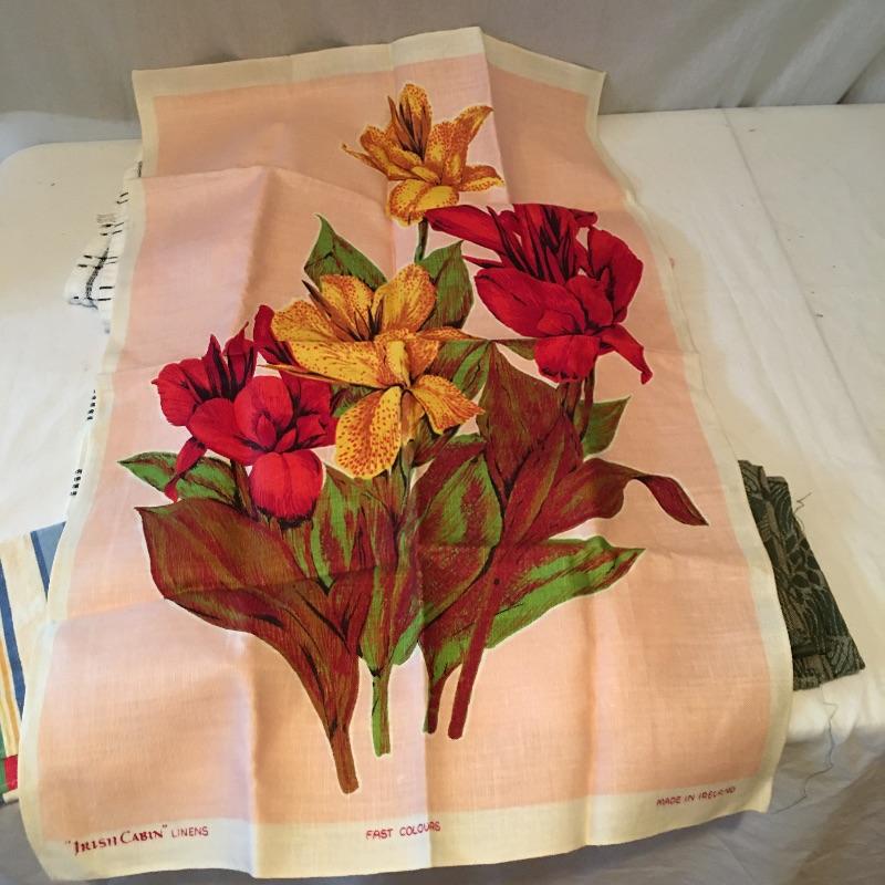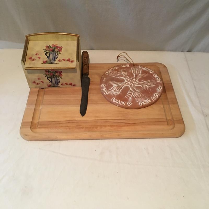 Lot includes wooden cutting board, bread knife, recipe box, terra cotta wall art and a selection of tea and dish towels.