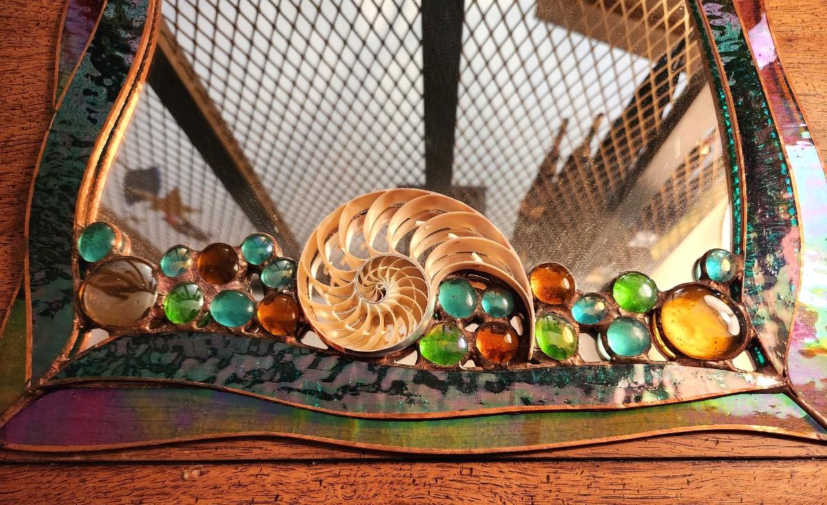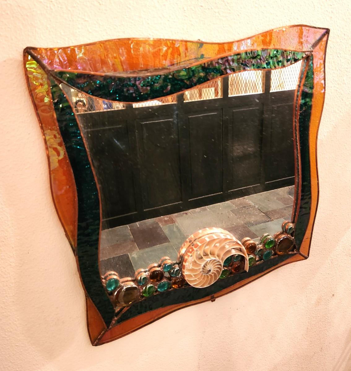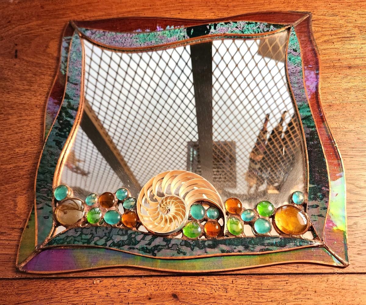This looks like an artisan piece, though I could not find a signature....nice mirror with stained glass border and accents, mixed media. Oceanic motif. 14" x 14". Good condition.