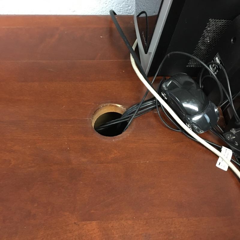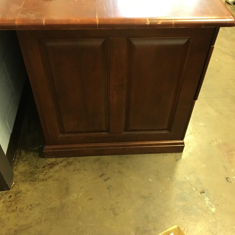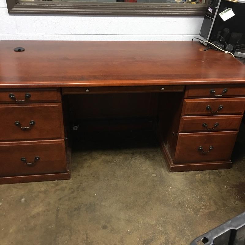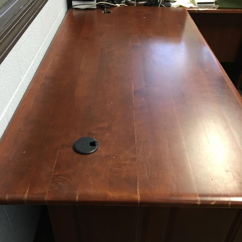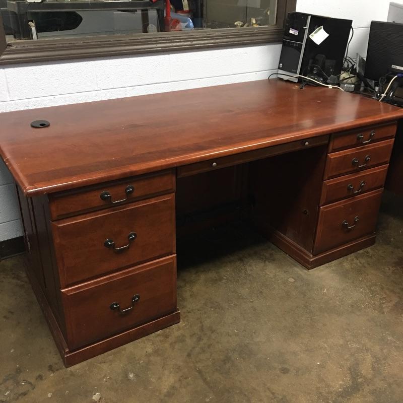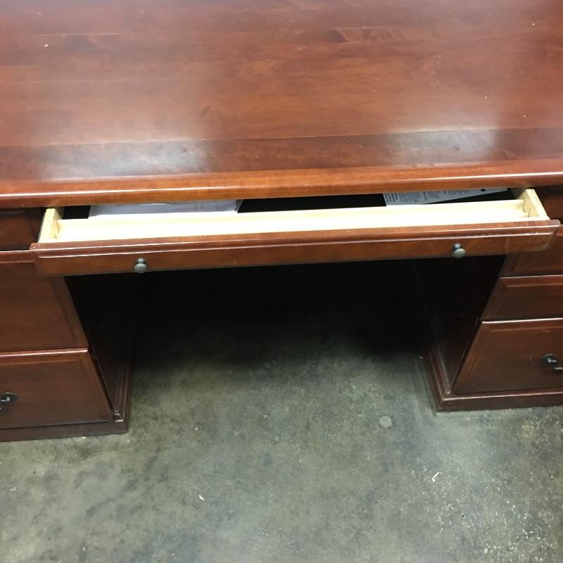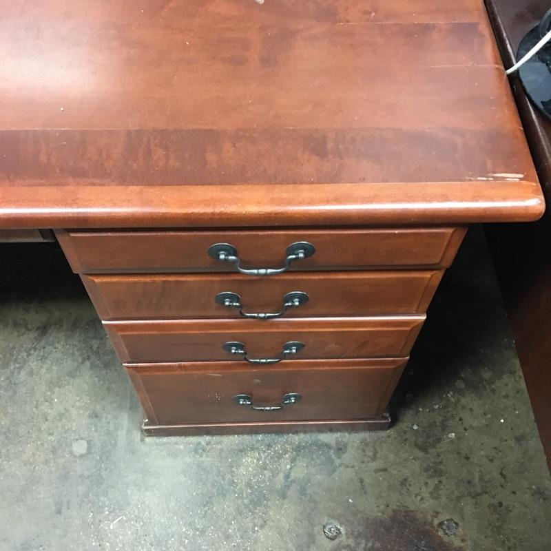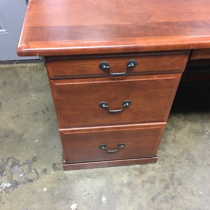 Large desk with three file drawers and five smaller drawers and two openings on top of desk for cables to go down to built in plugs. Computer and accessories not included.Desk has some scratches, but is still a very nice desk, see pictures. Desk measures 35.5” x 72” x 30.5”. Bring help item is substantial.