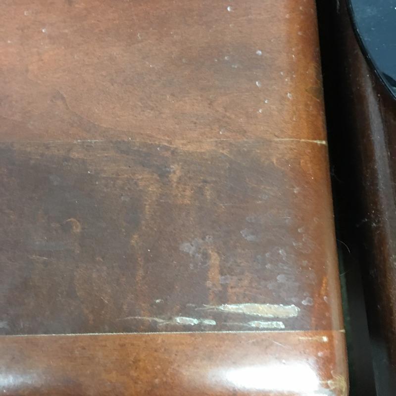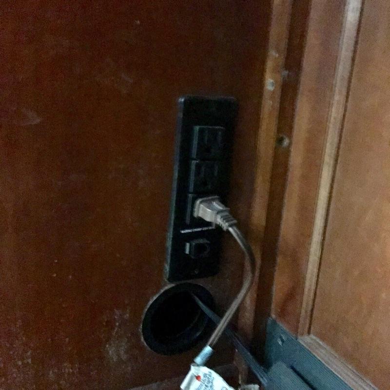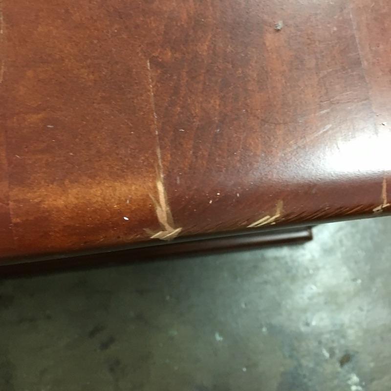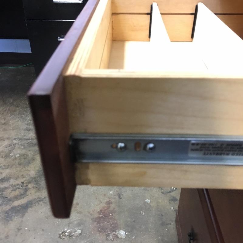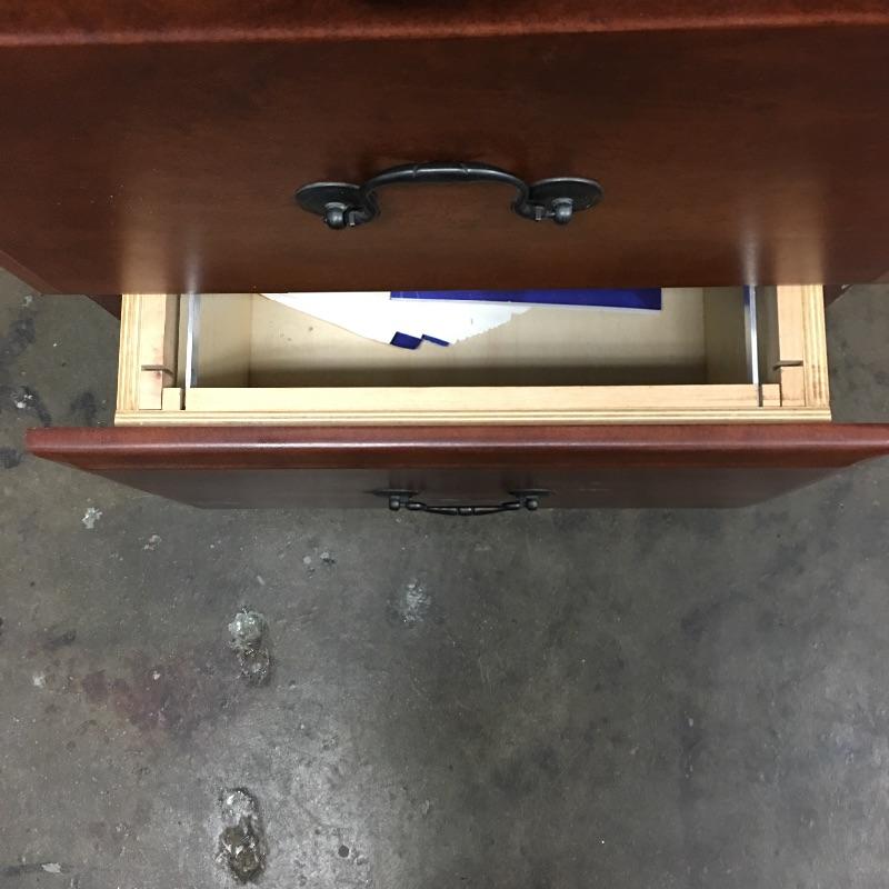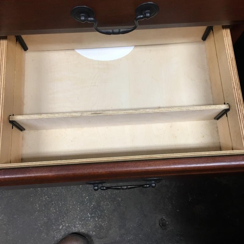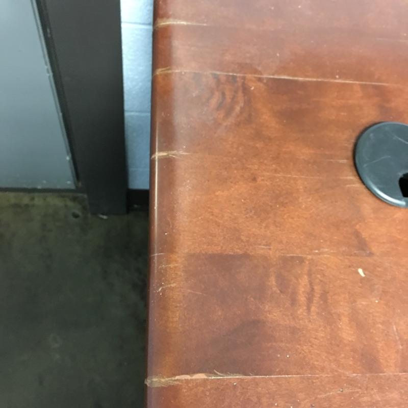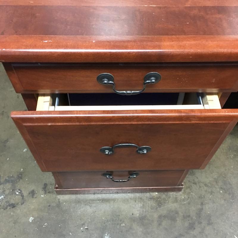 Large desk with three file drawers and five smaller drawers and two openings on top of desk for cables to go down to built in plugs. Computer and accessories not included.Desk has some scratches, but is still a very nice desk, see pictures. Desk measures 35.5” x 72” x 30.5”. Bring help item is substantial.