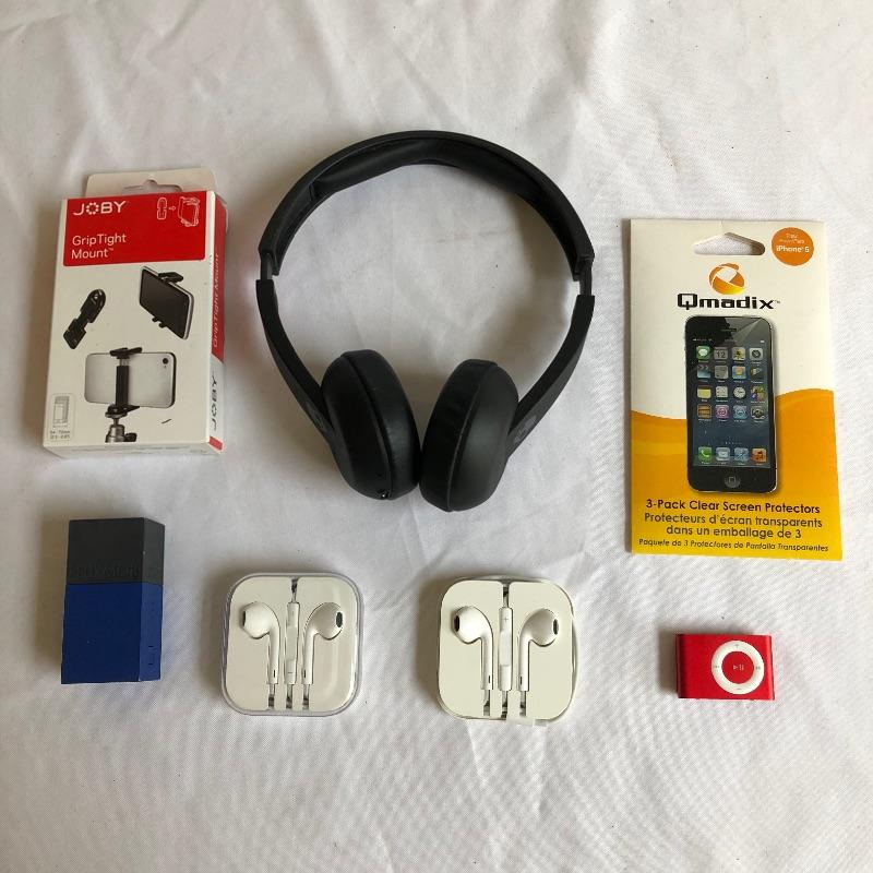 This lot includes a variety of electronics and electronic accessories. Skull Candy headphones and two sets of Apple earbuds pair perfectly with the Apple iPod Shuffle. The Fluxmob power bank and micro USB cord will have you set for charging! See photos for other accessories. Earbuds/headphones/ipod not tested. Power bank turns on and lights up, but has not been tested. Shipping available.