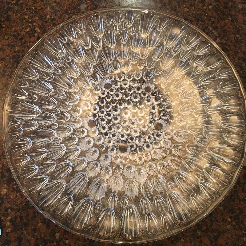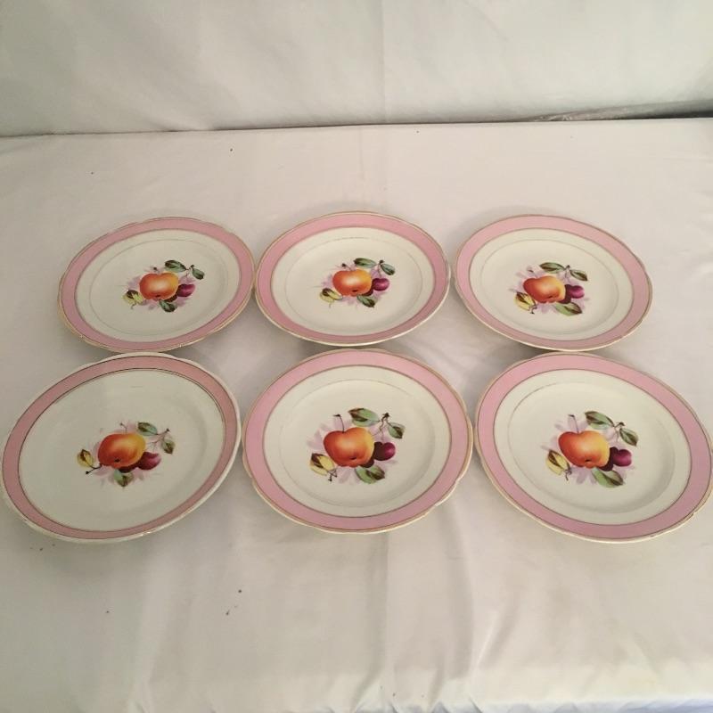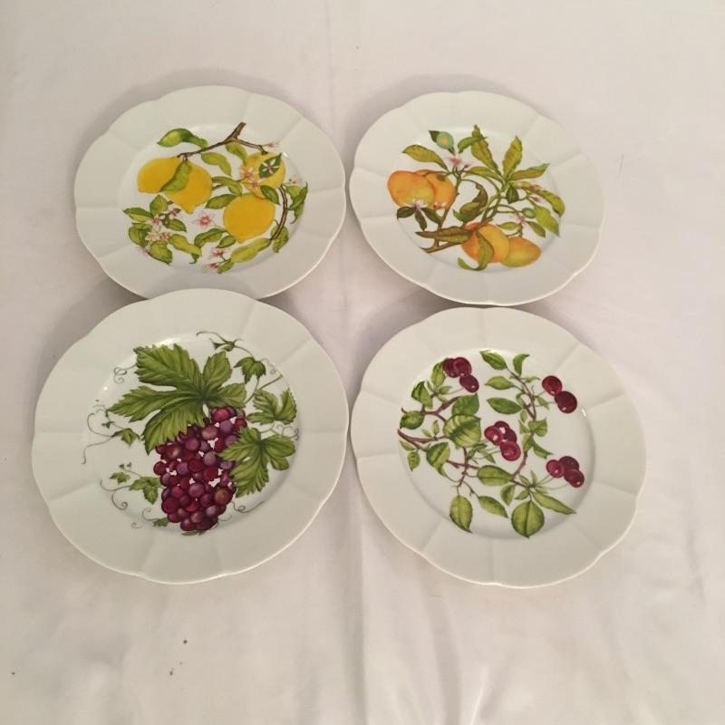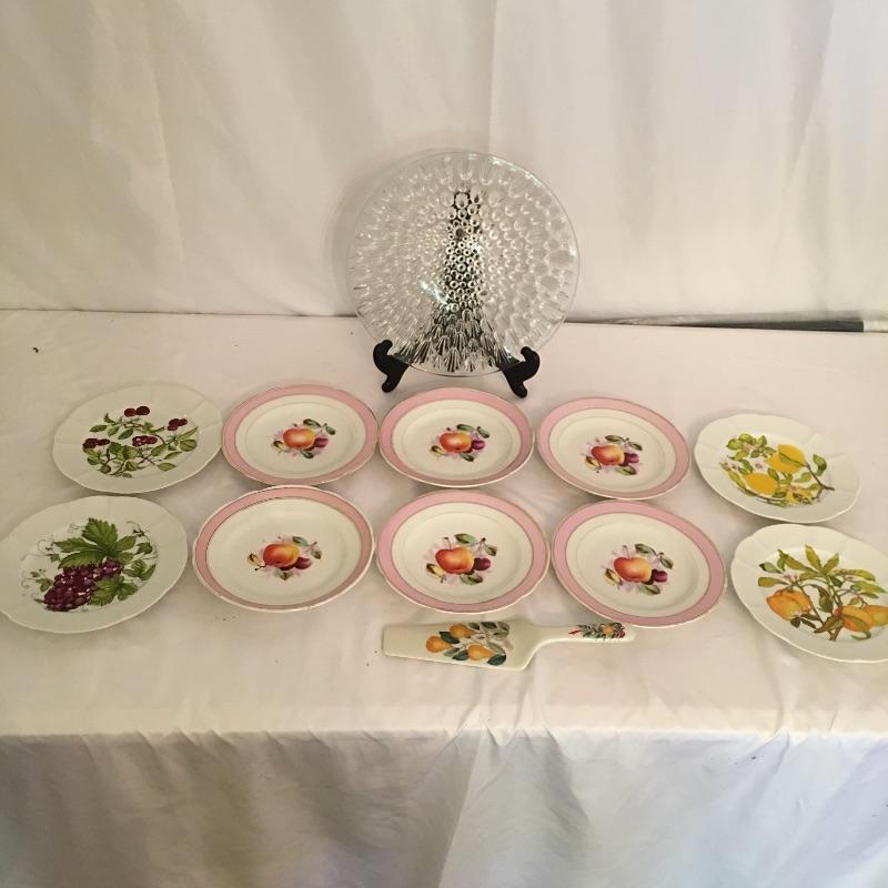 Assortment of plates with fruit design six with pink border measure 7.50” and four with a variety of fruits measure 7.75”. Also includes Cake Serving Piece and a larger glass plate with dazzling design that the pictures don’t do justice too.