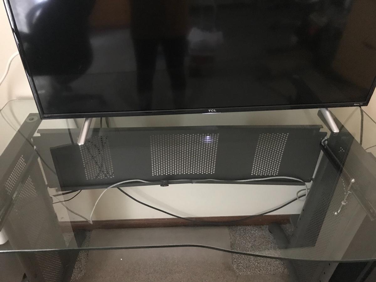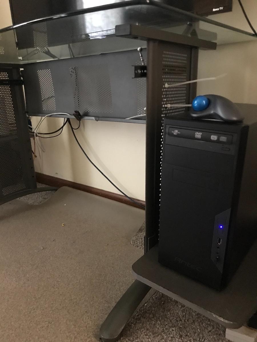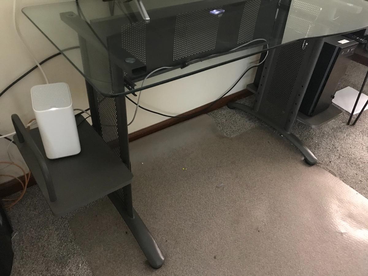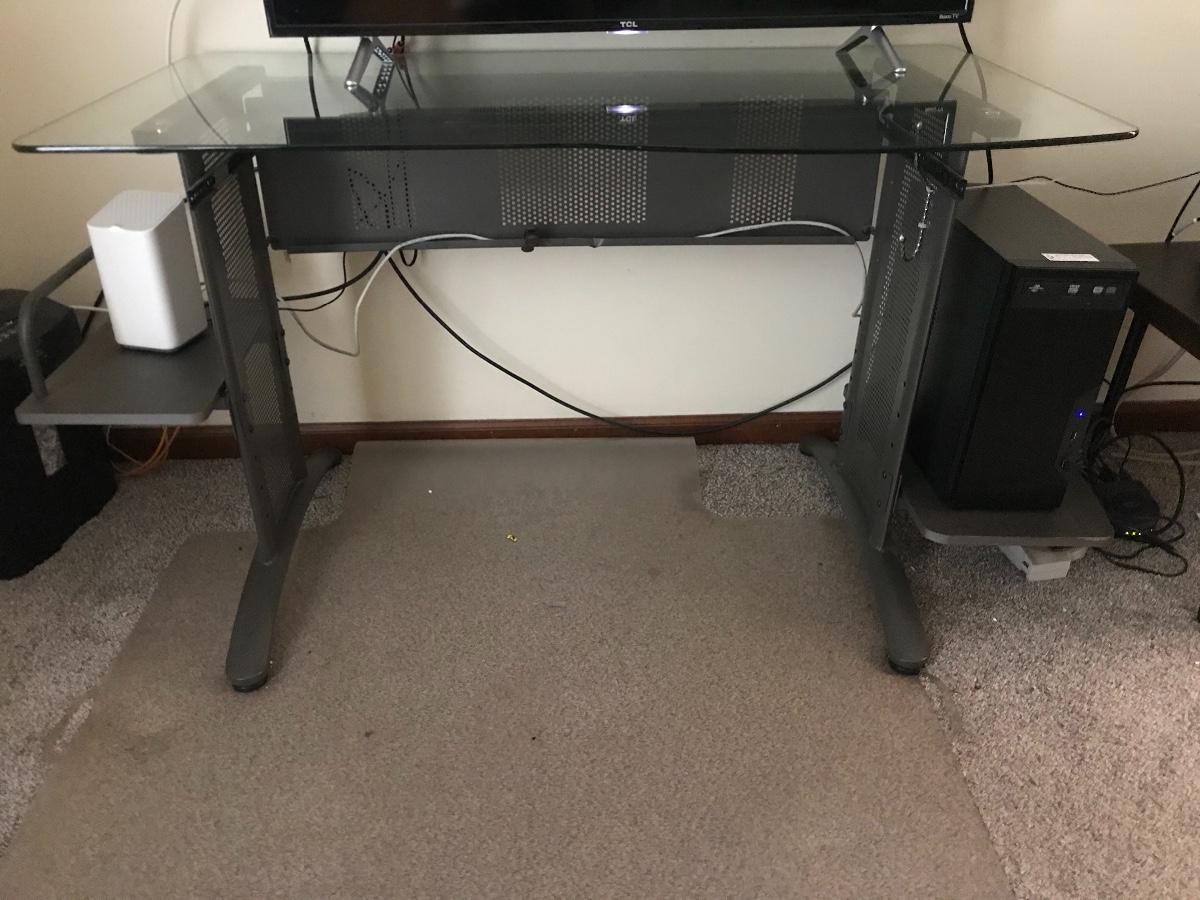 Glass top and metal legs. Side extensions for computer. 46.5x25x29 high. With extensions it is 59 inches long.