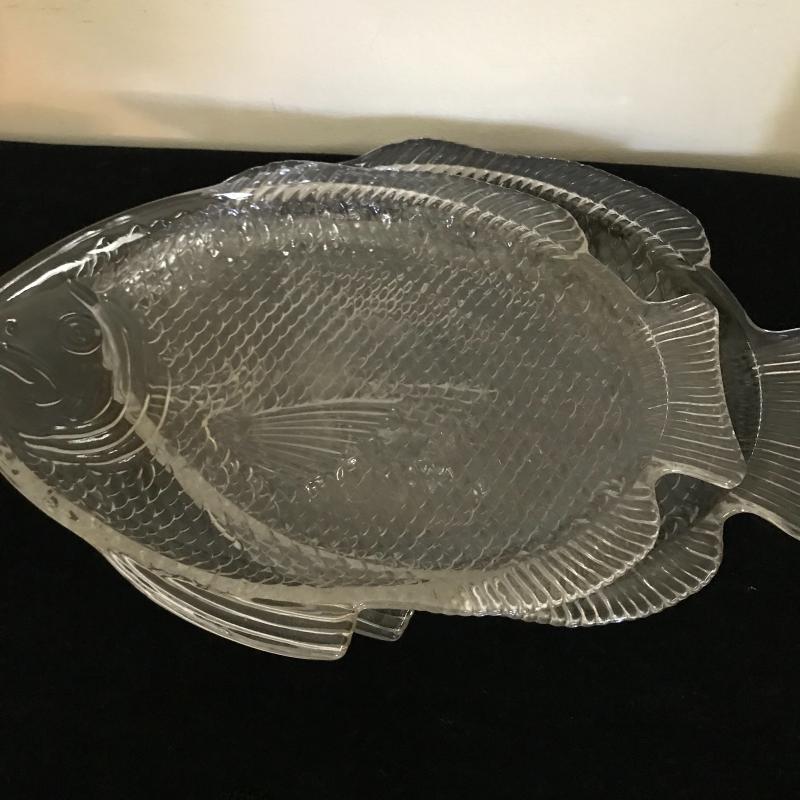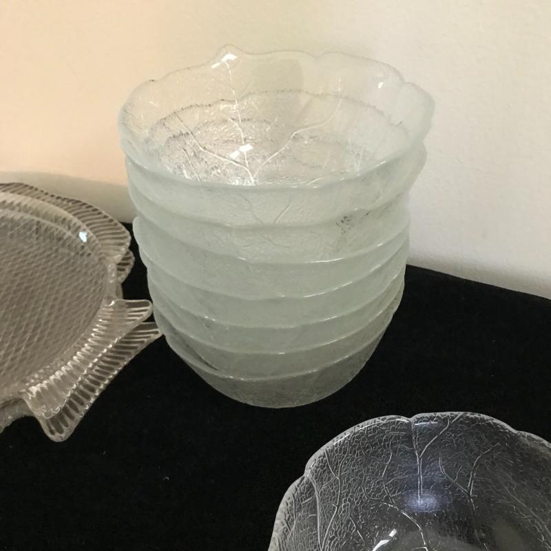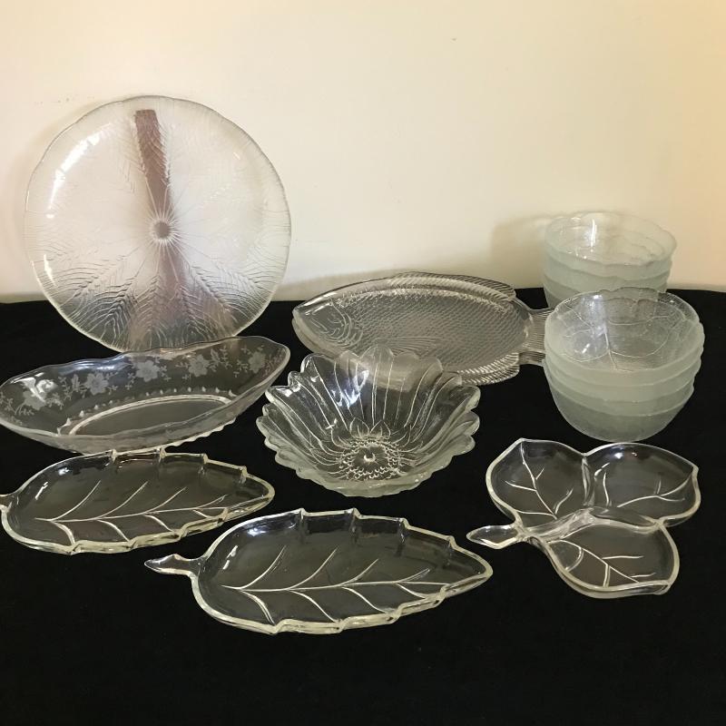 Lot contains 16 glass service pieces including eight cabbage leaf bowls, matching leaf dishes, and matching fish plates. See pics. No shipping available. Local pickup only in Hendersonville, NC.