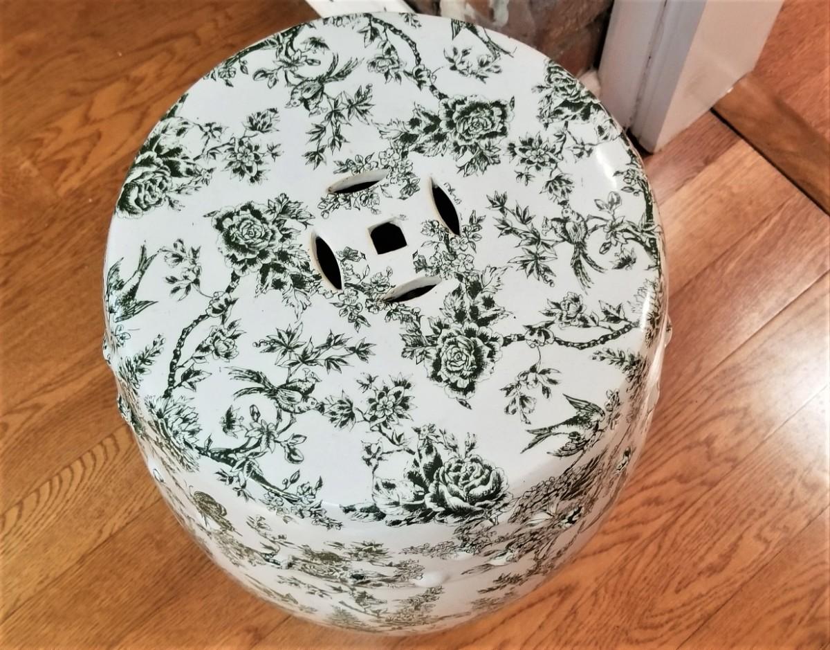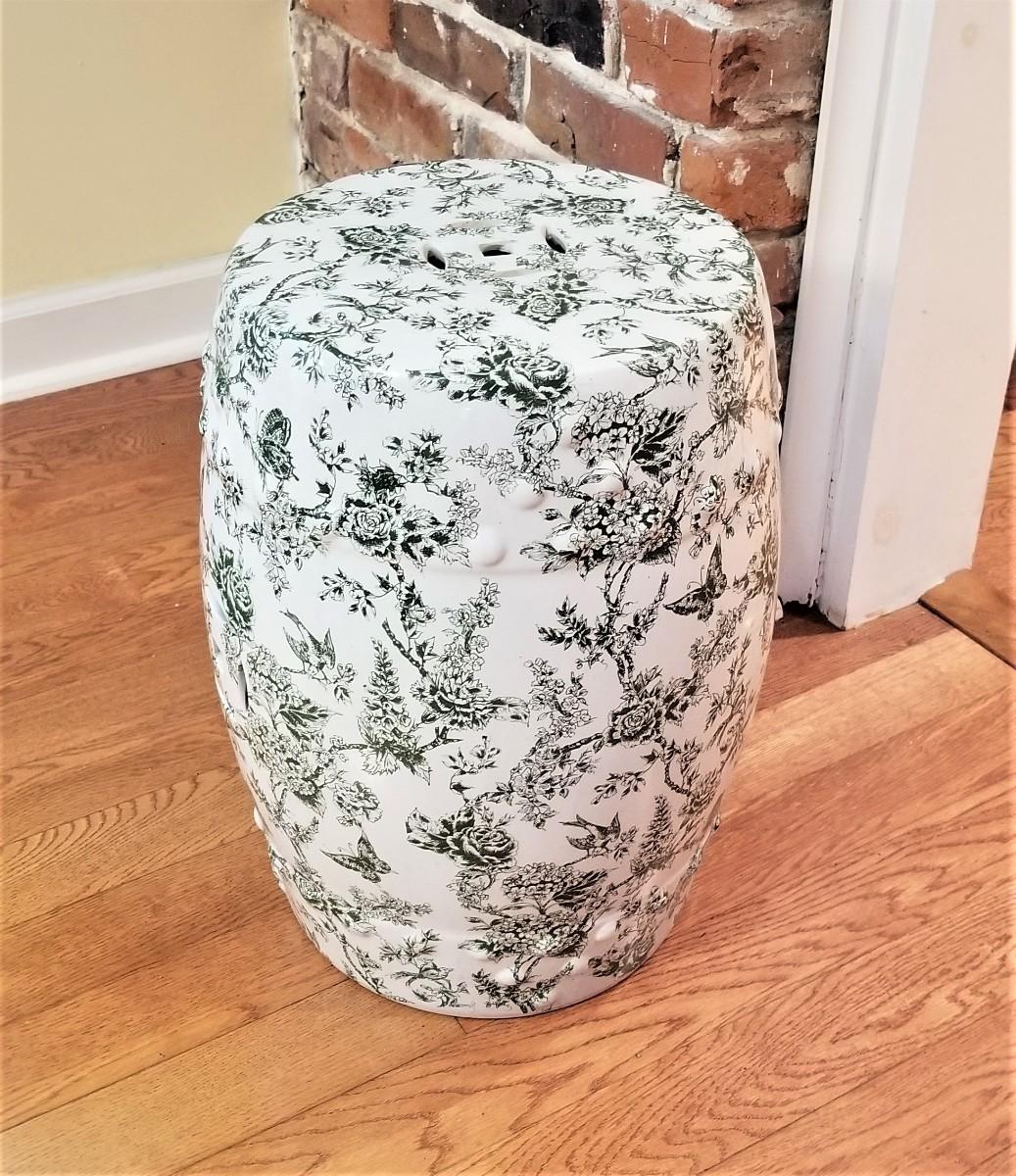 So pretty - green/white Asian style ceramic Garden Seat. 11" across, 18" tall - good condition.