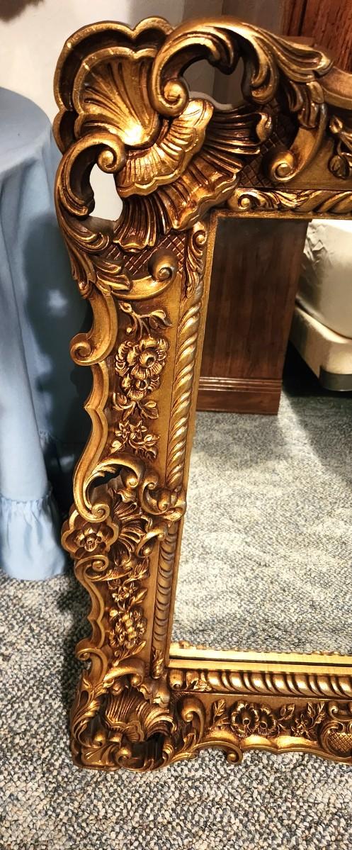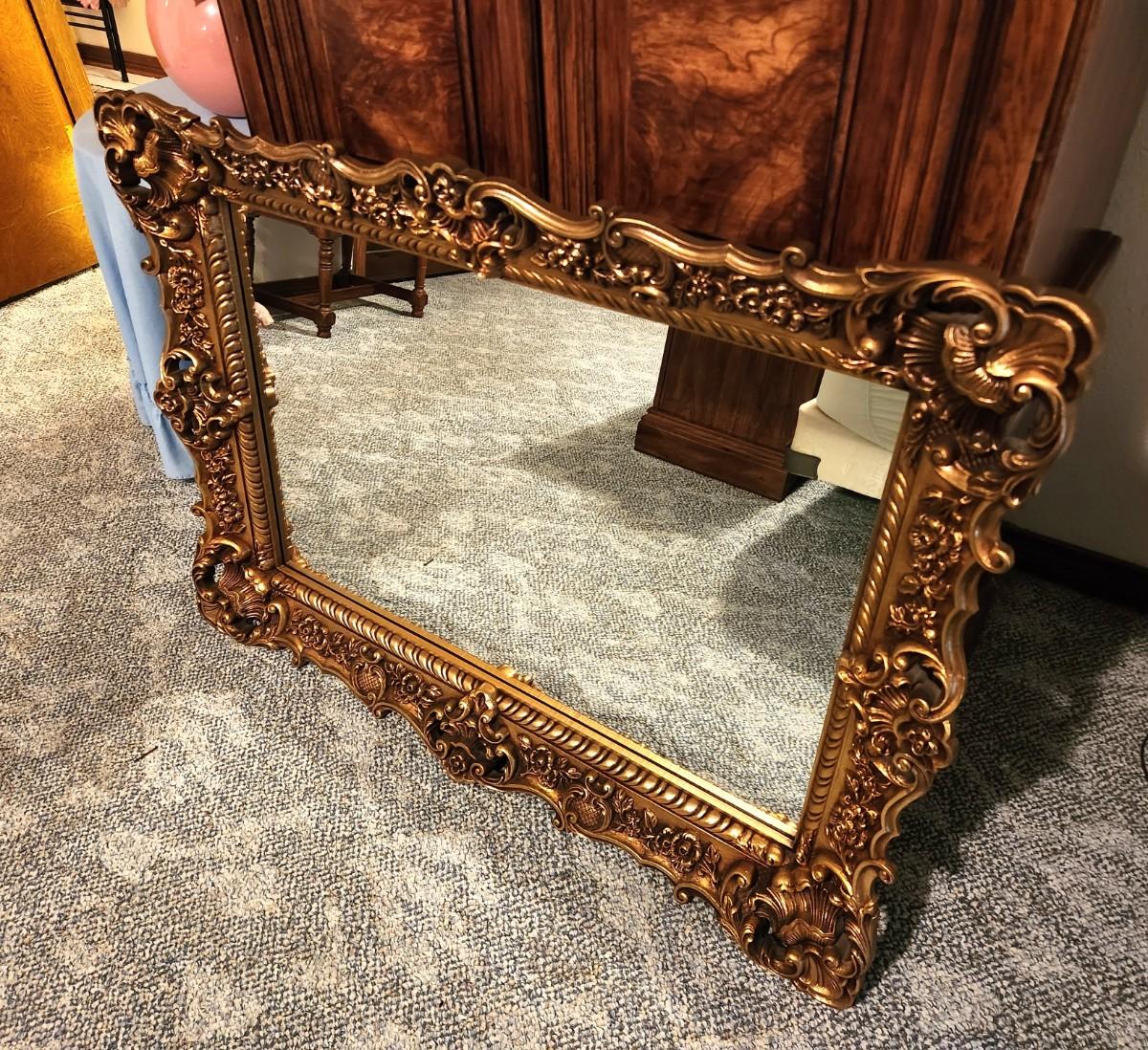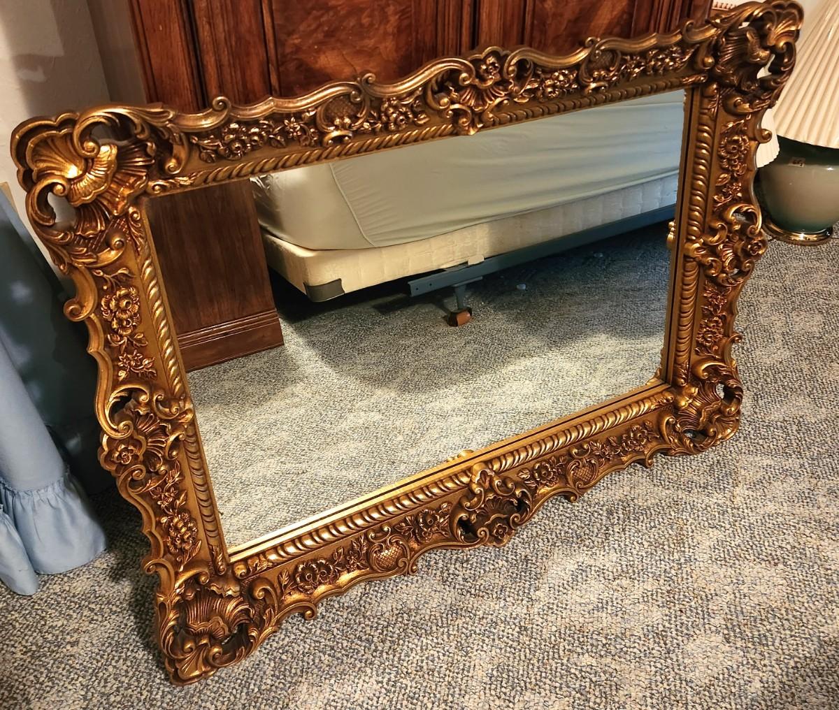 Heavy vintage wall mirror with a secret - frame is plastic ! -5" border! 32" tall, 44" across - looks good.