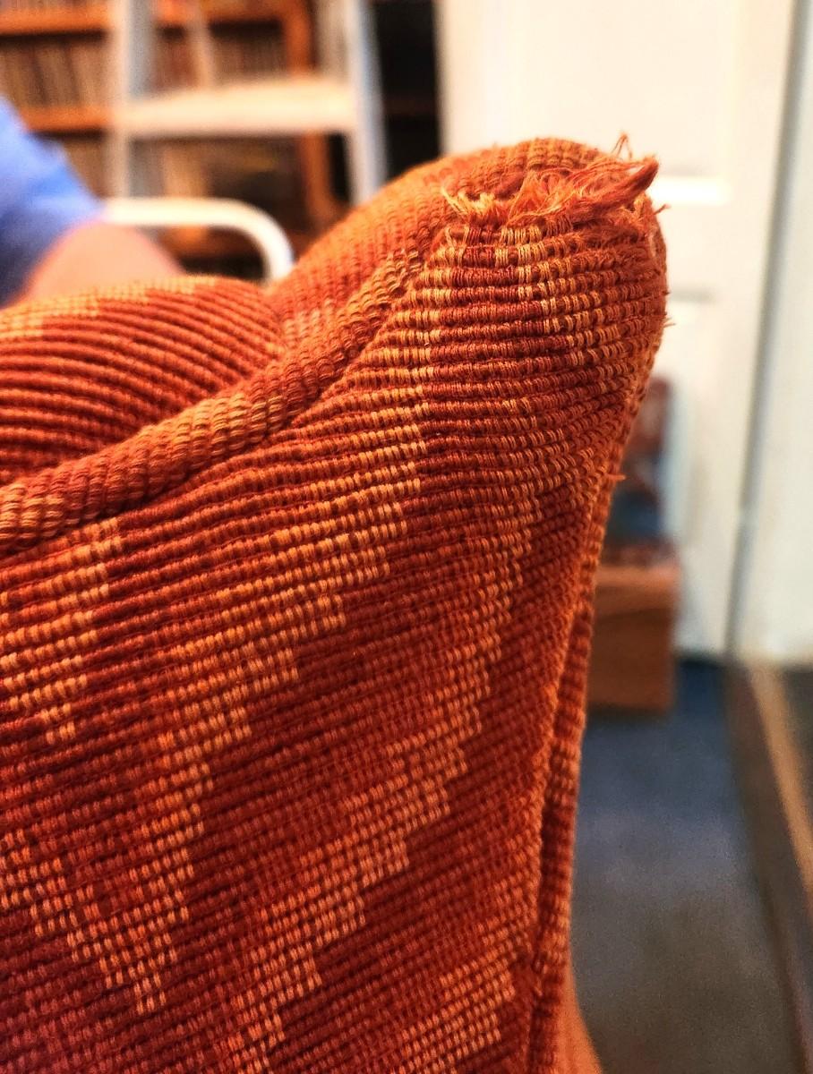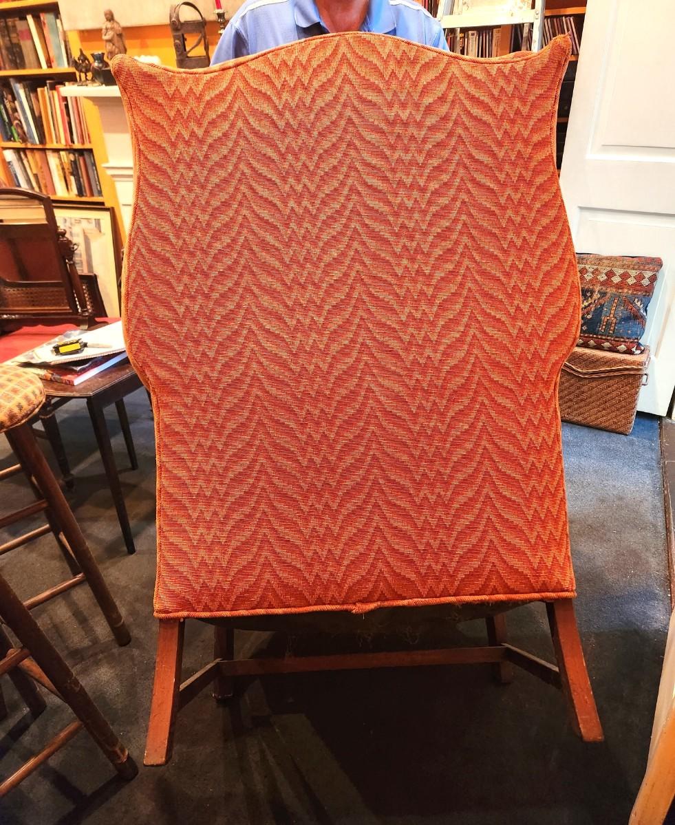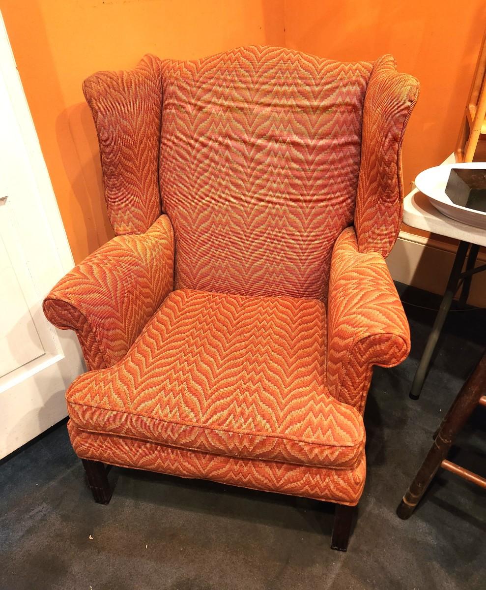 Heavy upholstered Winged Back Chair - solid - quite comfy. No maker noted. One small place on the back where the fabric got caught and "pulled" a bit. 42" tall, 27" deep. Upholstery on the "wings" needs a cleaning.